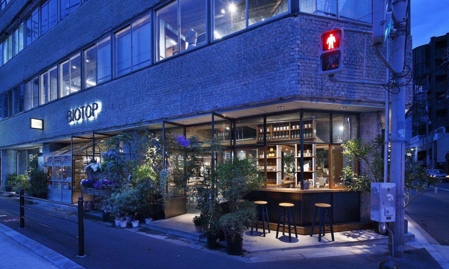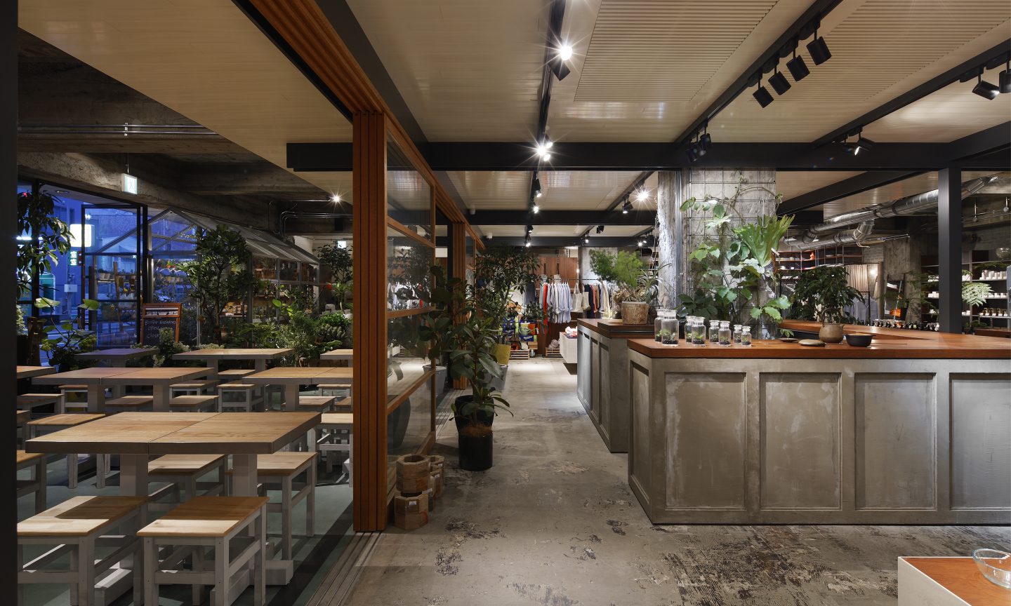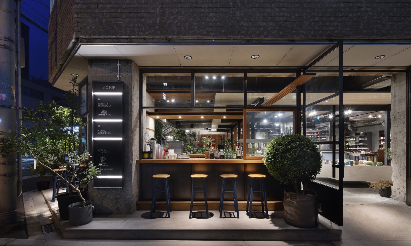 BIOTOP (the name suggests a space enclosing a living ecosystem) is a mixed-use concept shop. The existing three-storey building’s ground, first and rooftop floors have been redesigned. The Minami-Horie neighborhood was traditionally home to furniture making, and became an Osaka fashion center. More recently, large-scale retail buildings erected around the Umeda train station overshadowed the street-level commerce. The shop has reinfused the neighborhood’s energy, restoring its character as a fashion center and serving as a popular landmark.