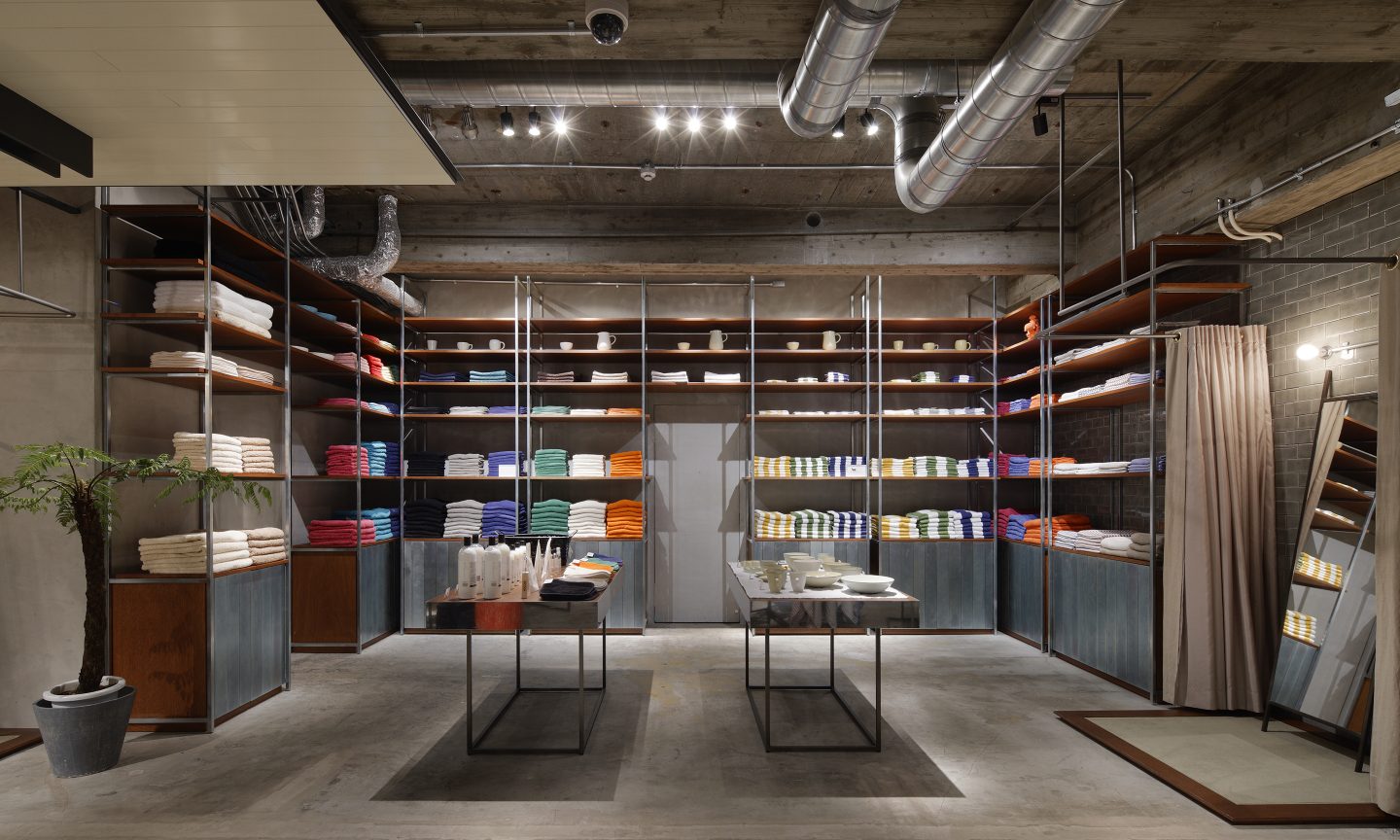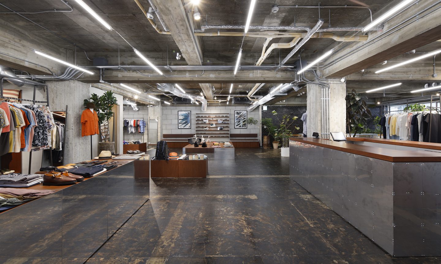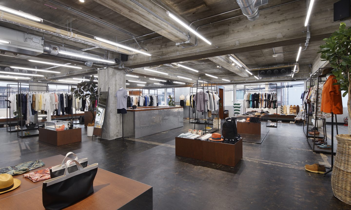 BIOTOP (the name suggests a space enclosing a living ecosystem) is a mixed-use concept shop. The existing three-storey building’s ground, first and rooftop floors have been redesigned. The Minami-Horie neighborhood was traditionally home to furniture making, and became an Osaka fashion center. More recently, large-scale retail buildings erected around the Umeda train station overshadowed the street-level commerce. The shop has reinfused the neighborhood’s energy, restoring its character as a fashion center and serving as a popular landmark.