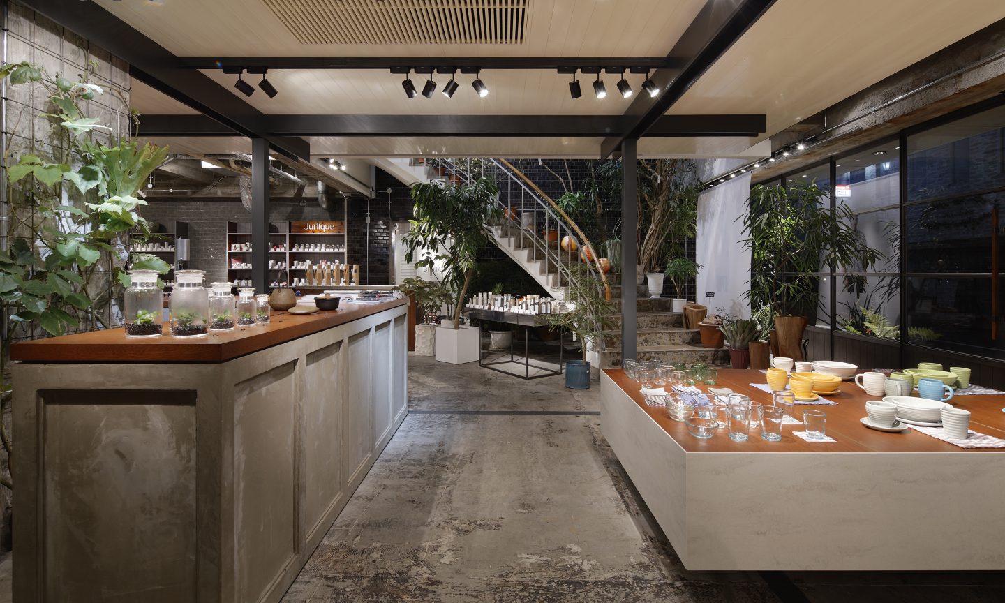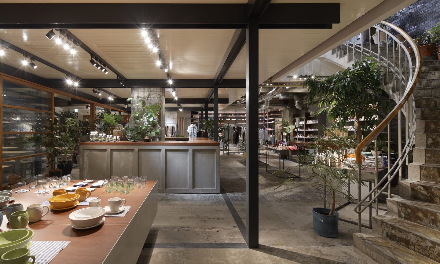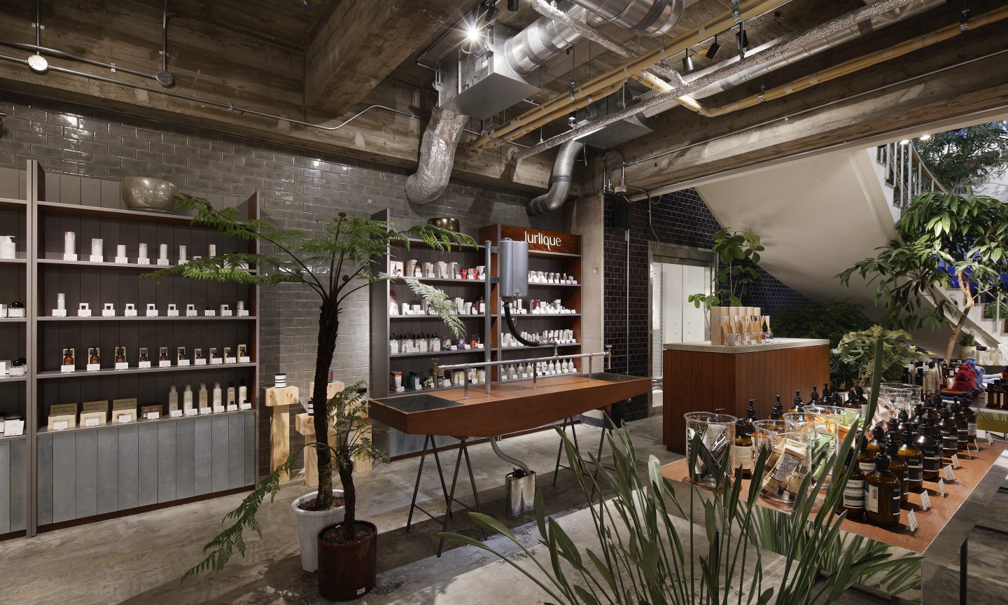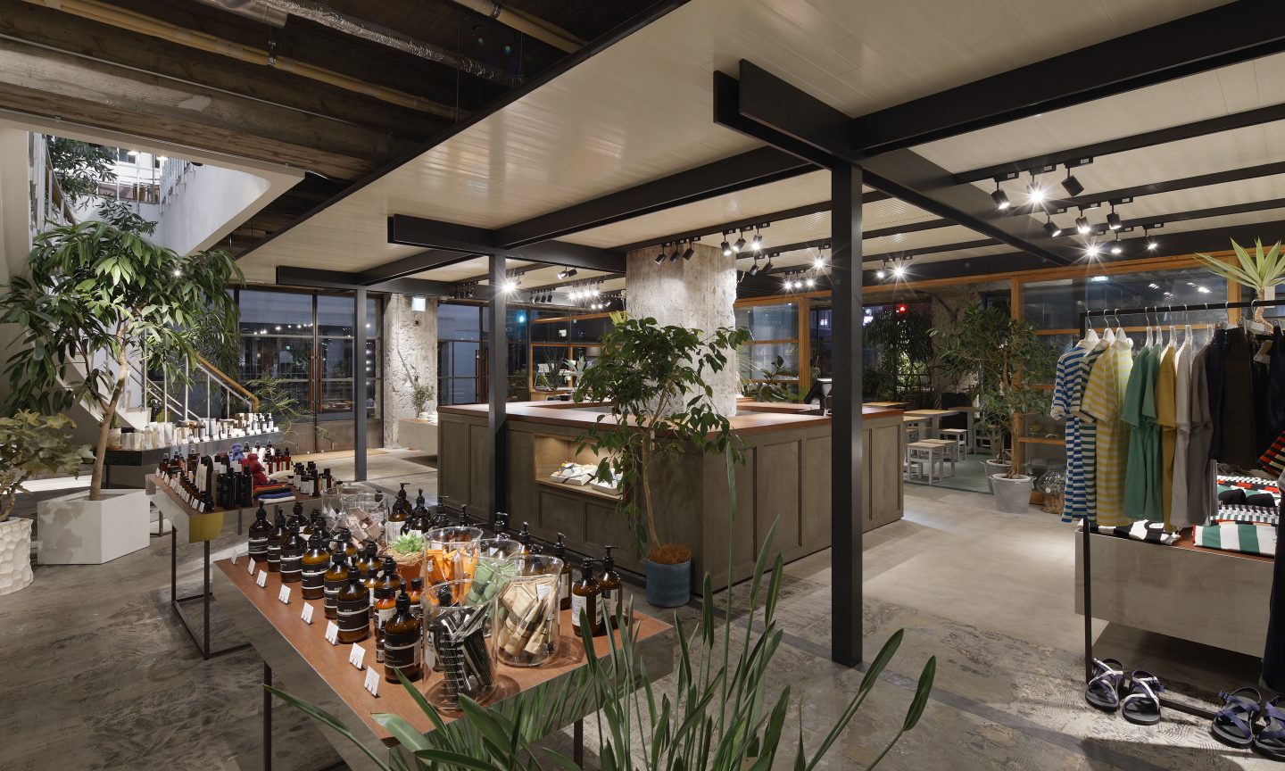 The ground floor is suffused with the lush green of the botanical shop. The café adjoins the street corner and invites interaction. The ground and first floors are devoted to clothing, personal care, and lifestyle interests, and the rooftop is a foliage-filled restaurant. The interior was designed to be a “junction with the cityscape”. Not intended so much as containment, it is a series of built spaces that intersect the urban landscape to form a seamless passage from inside to everywhere, the private to the public, the green bounty of nature to the larger world.