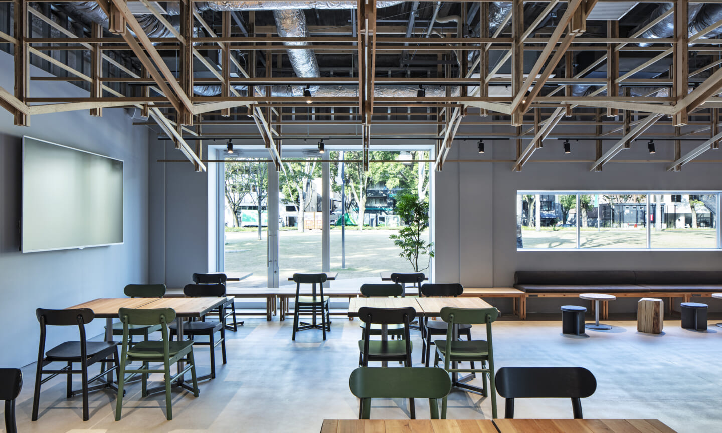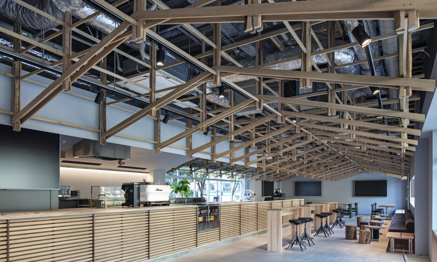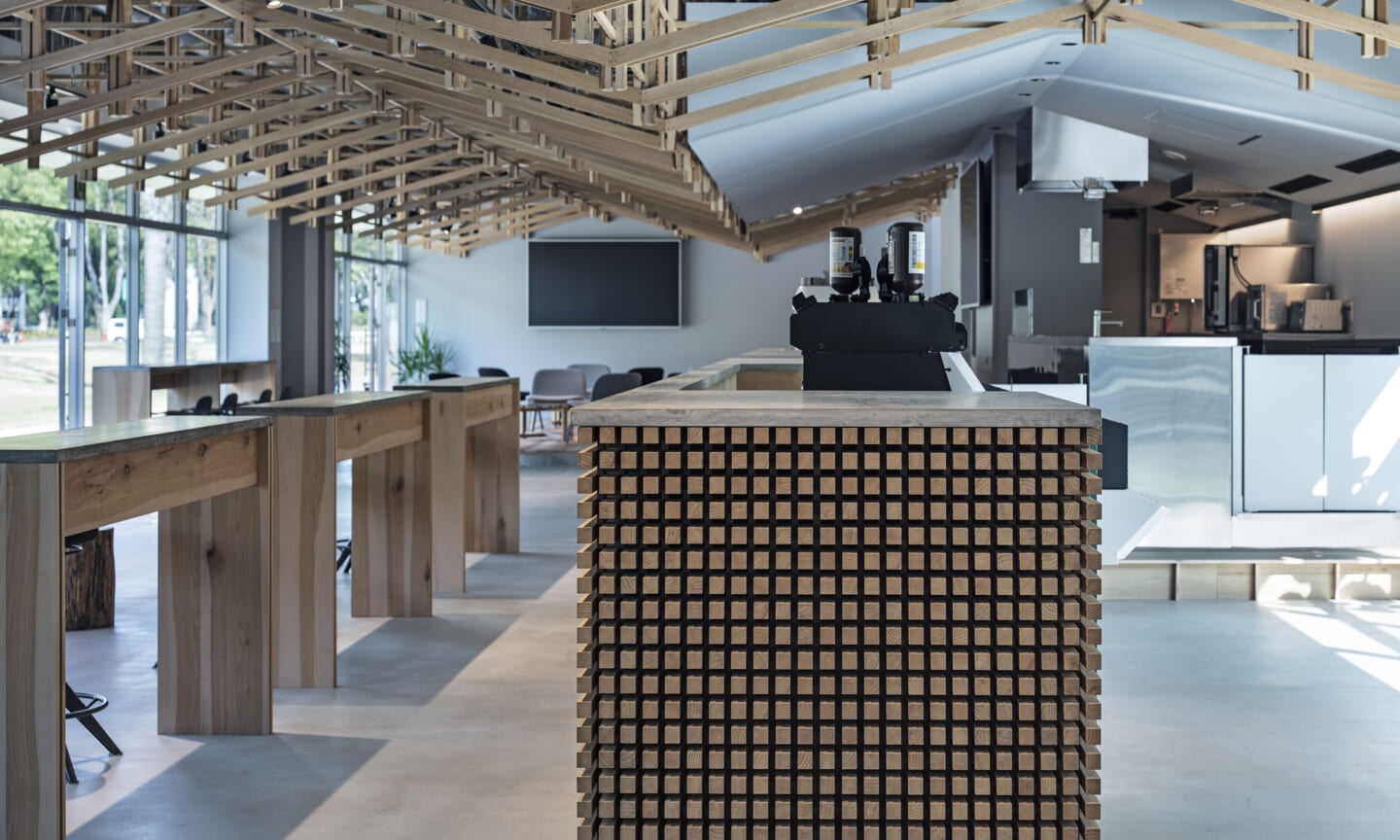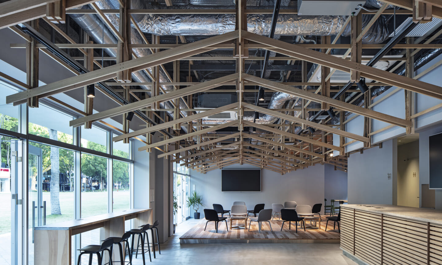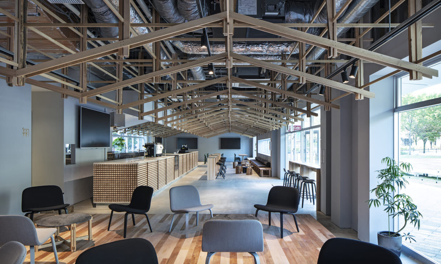 落ち着くことや開放的で気持ちいいなどを感じるのはどんな時だろうか?大きい、小さい、狭いや広いという、空間のスケール感によるものだとおもっている。 今回四角い工業的な空間を木架構によってぼやかし、まるで公園の東屋にいるような、もしくは、大きな木のしたで木陰から明るい外を眺めるような居心地のよい空間へと変化させ、公園へと繋がる開放感を目指した。