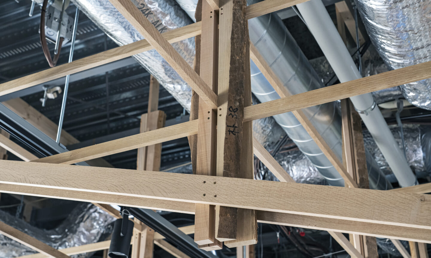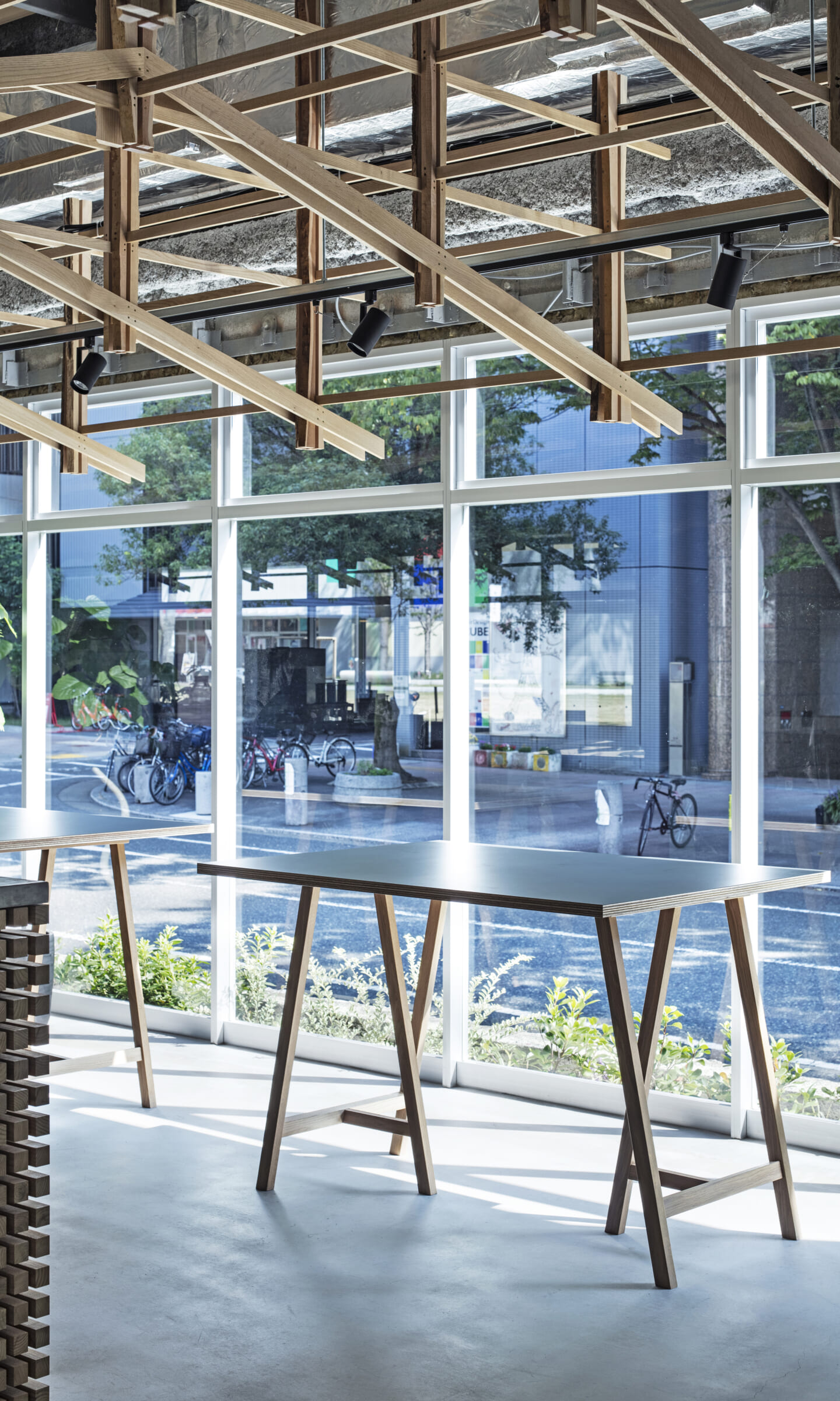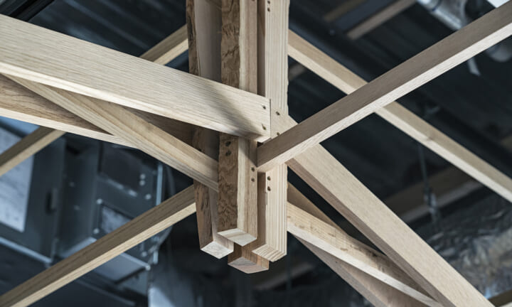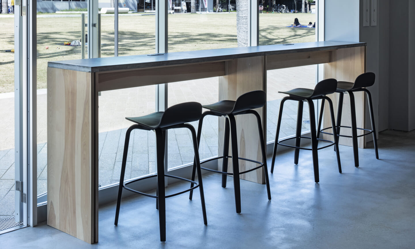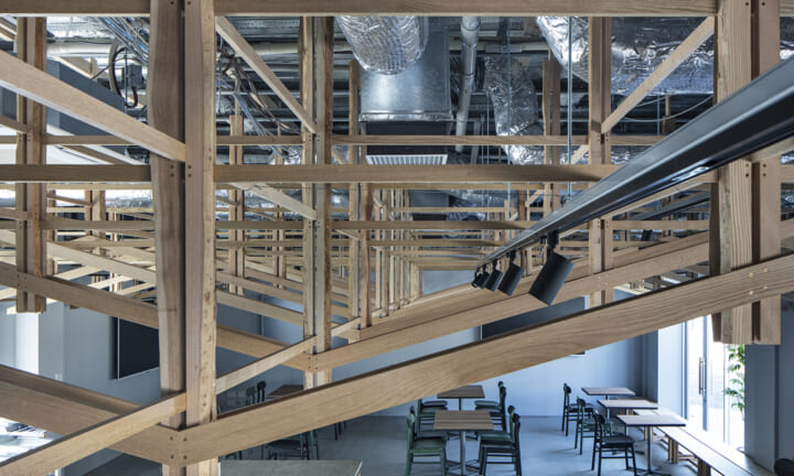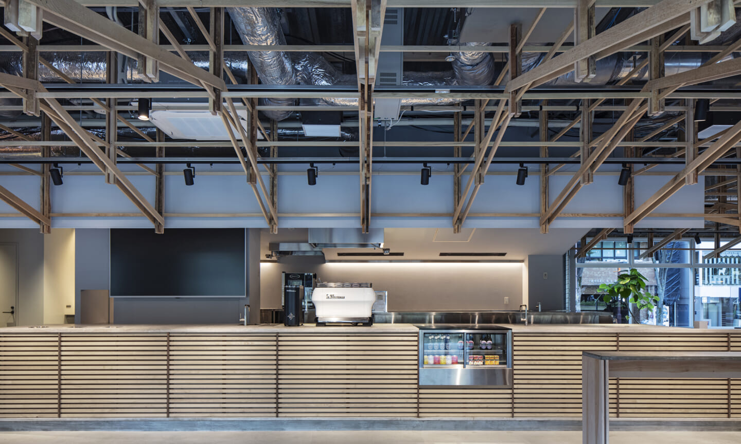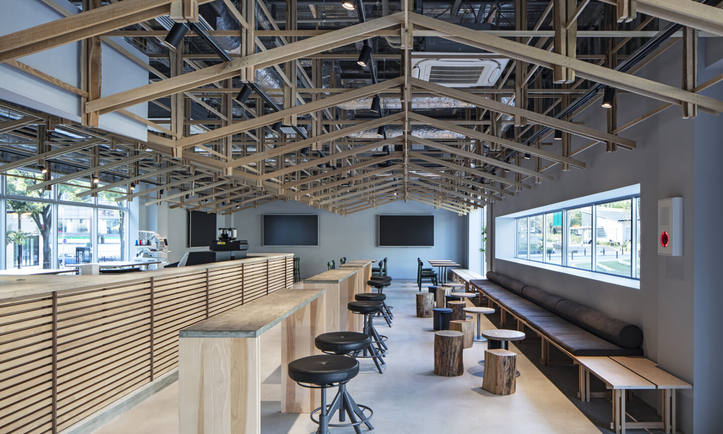落ち着くことや開放的で気持ちいいなどを感じるのはどんな時だろうか?大きい、小さい、狭いや広いという、空間のスケール感によるものだとおもっている。 今回四角い工業的な空間を木架構によってぼやかし、まるで公園の東屋にいるような、もしくは、大きな木のしたで木陰から明るい外を眺めるような居心地のよい空間へと変化させ、公園へと繋がる開放感を目指した。