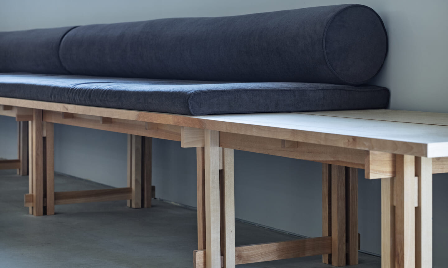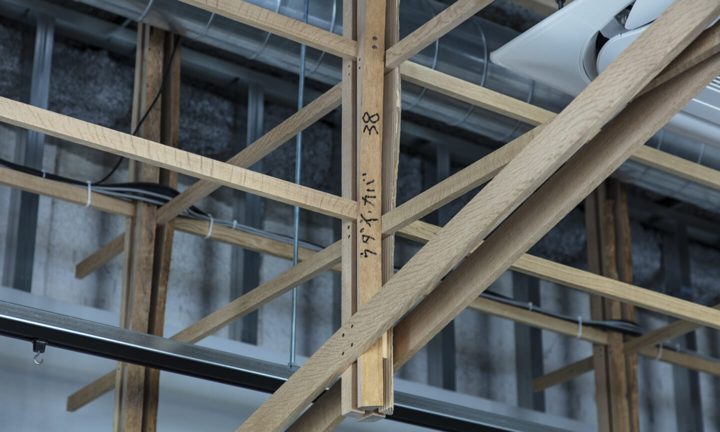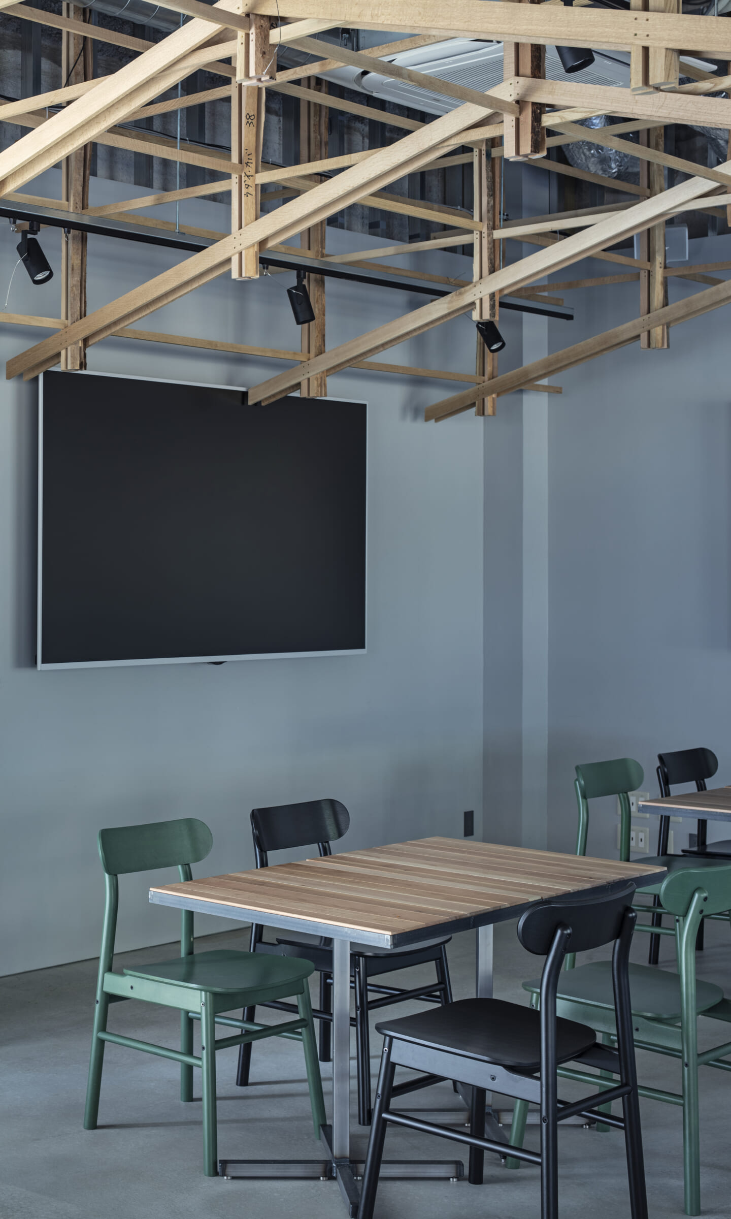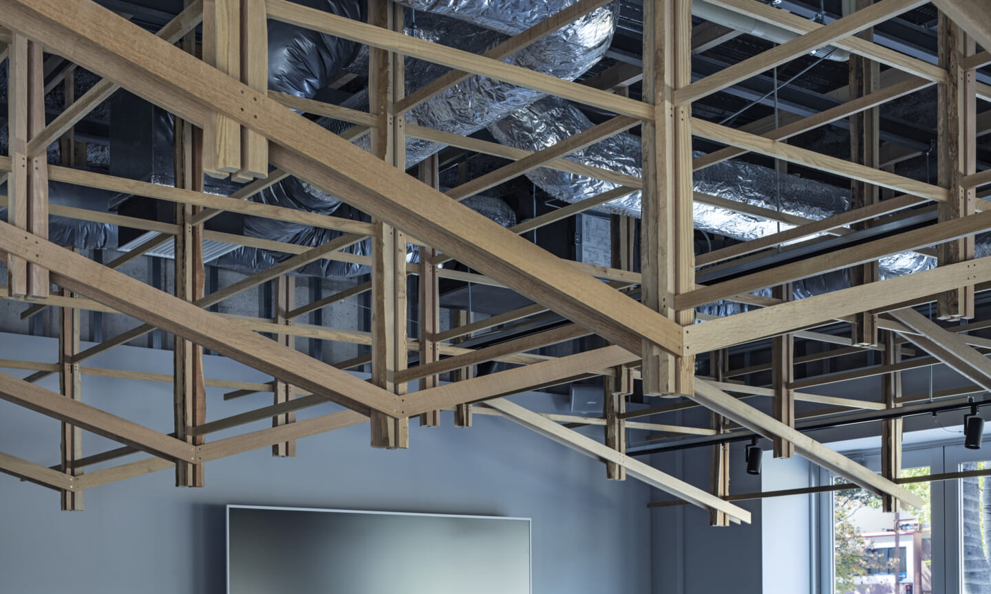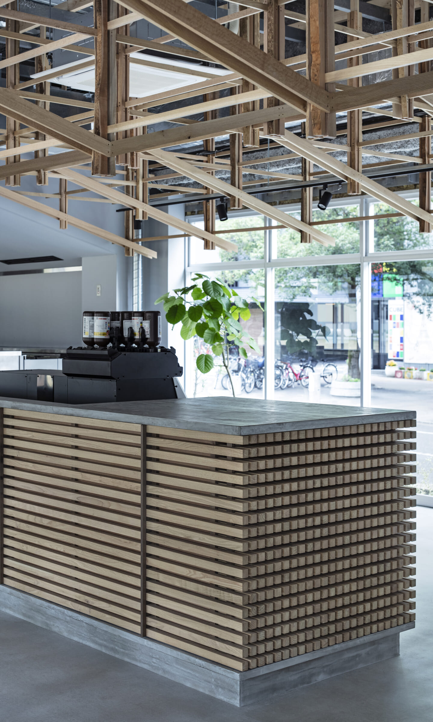 落ち着くことや開放的で気持ちいいなどを感じるのはどんな時だろうか?大きい、小さい、狭いや広いという、空間のスケール感によるものだとおもっている。 今回四角い工業的な空間を木架構によってぼやかし、まるで公園の東屋にいるような、もしくは、大きな木のしたで木陰から明るい外を眺めるような居心地のよい空間へと変化させ、公園へと繋がる開放感を目指した。