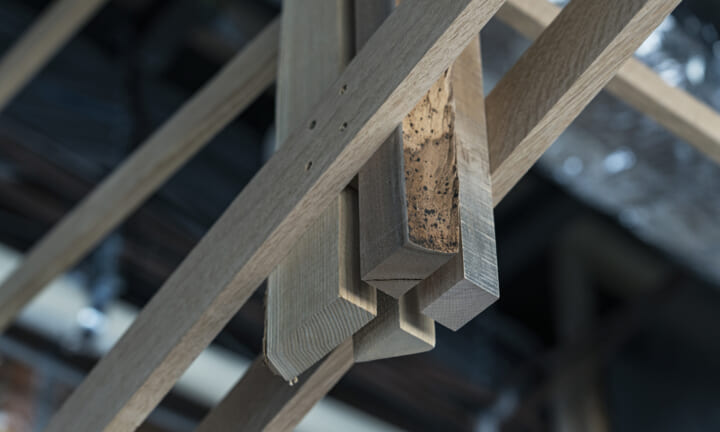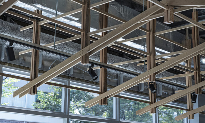 小径木で構成した木架構で屋根をつくることで、カフェに滞在する人の意識を公園側につなげたいと考えた。