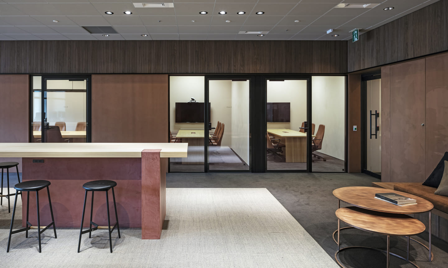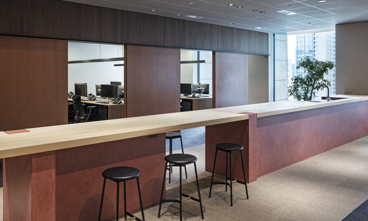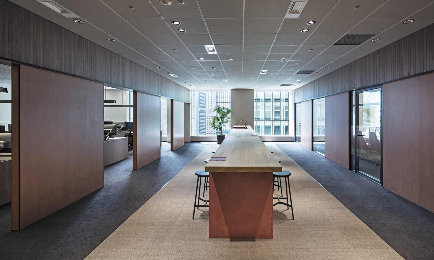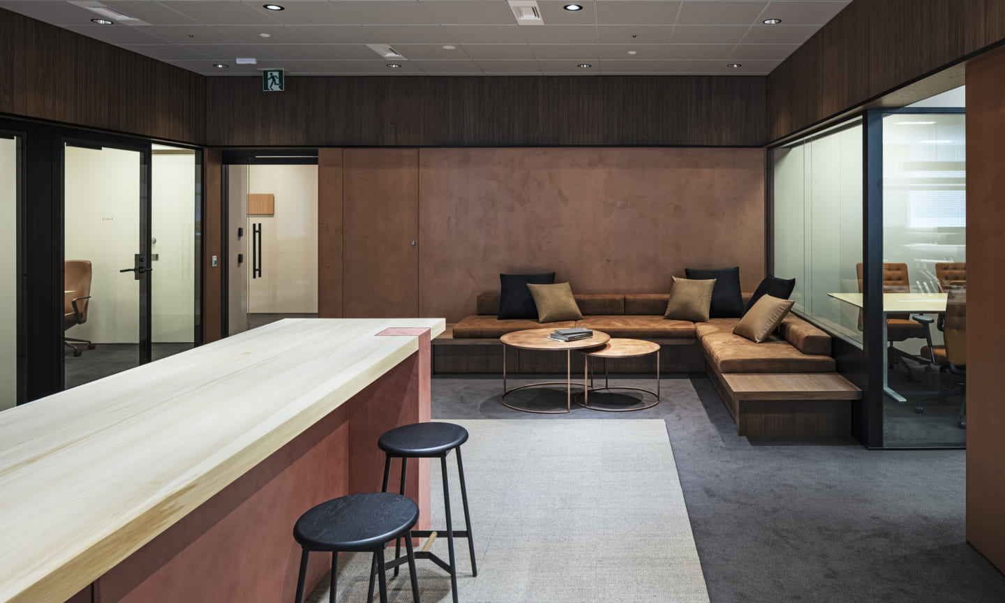 People gather and communications happen as a result of placing a courtyard. Yet being an office interior, the space has depth within it.