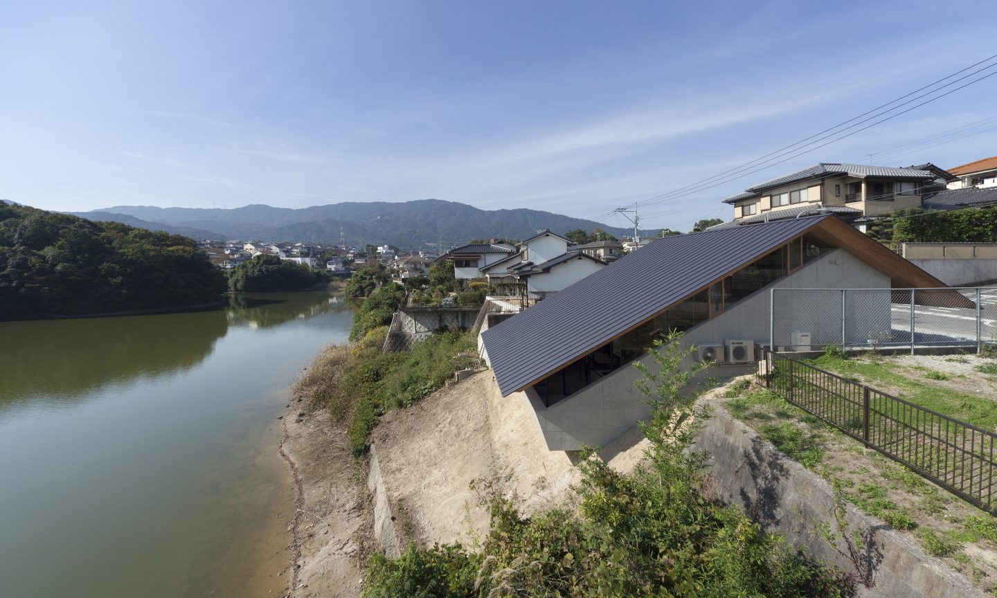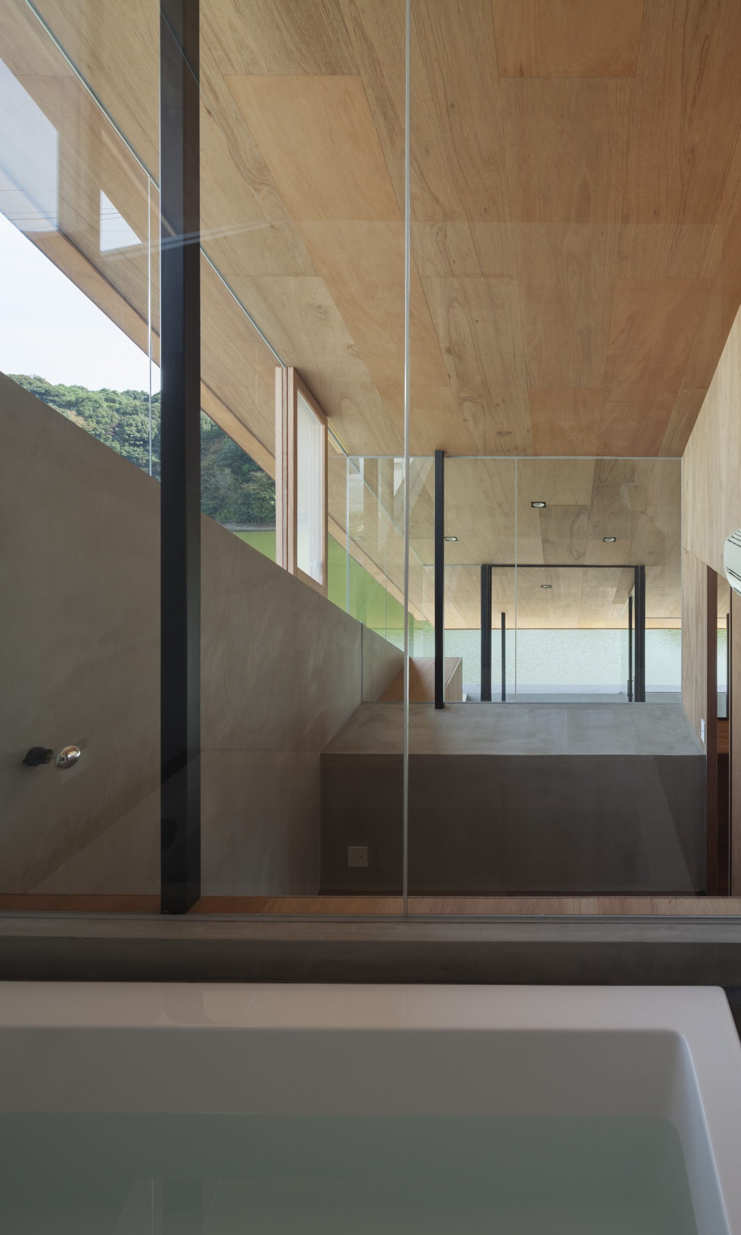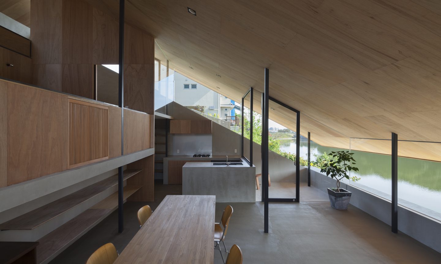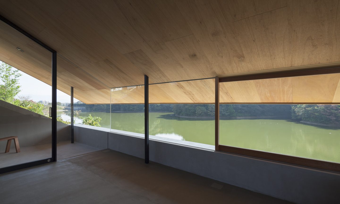 The plan called for a residence on a deep slope adjoining a reservoir in Fukuoka, for a family of four. In this environment trees and flowers grow in abundance, and here too, local wildlife of every variety regularly happen by and peer in. It’s a setting in which one can simply stand still and dwell at length on the enduring force of nature. Here the act of placing a roof over the site engages ideas of both enclosure and liberation.