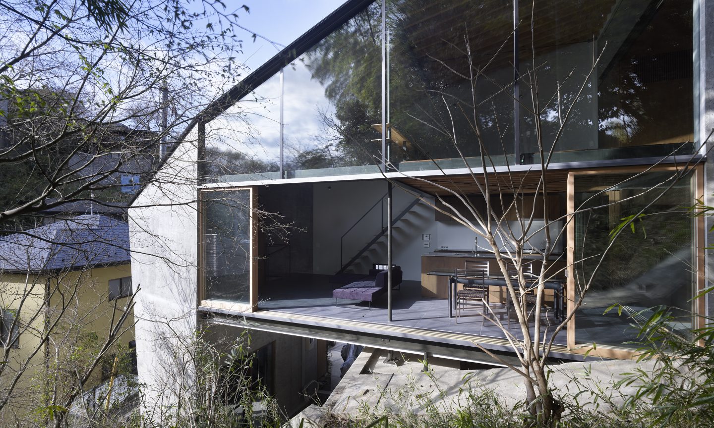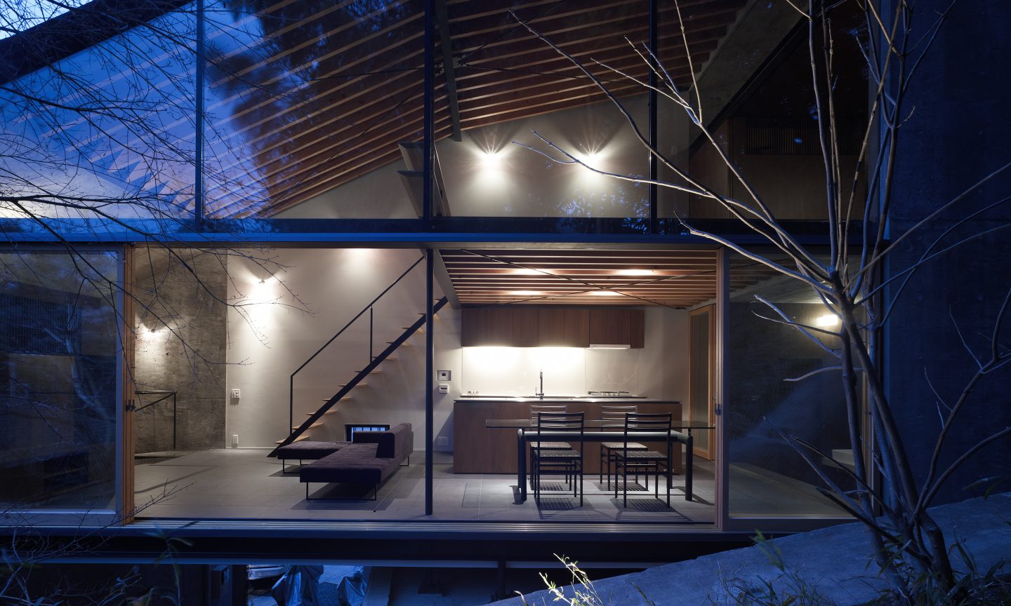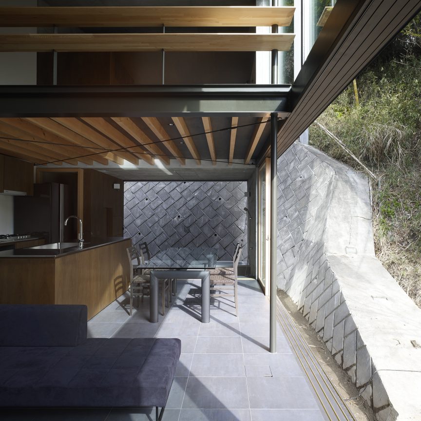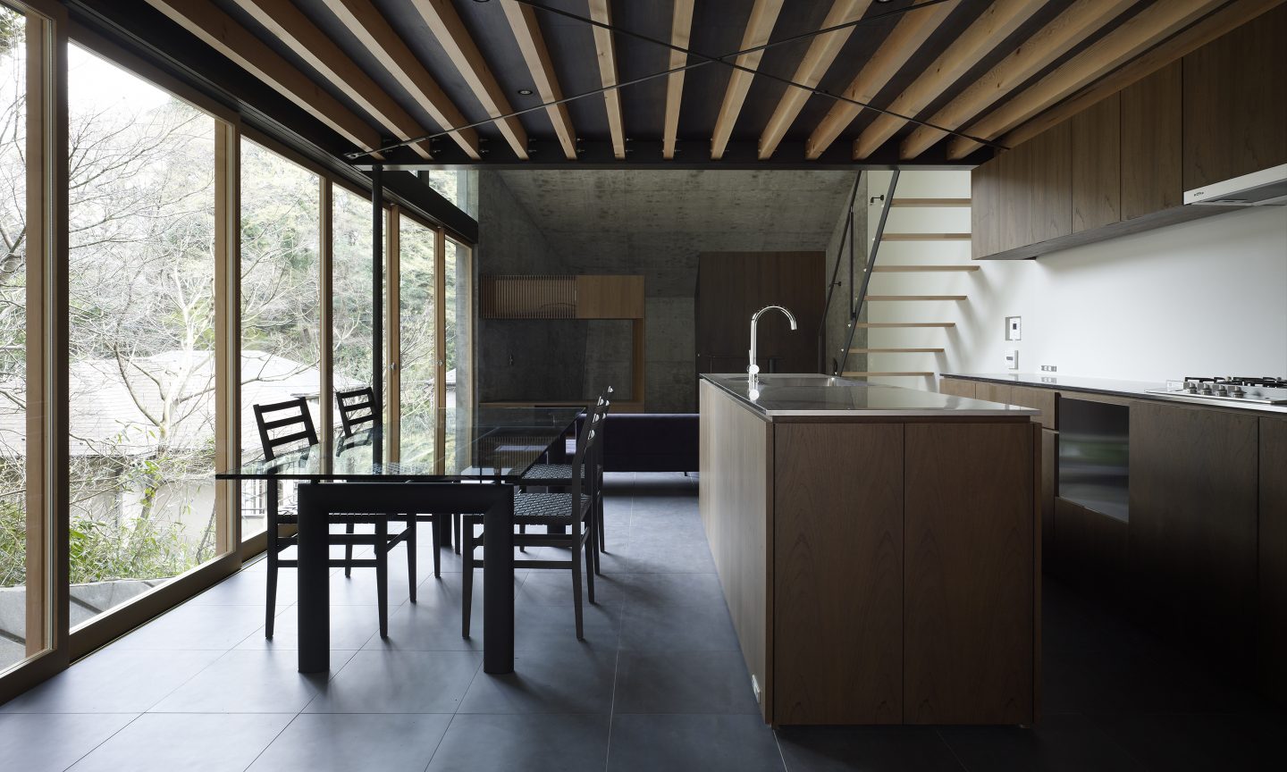 The project embraced its personality by simple means. A site with wildly uneven grades is akin to building on a river. Concrete bridge pillars were sunk at the upper and lower levels, and steel beams suspended between them. Building on a river typically presents myriad other difficulties, and thus, we sought to minimize the installation. Less drilling and excavating reduced the amount of the site that was displaced, along with the need for disposal, and consequently minimized the impact on support levels. On the sturdy concrete pier level of the bridge formed, we designed a traditional Japanese-style room, a study, bedroom and bath facilities. On the upper tier, which corresponds to the bridge girder level, we built a steel-framed open plan that includes living room, dining room, and kitchen.
