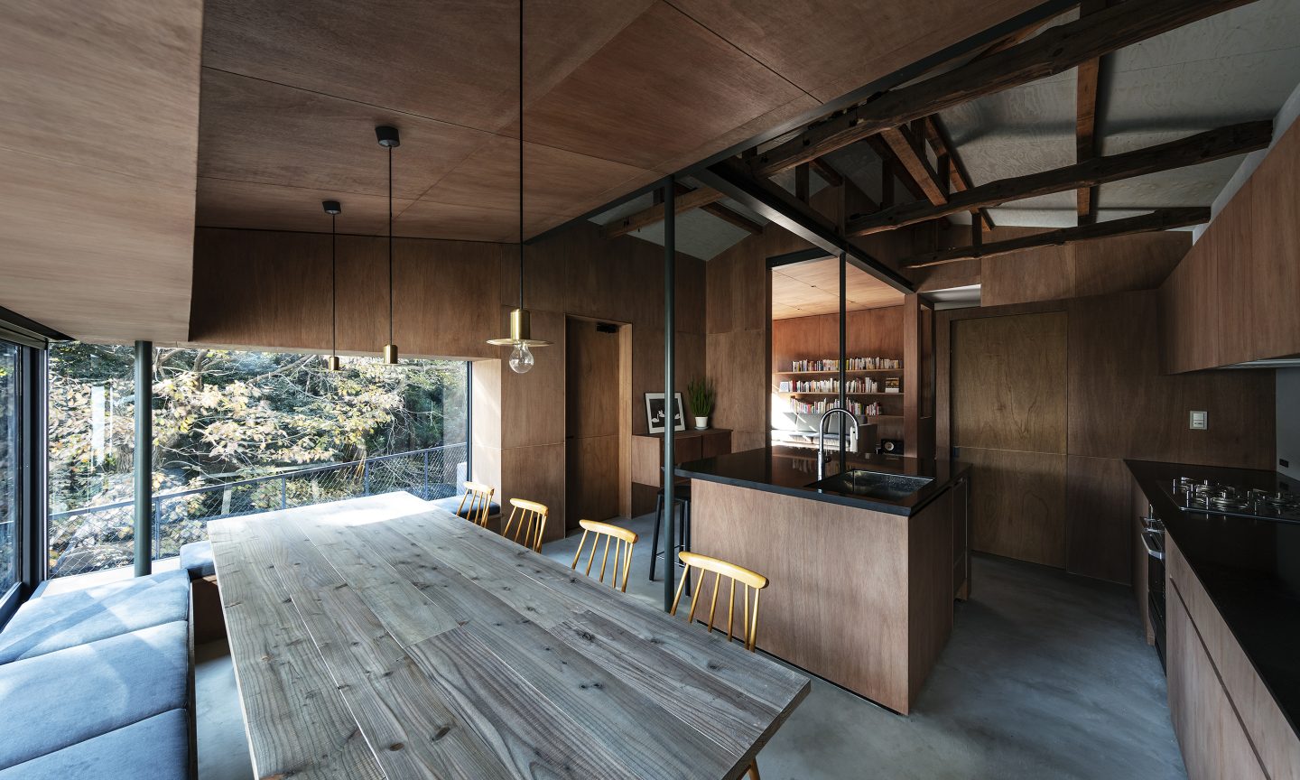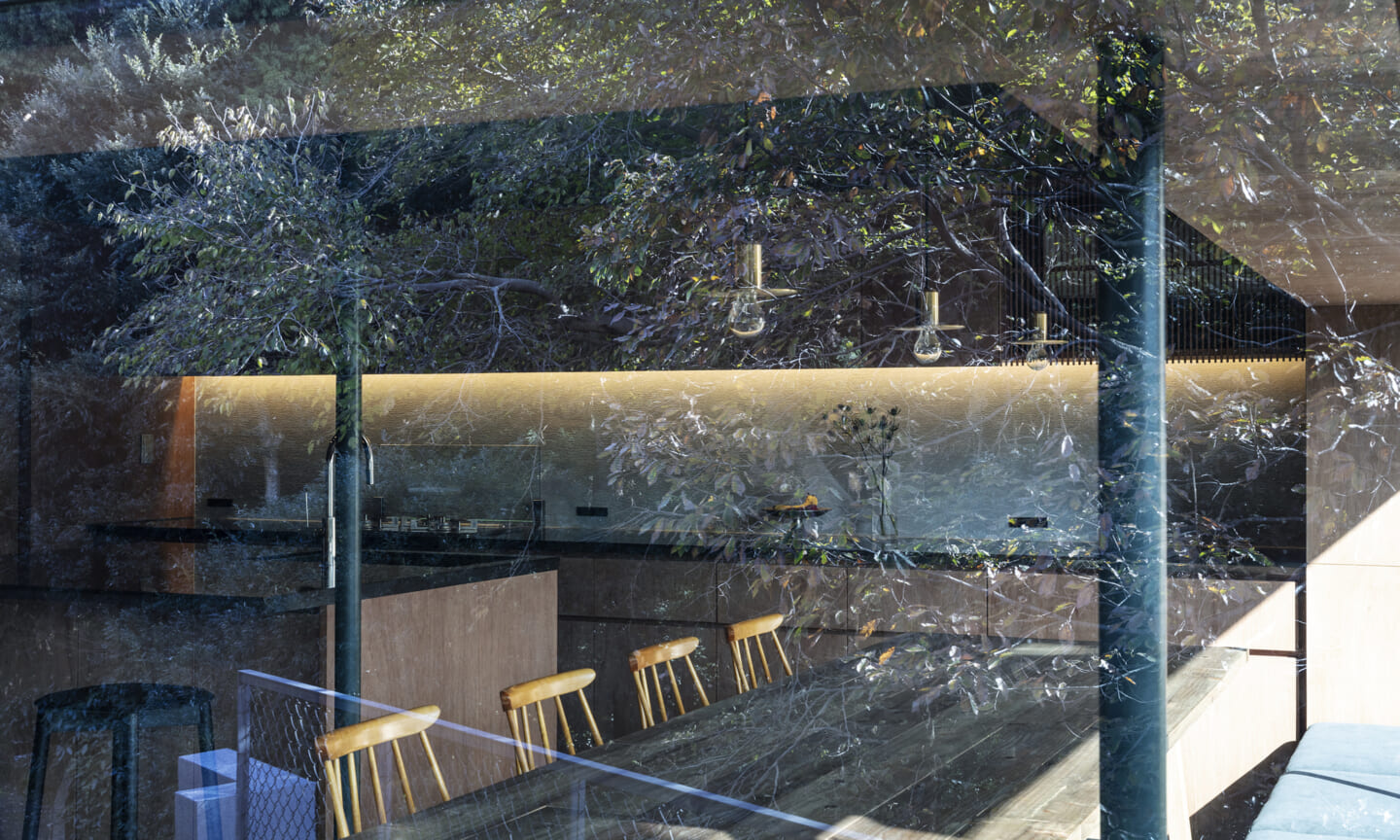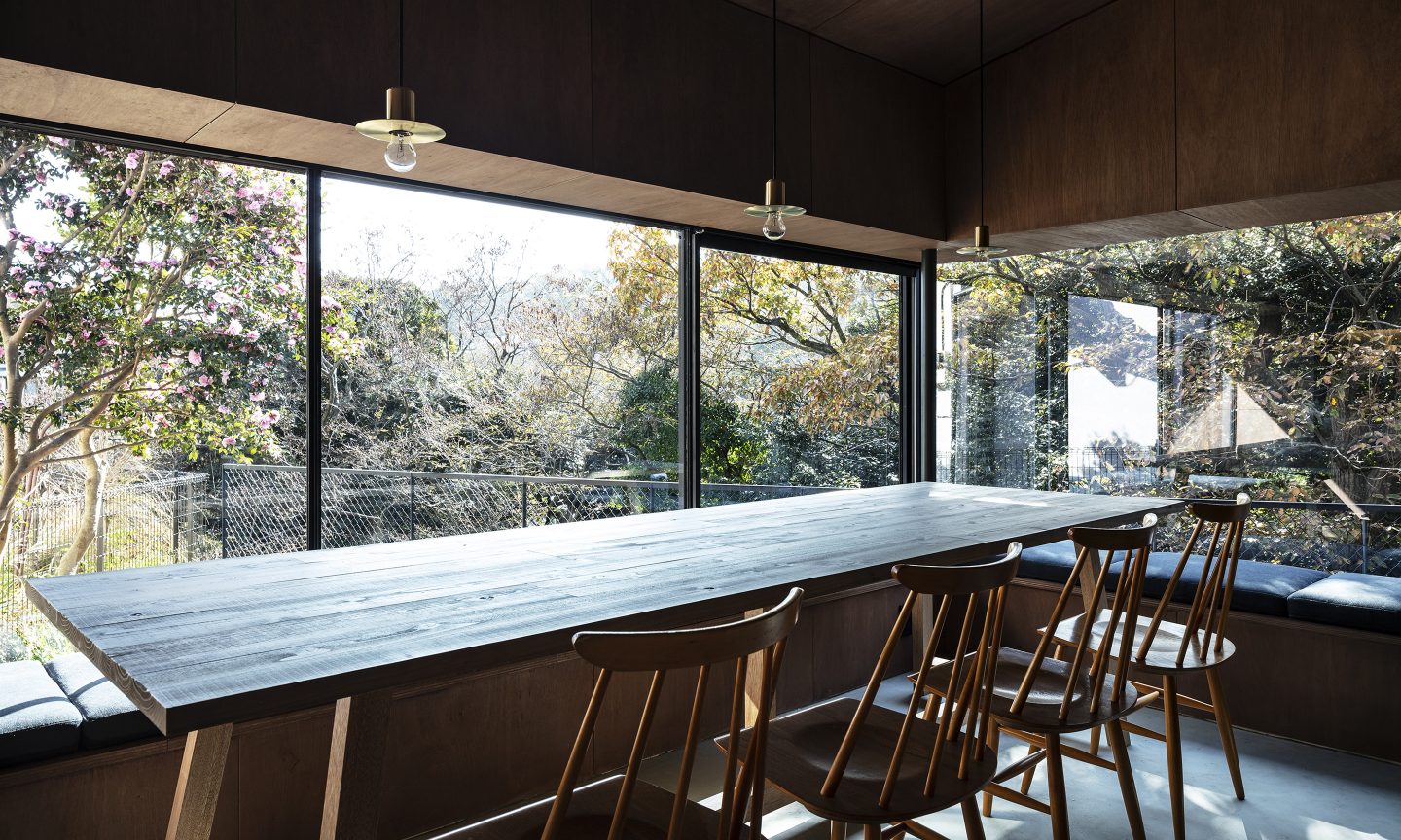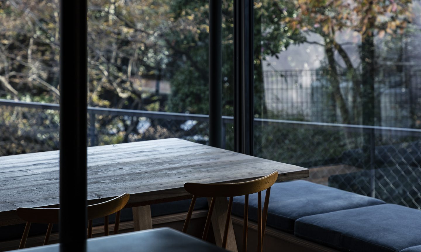 The bench in the kitchen reflects the seasonal change like a picture frame. Framing out the colours of forests and mountains, the place for a family blends into the scenery.