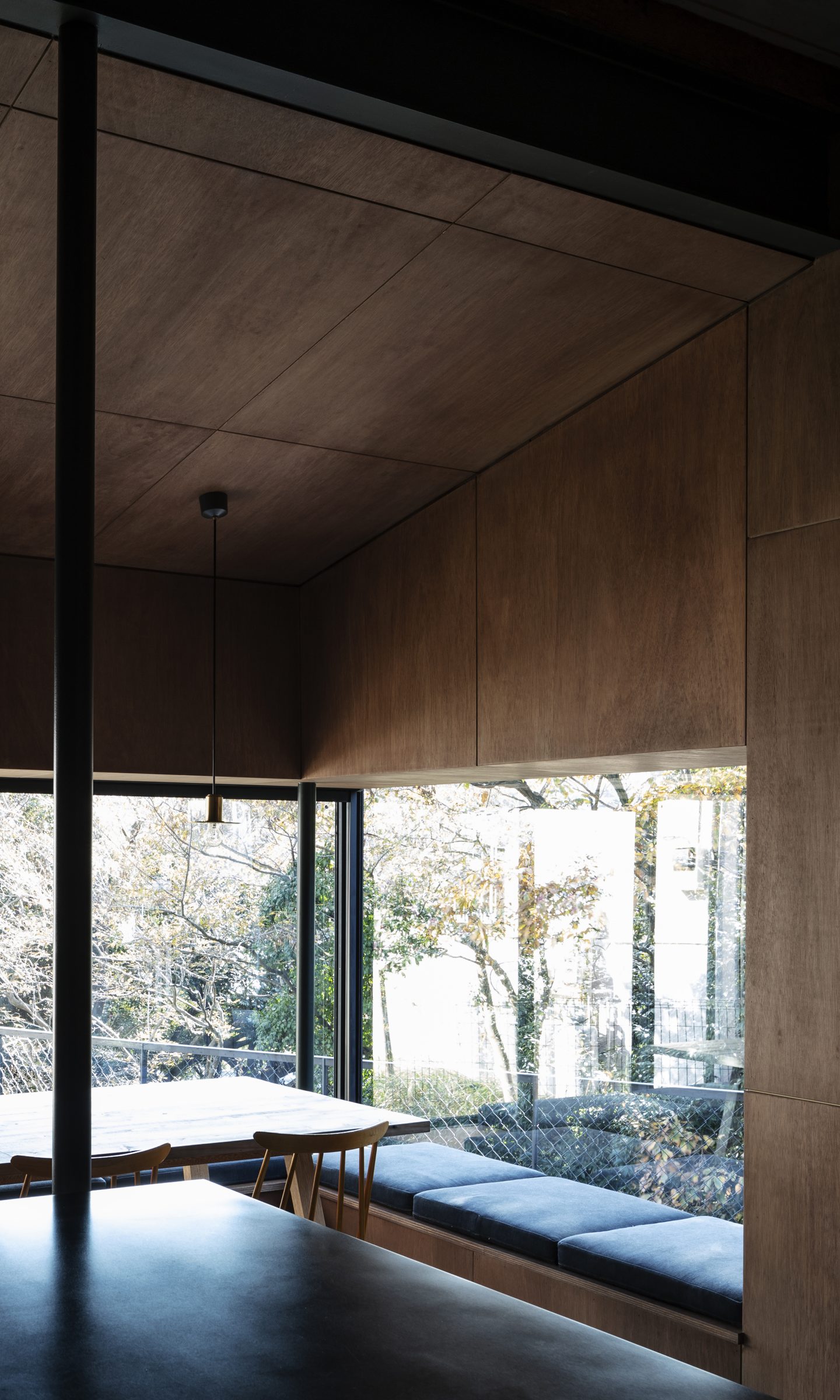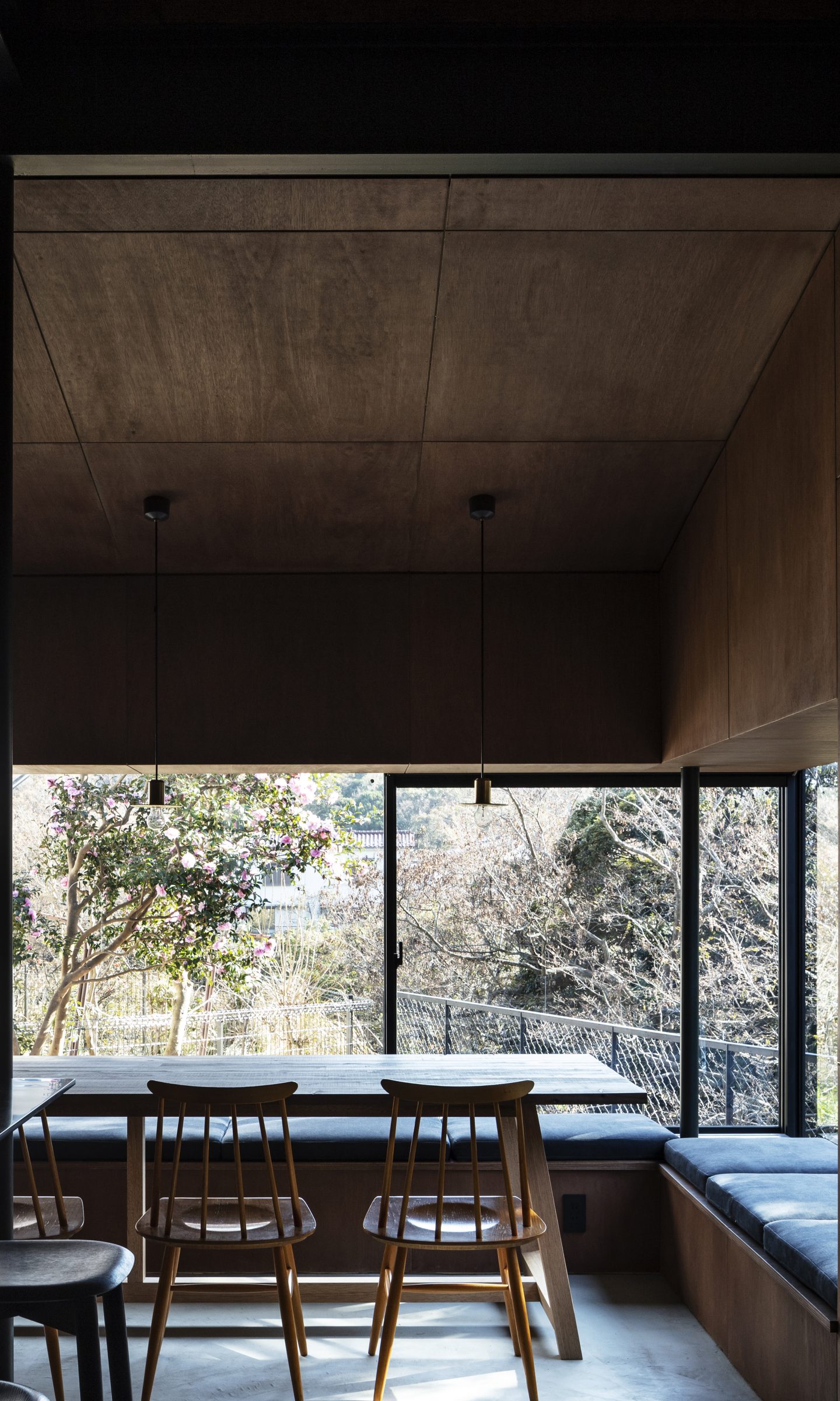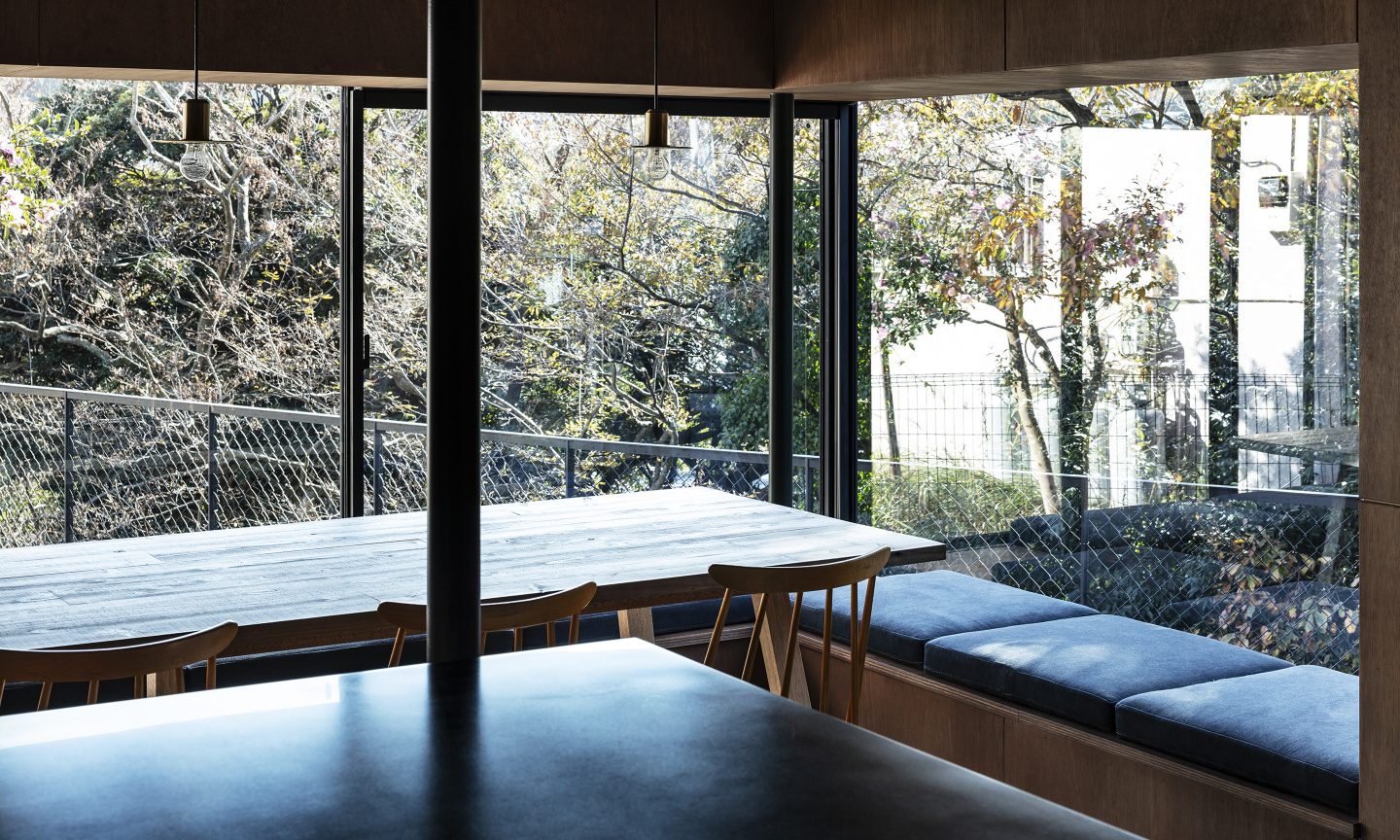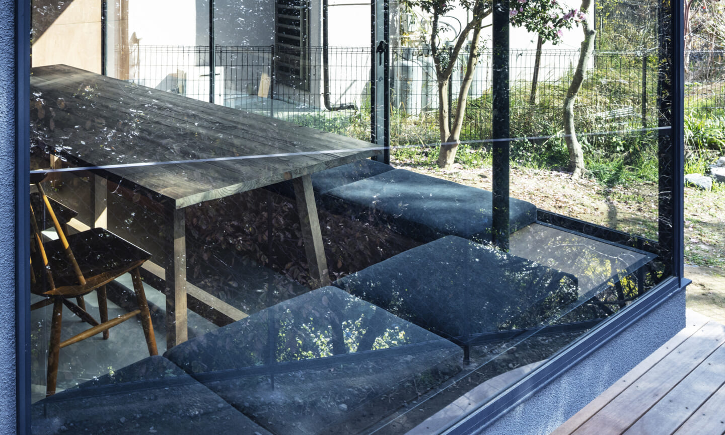 The bench in the kitchen reflects the seasonal change like a picture frame. Framing out the colours of forests and mountains, the place for a family blends into the scenery.