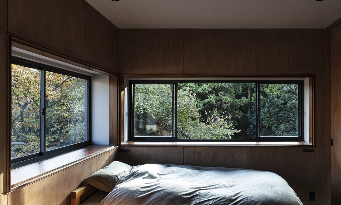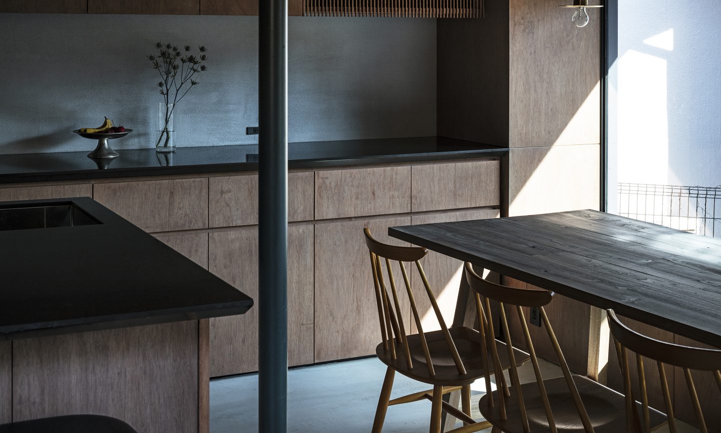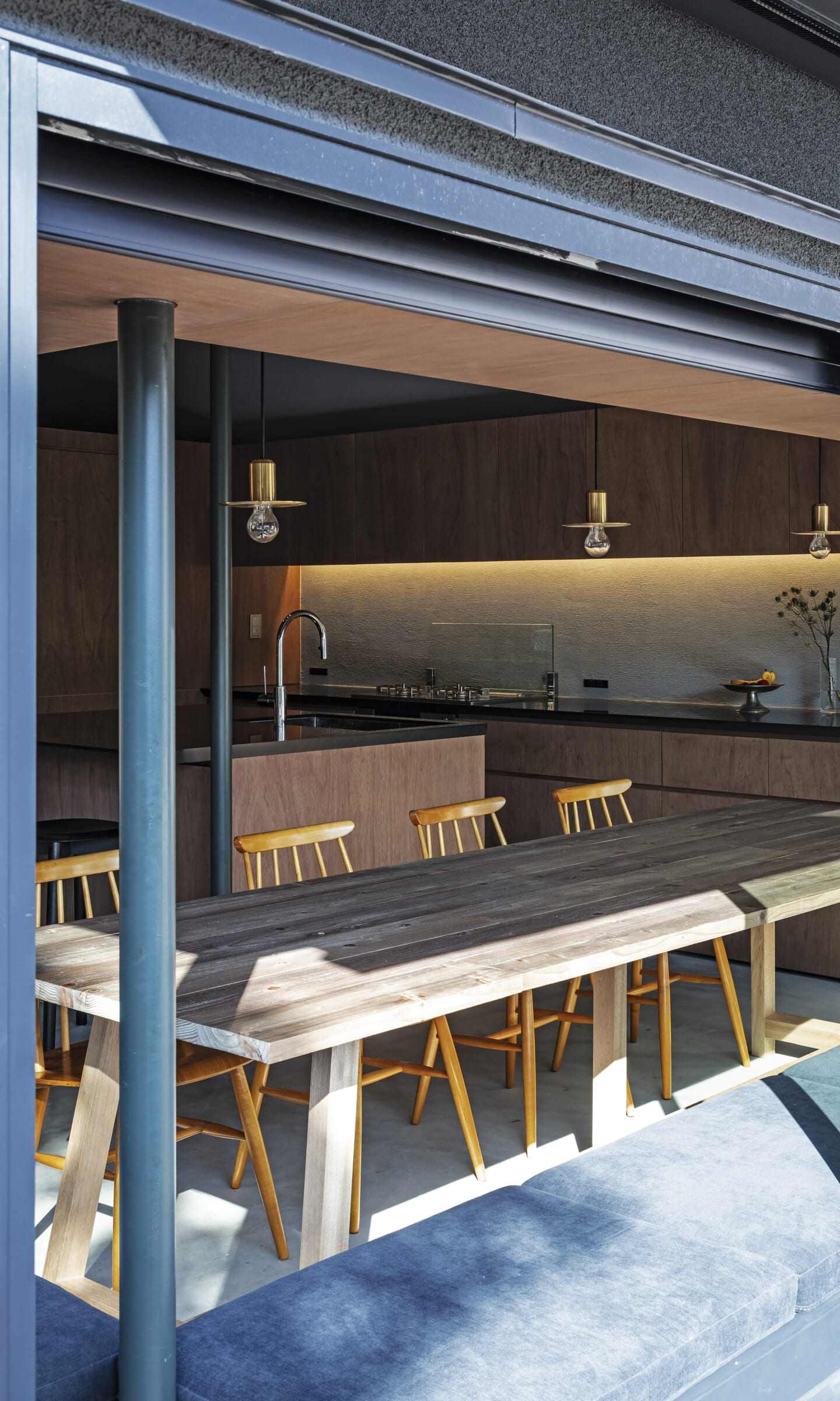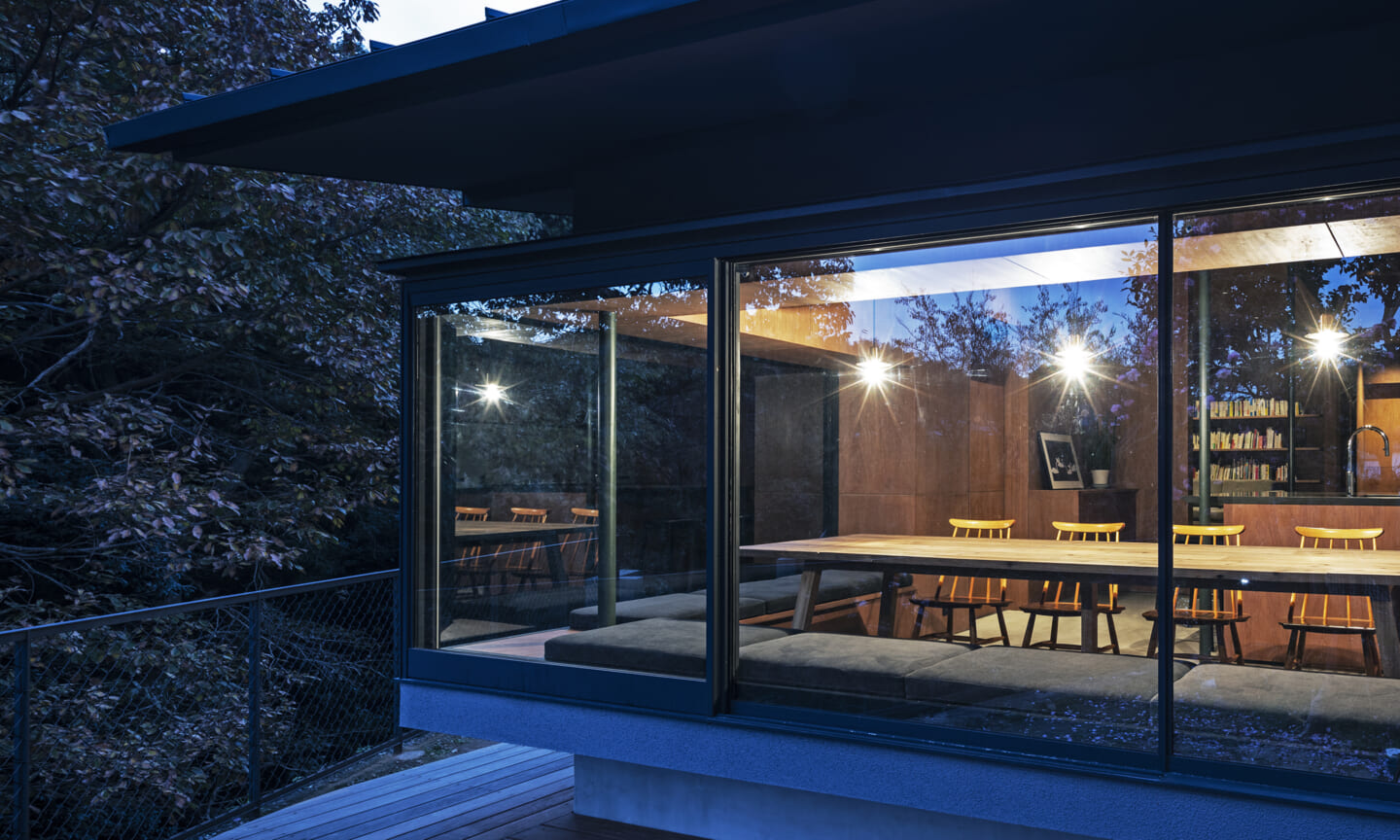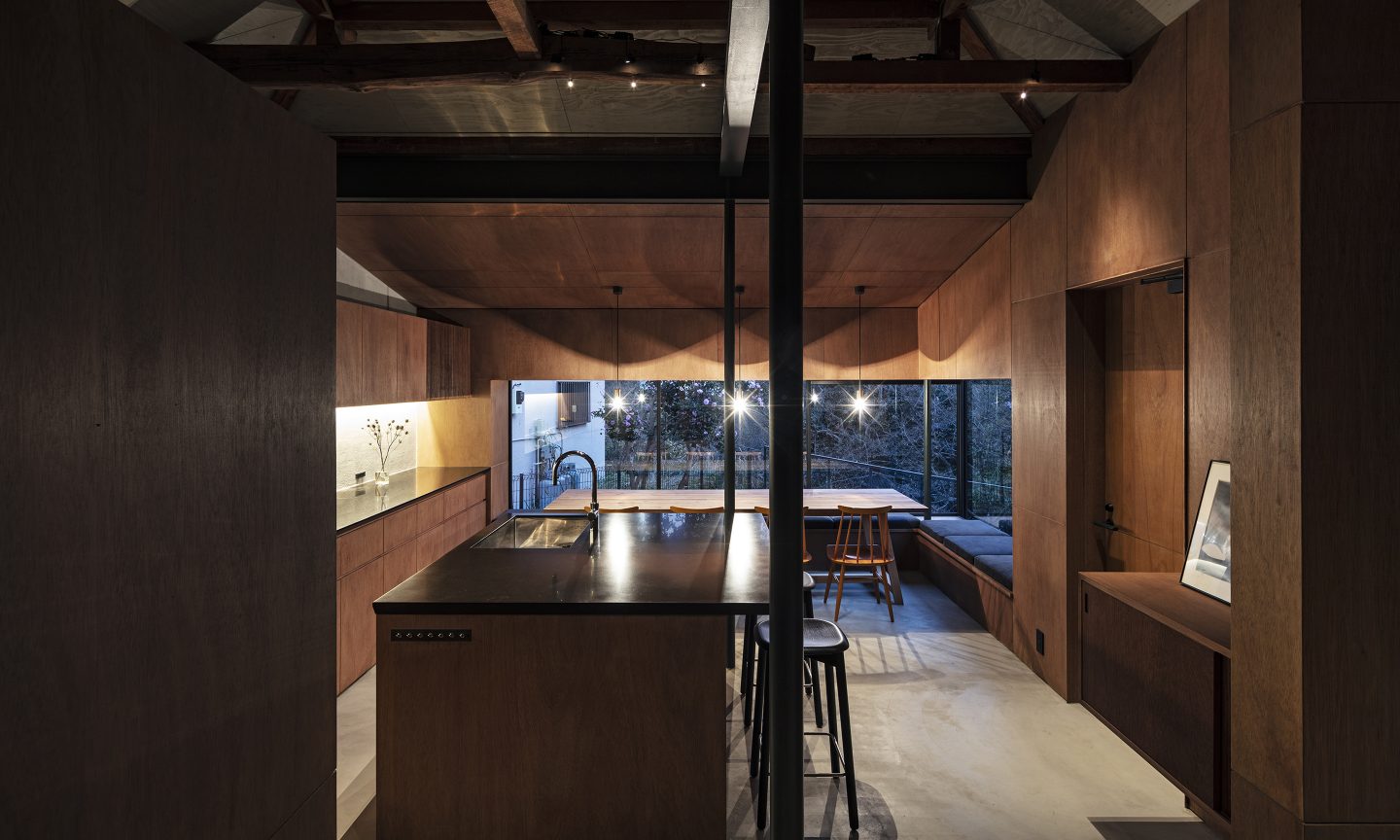 The bench in the kitchen reflects the seasonal change like a picture frame. Framing out the colours of forests and mountains, the place for a family blends into the scenery.
