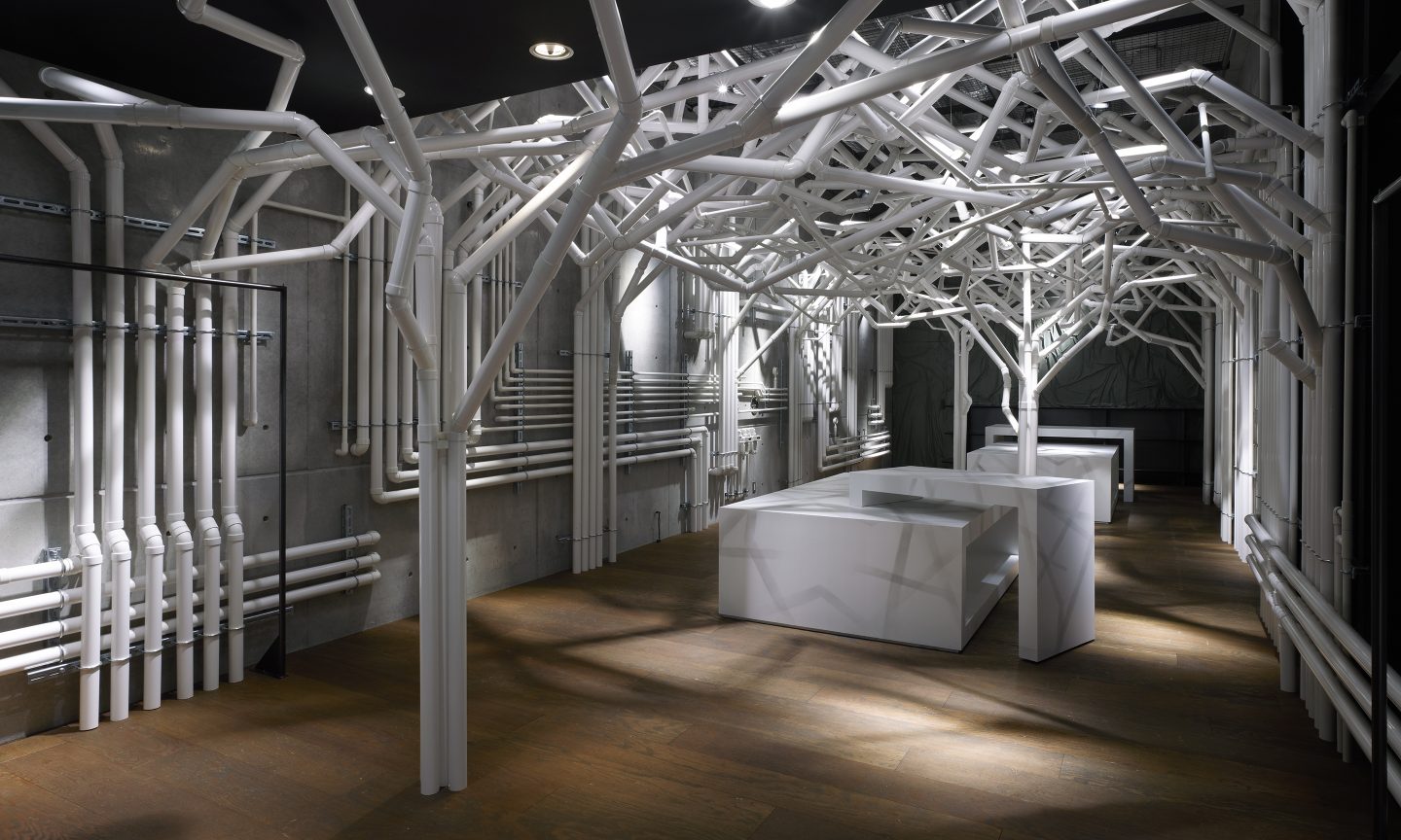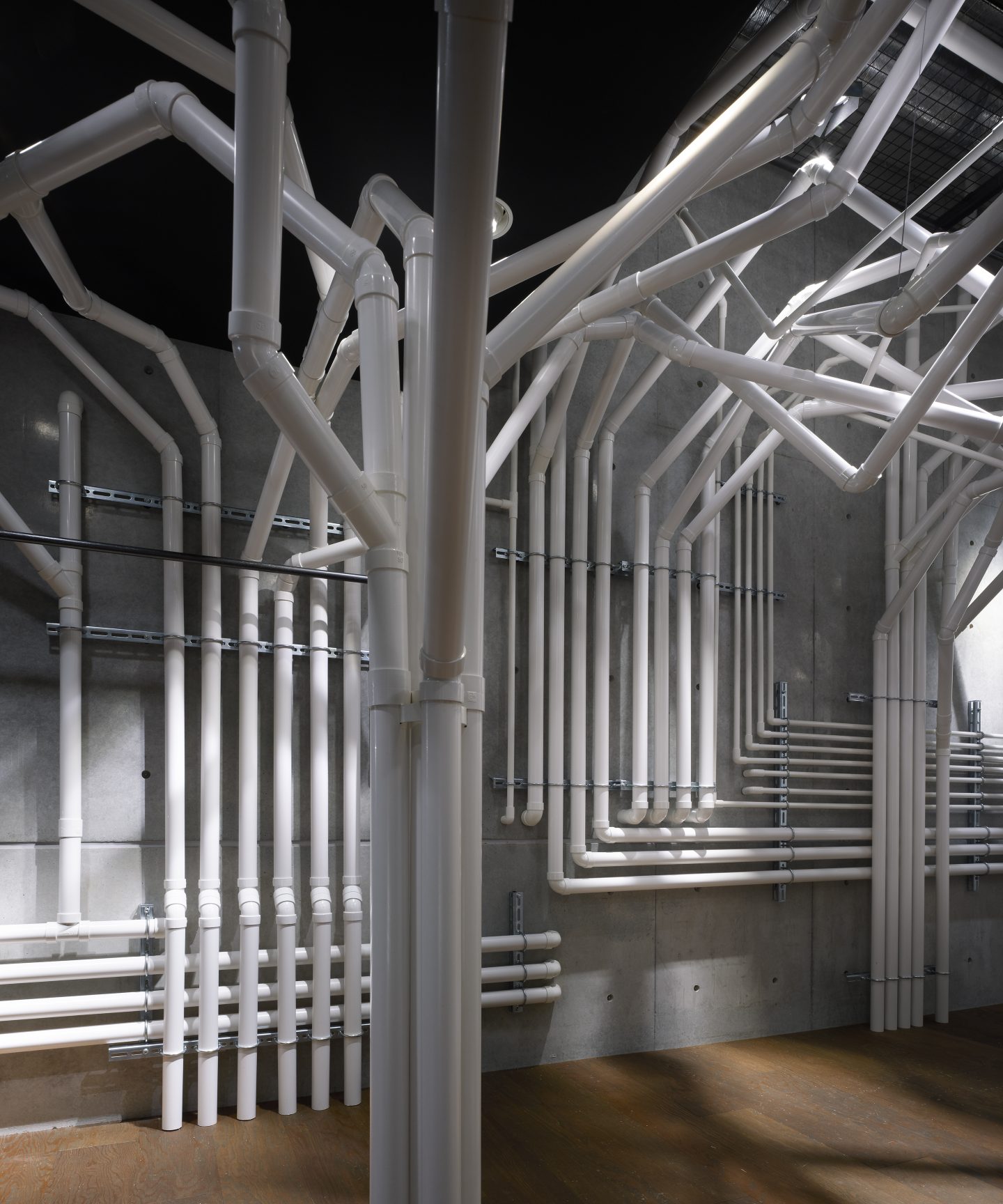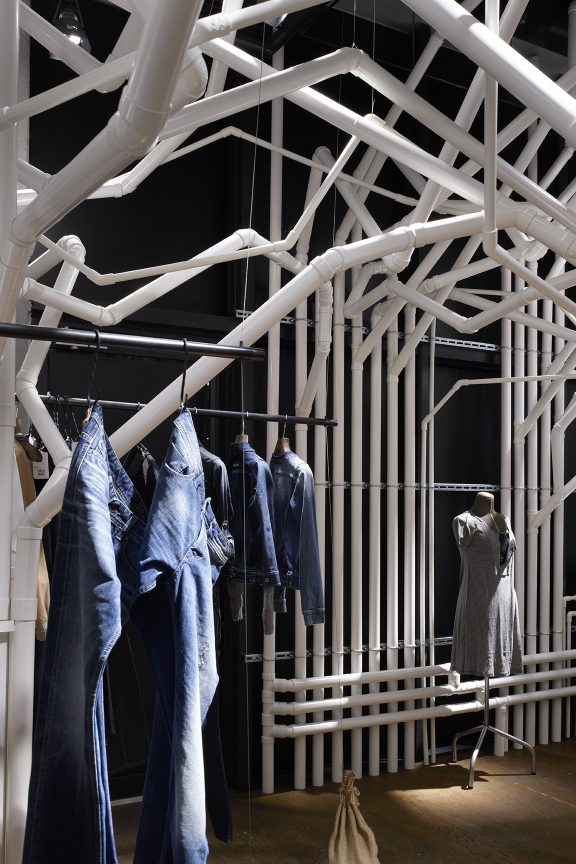 We were guided by our interest in the period in which jeans, Diesel’s showcase product, came into being, and motivated to create a space revealing the way the values of an era can be reflected in the changing value of its products.Jeans were originally work clothing, and as such, went largely unseen. When, all at once, they were determined to represent the height of fashion, they were immediately viewed differently through the eyes of society. We chose to use PVC plumbing pipes for the “Nature Factory” to attempt a similar act of visually altering consciousness. Numerous pipes climb the walls in arrangements characteristic of their typical use and appearance; they rise until they plunge inward, converge, and descend in a pattern reminiscent of a mangrove forest consuming the entire space.