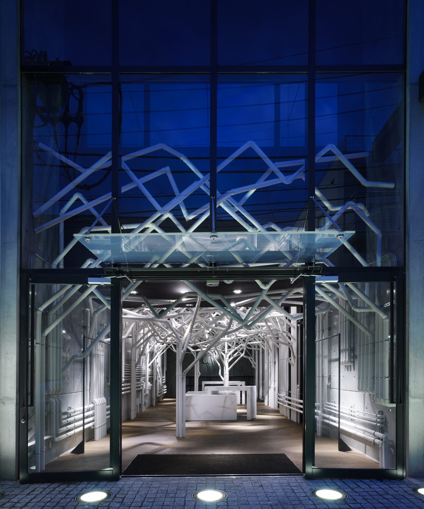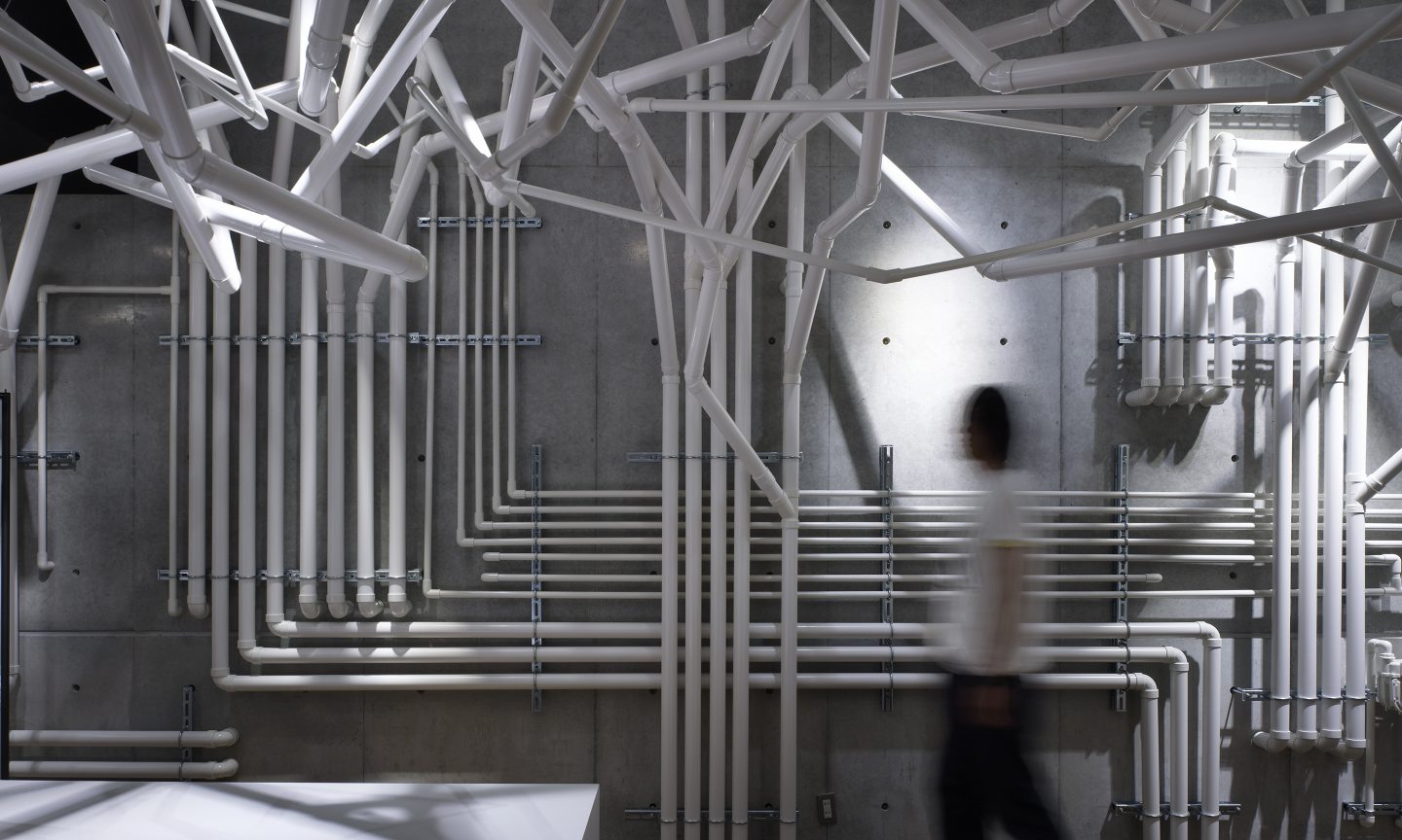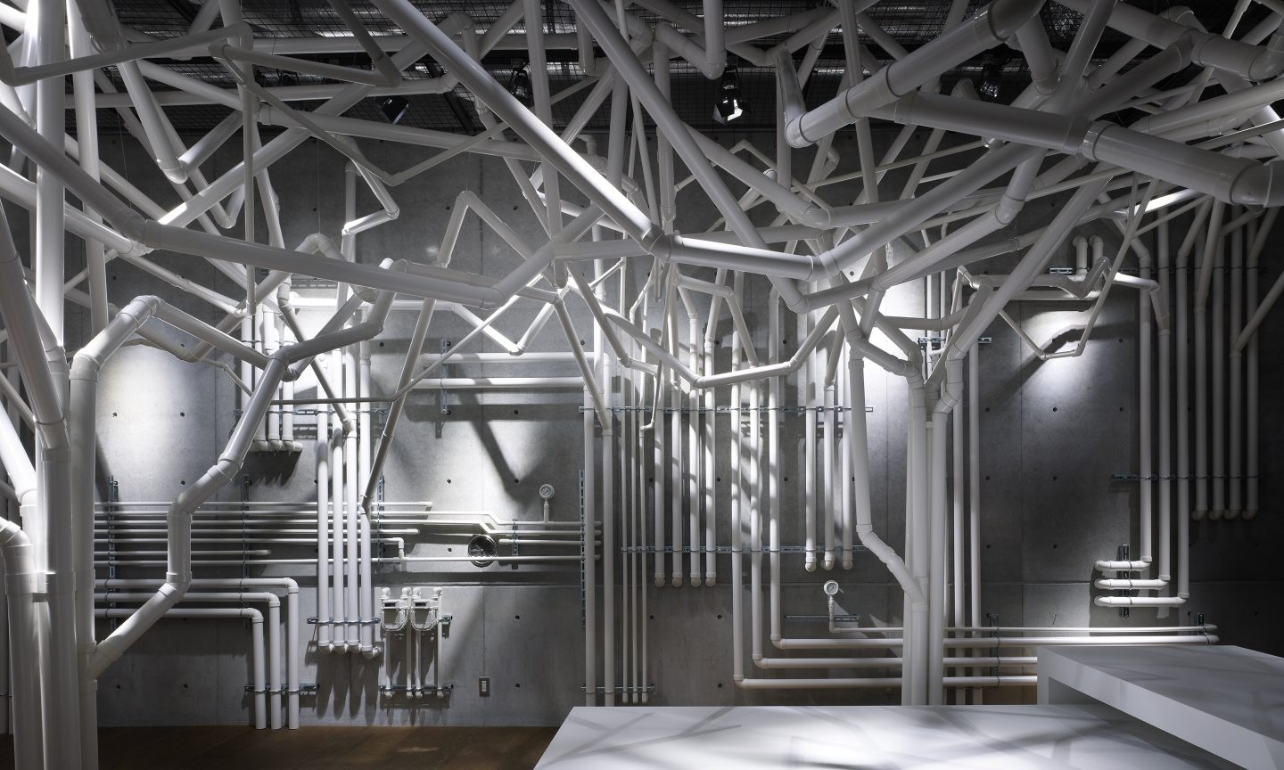 We were guided by our interest in the period in which jeans, Diesel’s showcase product, came into being, and motivated to create a space revealing the way the values of an era can be reflected in the changing value of its products.Jeans were originally work clothing, and as such, went largely unseen. When, all at once, they were determined to represent the height of fashion, they were immediately viewed differently through the eyes of society. We chose to use PVC plumbing pipes for the “Nature Factory” to attempt a similar act of visually altering consciousness. Numerous pipes climb the walls in arrangements characteristic of their typical use and appearance; they rise until they plunge inward, converge, and descend in a pattern reminiscent of a mangrove forest consuming the entire space.