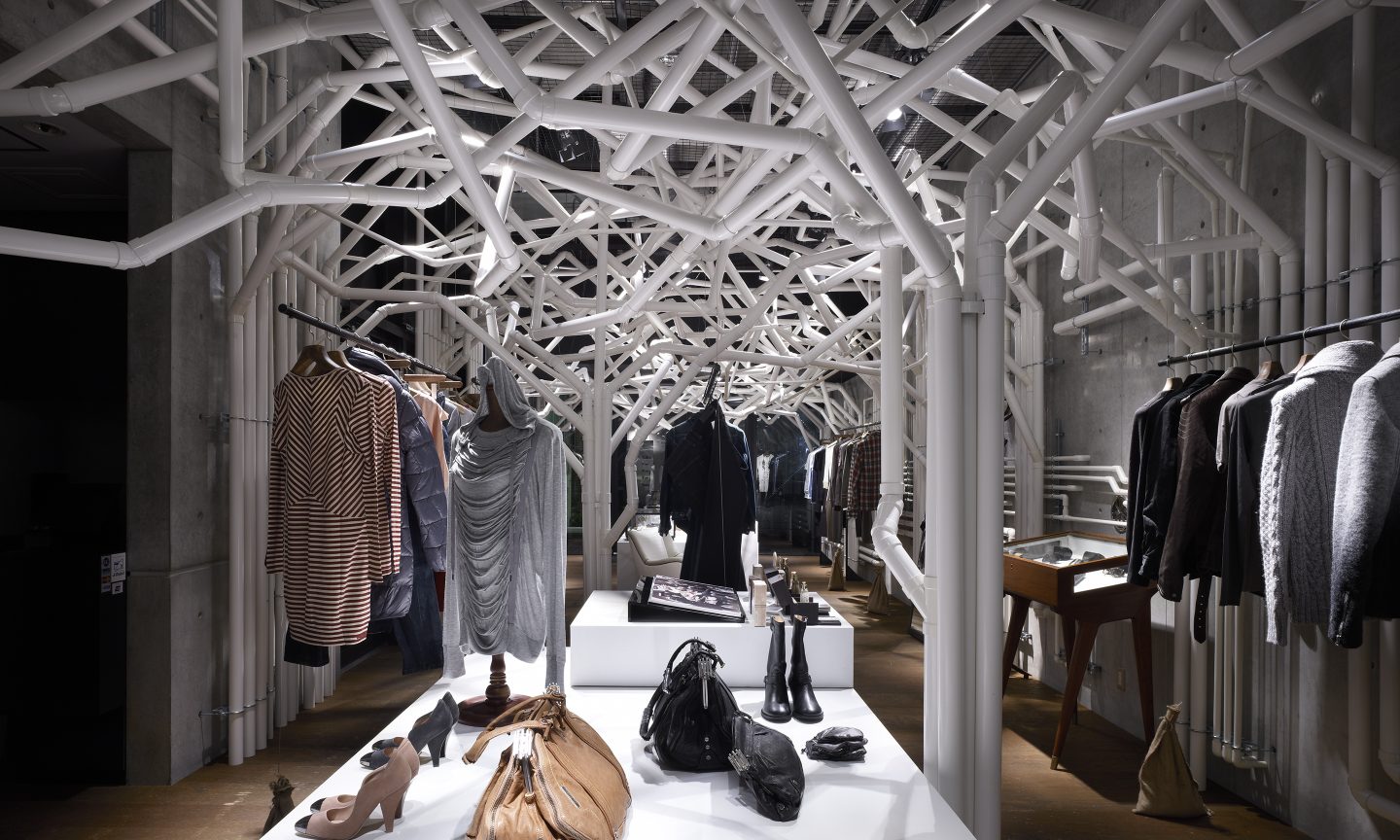In the same way, commerce and art come to live together, as light darts through the limbs casting shadows across the fixtures, and illuminating the merchandise displayed amid the installation. If there is a message here that we wish to convey to society, it is that within genres and materials as disparate as plumbing and fashion, diversity is evenly met by common purpose.