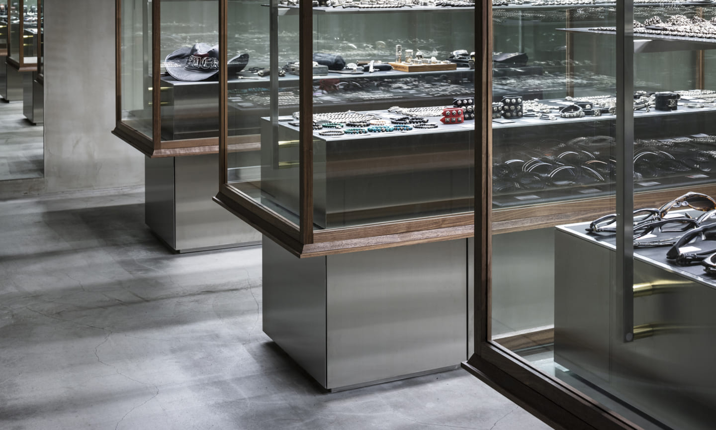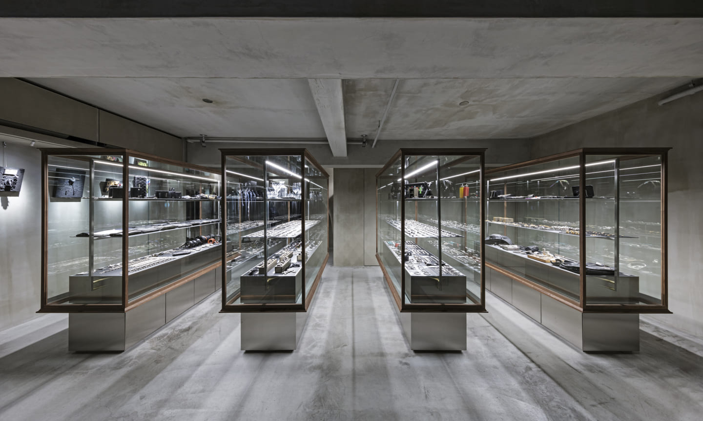 By installing heavy wooden frame in a minimalistic space, this shop provides a new scene where the products were observed as if they are exhibition pieces of a museum.
