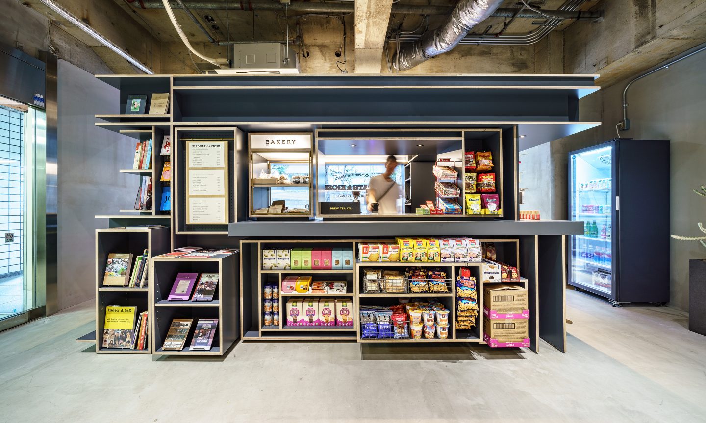 KIOSK をモノの集積と捉え、オフィスに欲しいモノという目線で上質で健康に考慮しセレクトしたスナックやサンドウィッチ、お弁当、スイーツ、ステーショナリーやコスメや書籍など様々なgood convenient goodsを提供する。商品が空間を構成し、箱が増殖していくような更新性と空間への侵食性により変化を許容するデザインとした。