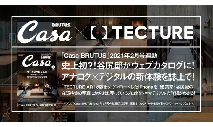 閲覧には「TECTURE AR」β版のダウンロードと『Casa BRUTUS』2021年2月号が必要になります。「TECTURE AR β版」の利用は、『Casa BRUTUS』2021年2月号の谷尻邸特集ページに限定され、同誌とセットで起動します。