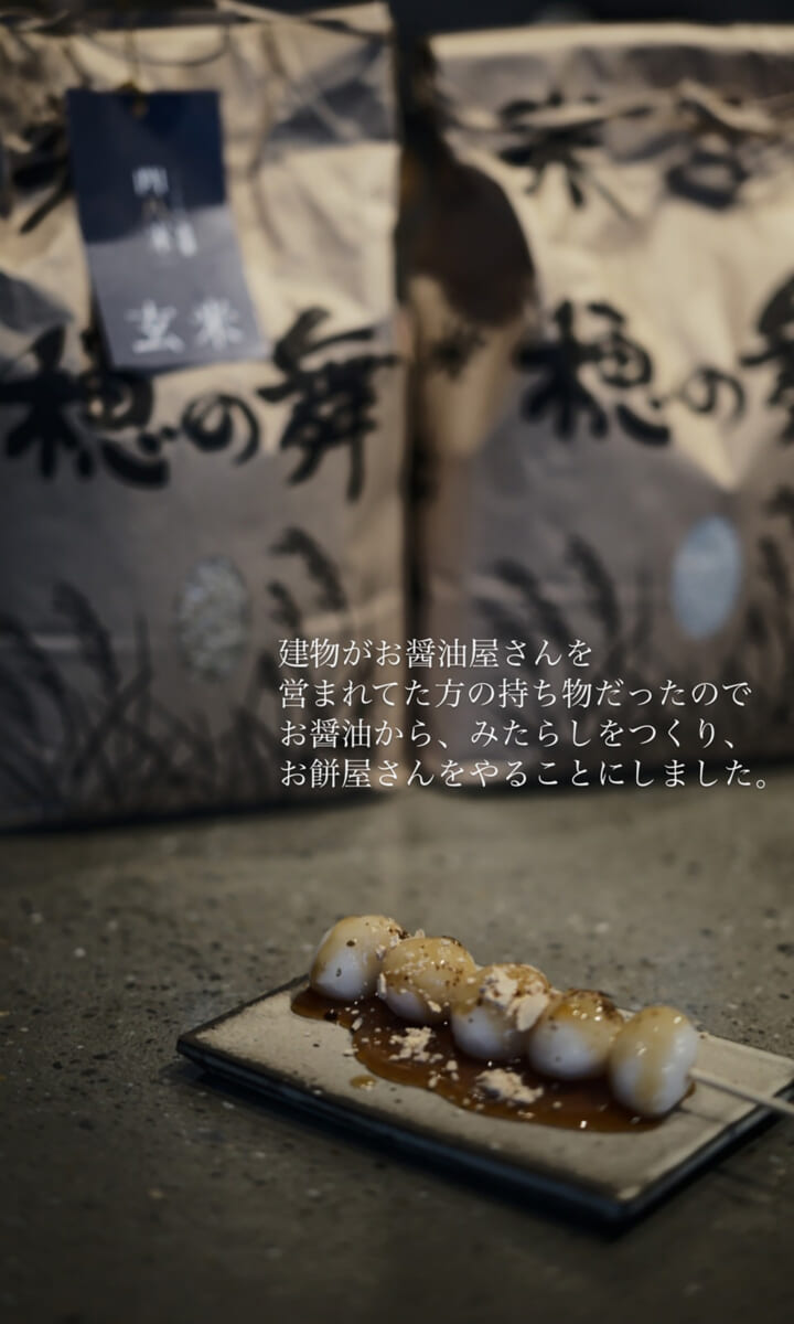 僕の生まれたまち三次に、お餅屋さんをオープンします。おばあちゃんが、来る日も来る日もお餅を食べて、我が家の冷凍庫は丸餅で一年中いっぱいでした。まちの人や足を運んでくださる方々が集まって、昔話や未来の話をできる場所を考え続けた結果、お茶とお餅・団子のある、のどかな風景をつくることにいきつきました。幼い頃、小銭を片手に駄菓子屋さんに行ったあの頃のように、子どもたちが集まったり、お年寄りの寄り合いの場所になったり、そして仕事をする場所としても、人と人が接する場所にして行きたいと思います。