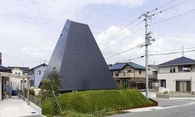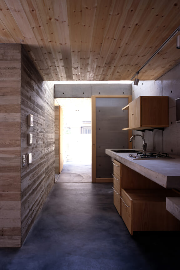 間口が狭く細長い敷地であることから主居室を敷地奥側に配置することで、奥行きによって前面道路からの適度なプライバシーが守られ、壁面ラインを斜めに振ることで前庭を作って木を植え、陽光を浴び風にゆらめく緑を愉しむことができる場となった。