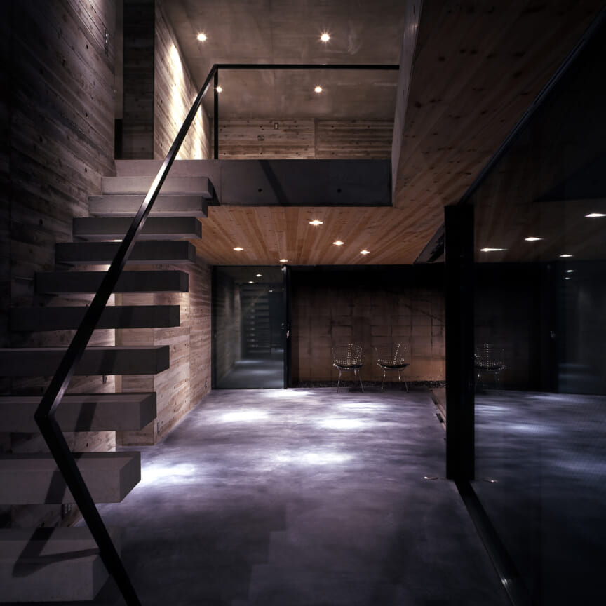 建築は、ガラスとコンクリートという長い時間に耐える事ができるマテリアルで構成し、2枚の軒というシンプルな形態によって、自然環境との連続性を高めた空間とした。