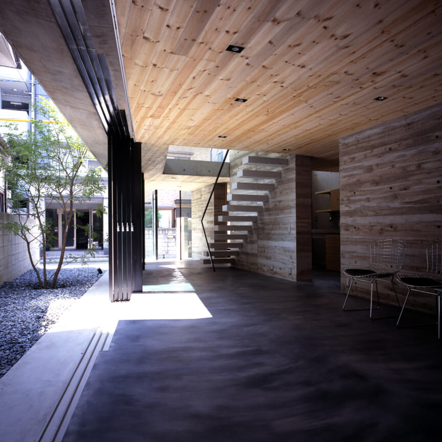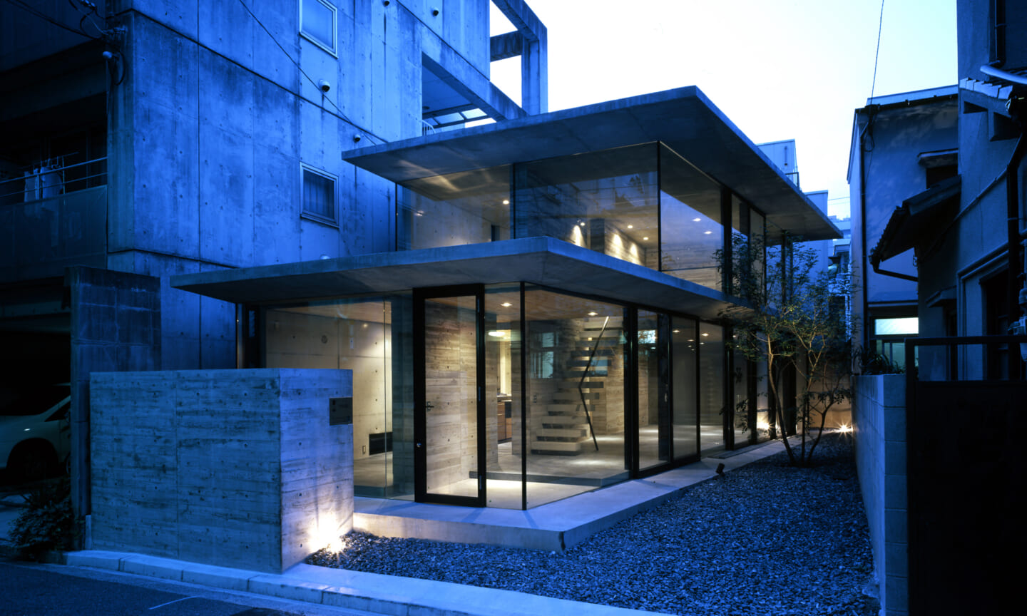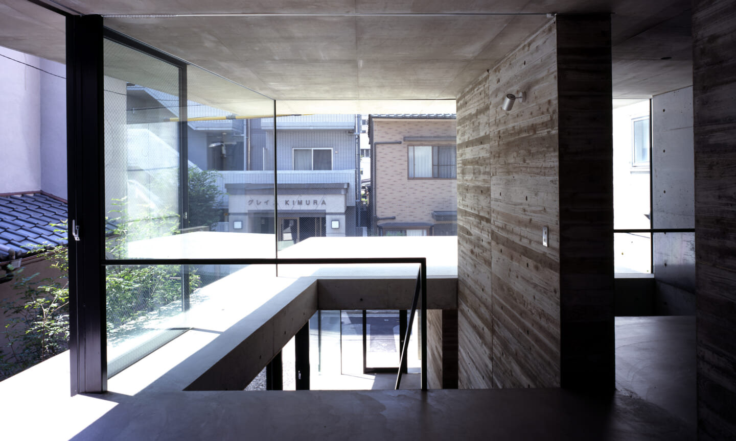 敷地は3方を隣地建物のコンクリートの壁やコンクリートブロックの塀に囲まれていてグランドレベルは既に中庭のように守られた環境ができていて、解放しても十分なプライバシーを確保することができた。また、軒を深く出すことで周辺の集合住宅の高い位置からの視線を遮ると共に、夏季日射を遮り、ガラスの壁を雨から守り美しい状態を保っている。