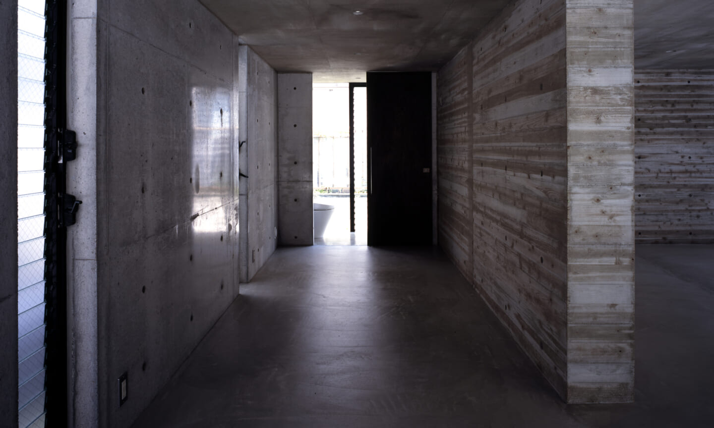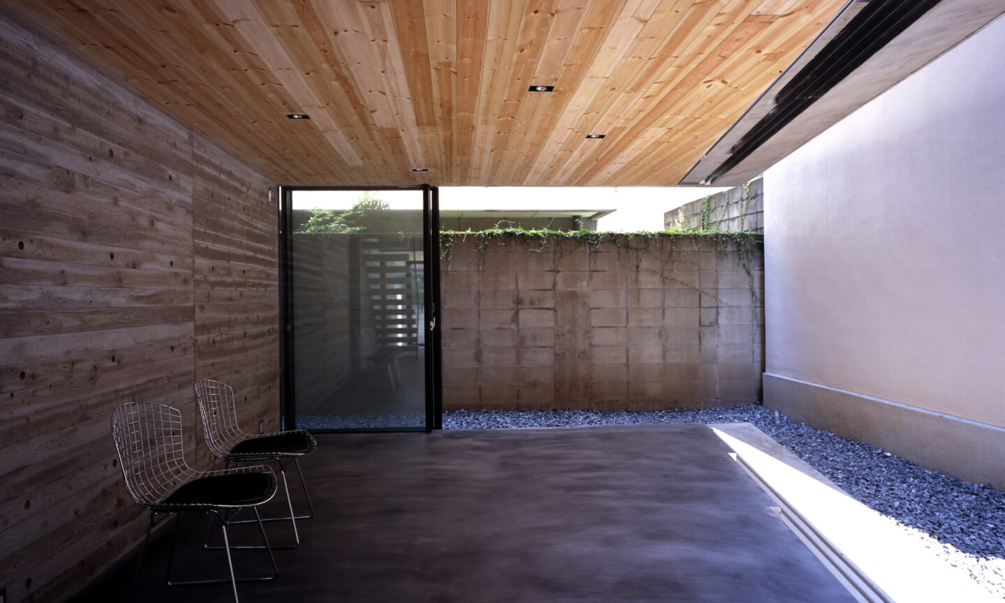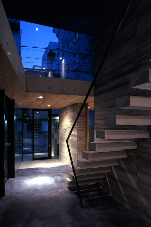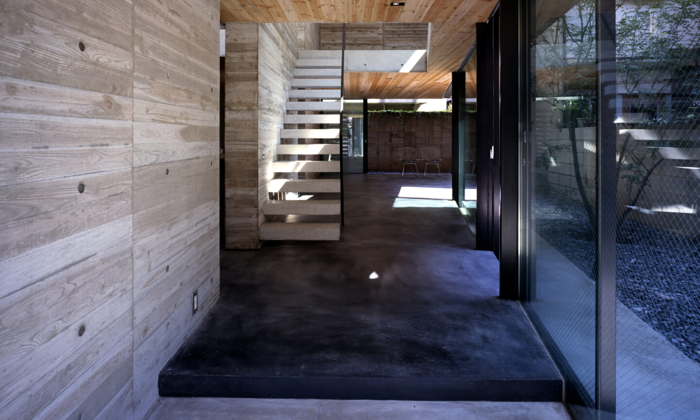 敷地は3方を隣地建物のコンクリートの壁やコンクリートブロックの塀に囲まれていてグランドレベルは既に中庭のように守られた環境ができていて、解放しても十分なプライバシーを確保することができた。また、軒を深く出すことで周辺の集合住宅の高い位置からの視線を遮ると共に、夏季日射を遮り、ガラスの壁を雨から守り美しい状態を保っている。