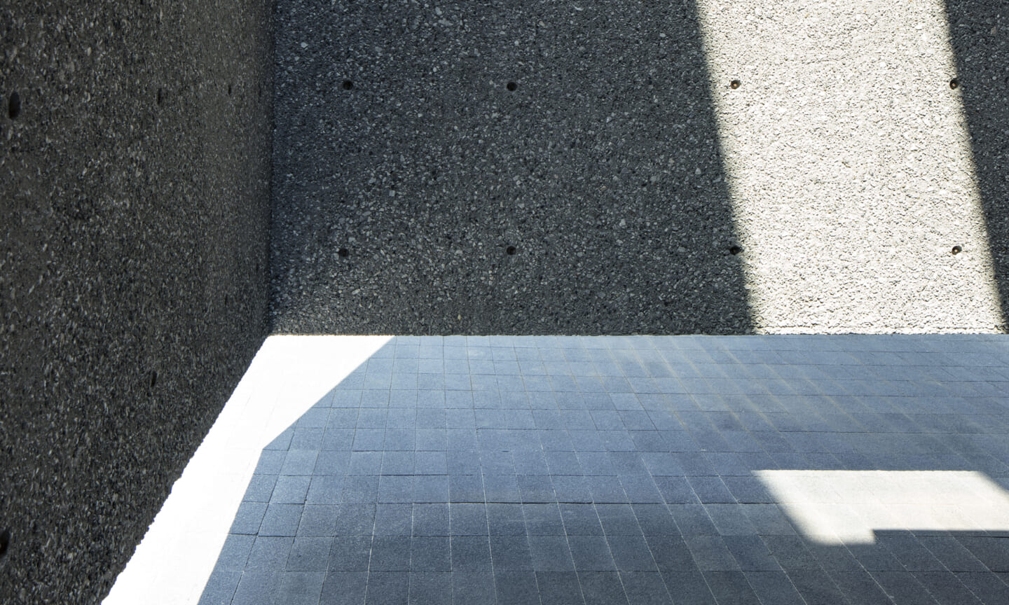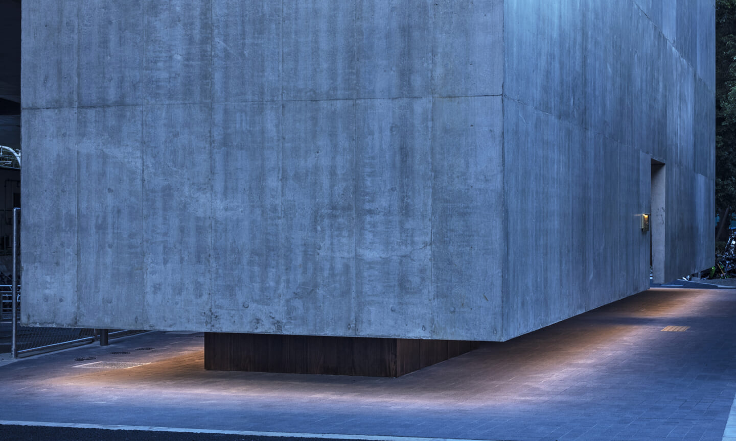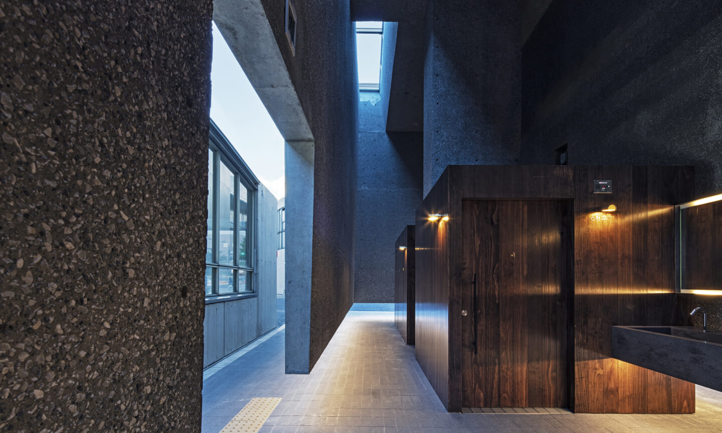 浮かせることで、建築内部と街に程よい繋がりと人の気配を感じる透明性が生まれ、公衆トイレの閉塞感や不安感に繋がる要因となる廊下や行き止まりという要素を取り払うことが出来た。また7.5mの高さを持つ伸びやかな立方体の建築内部の壁面は、コンクリート洗い出しの質感のある仕上げとし屋根のスリットから差し込む柔らかな光を印象的に内に引き込み、日常において意識の外にある「自然の織りなす季節や時間の移ろい」を光の変化によって意図せずとも体感として鑑賞することのできる空間となっている。