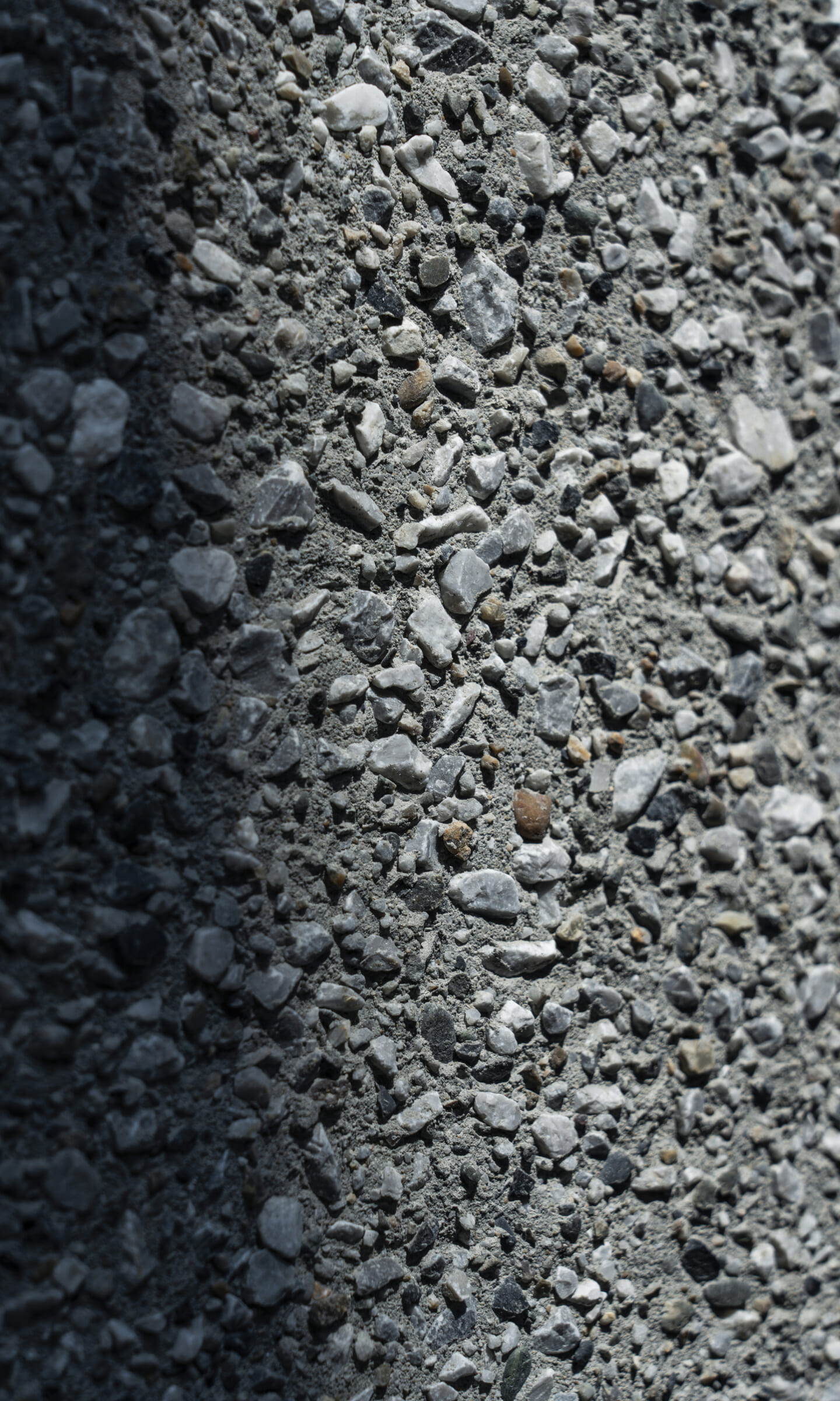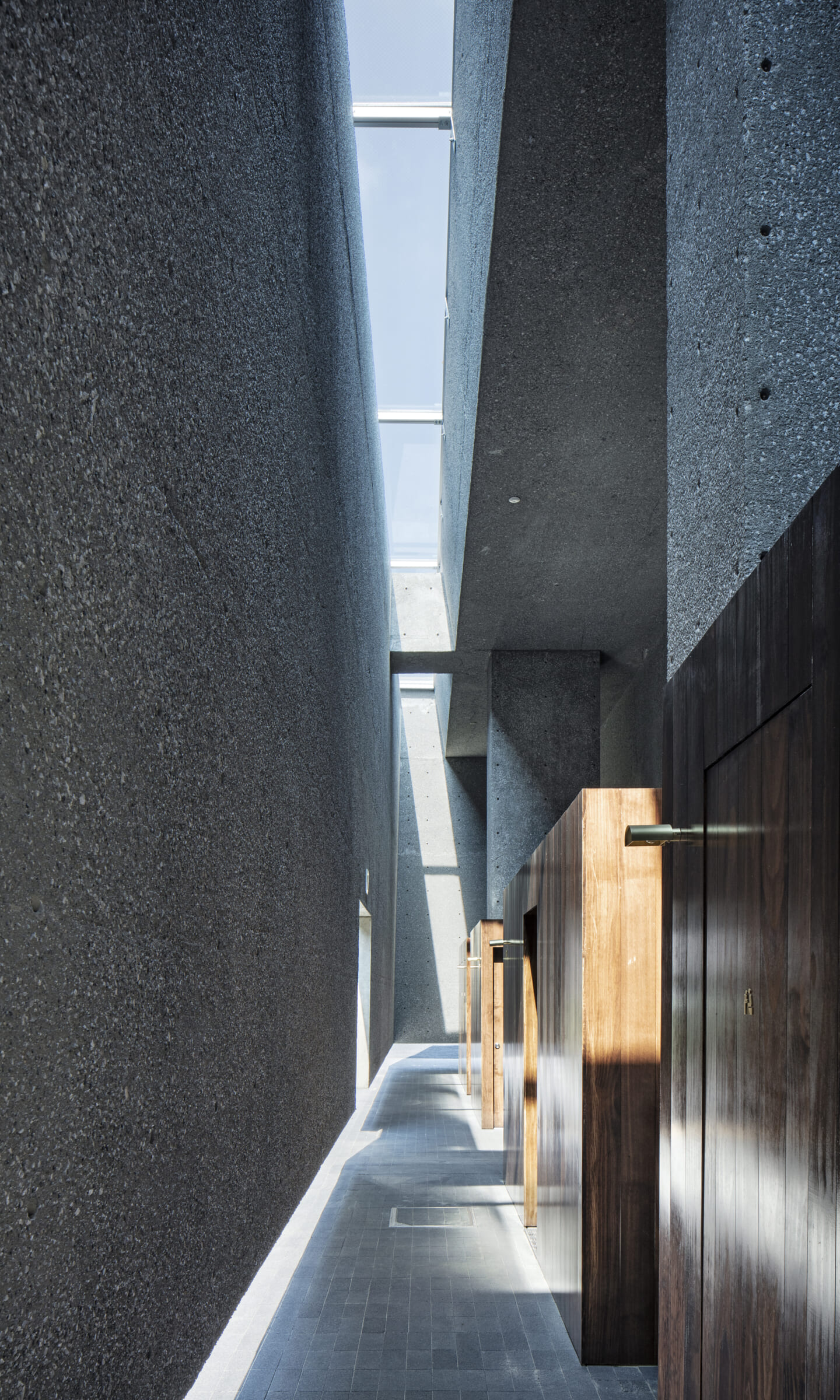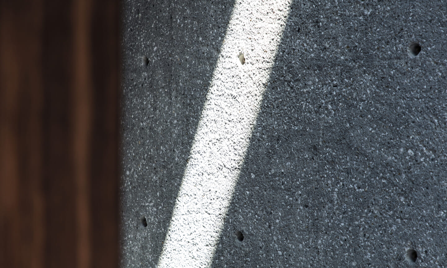 浮かせることで、建築内部と街に程よい繋がりと人の気配を感じる透明性が生まれ、公衆トイレの閉塞感や不安感に繋がる要因となる廊下や行き止まりという要素を取り払うことが出来た。また7.5mの高さを持つ伸びやかな立方体の建築内部の壁面は、コンクリート洗い出しの質感のある仕上げとし屋根のスリットから差し込む柔らかな光を印象的に内に引き込み、日常において意識の外にある「自然の織りなす季節や時間の移ろい」を光の変化によって意図せずとも体感として鑑賞することのできる空間となっている。