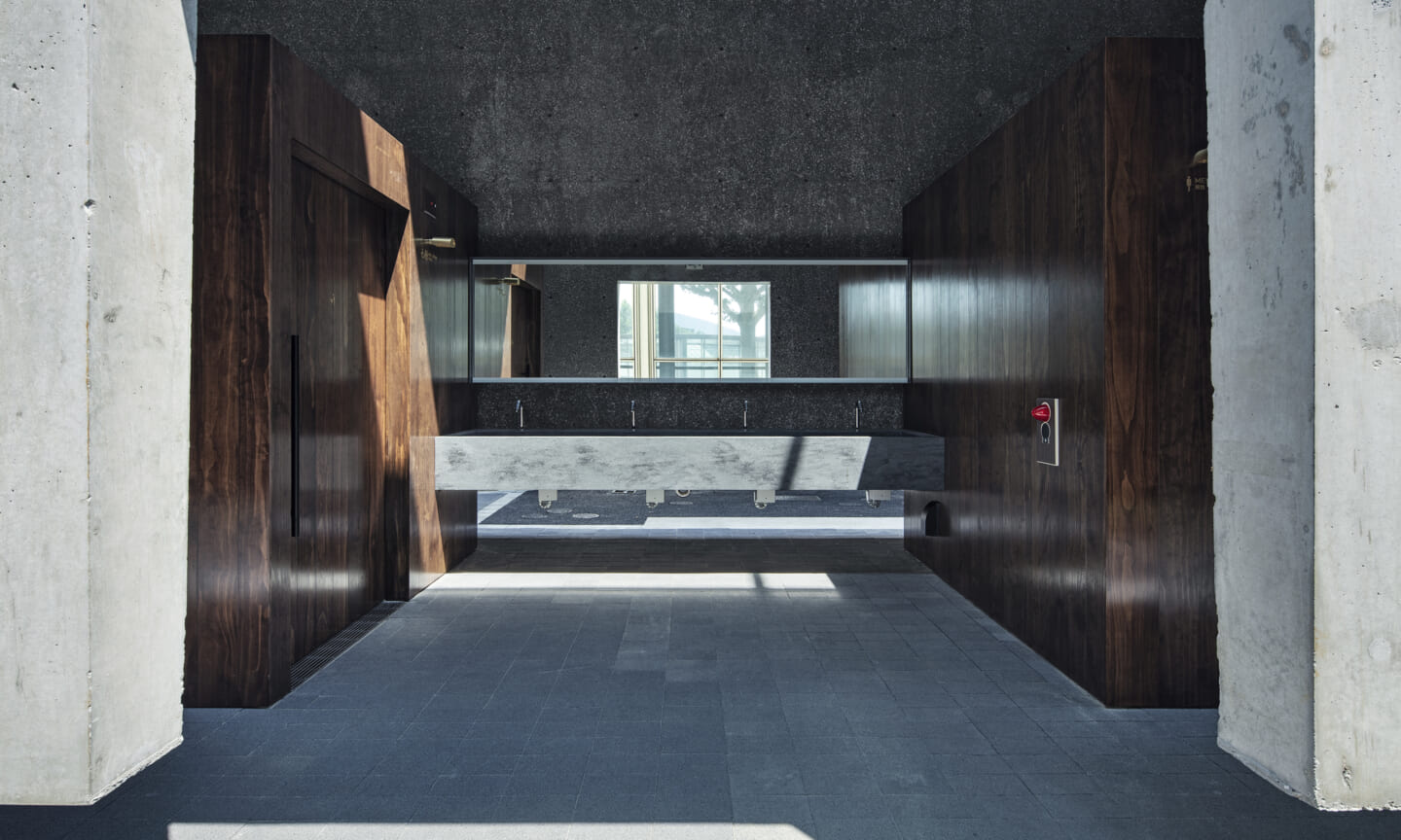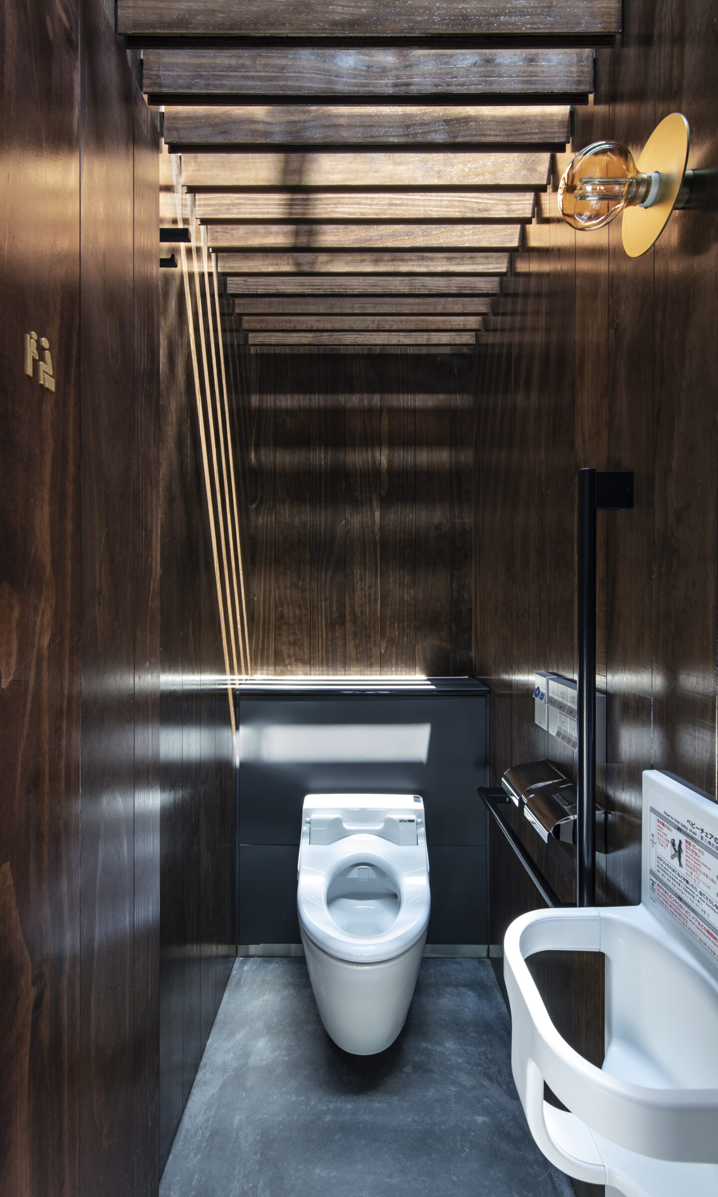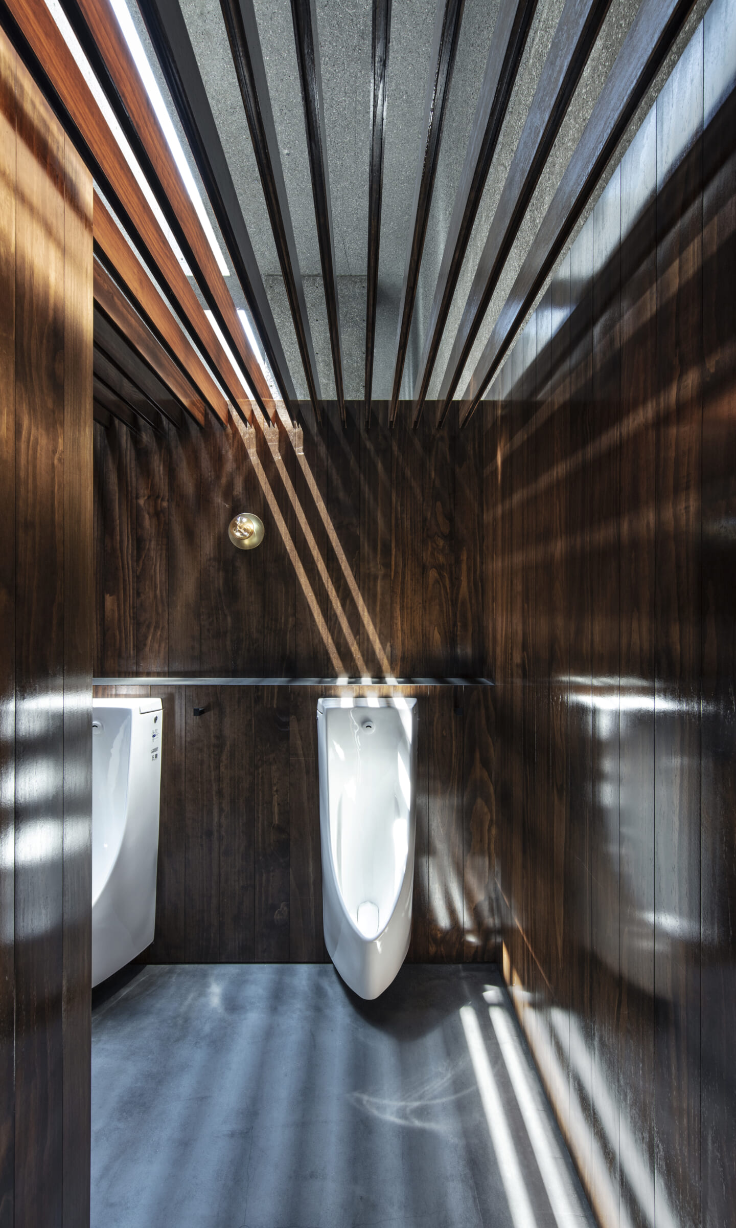 アコヤ材の板張りの仕上げや真鍮のサインによるホテルのような佇まい、男女が共有できるよう中心に据えた洗面などこれまでの公衆トイレへの既視感に反する仕様は、合理性と多様性を重視して計画したものだ。誰にとってもフラットで使いやすく、かつ上質な空間をつくることで利用者の意識が変わり、快適な環境の維持に利用者自体も参加し健全に循環することを期待した提案となっている。