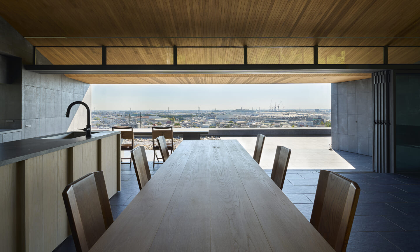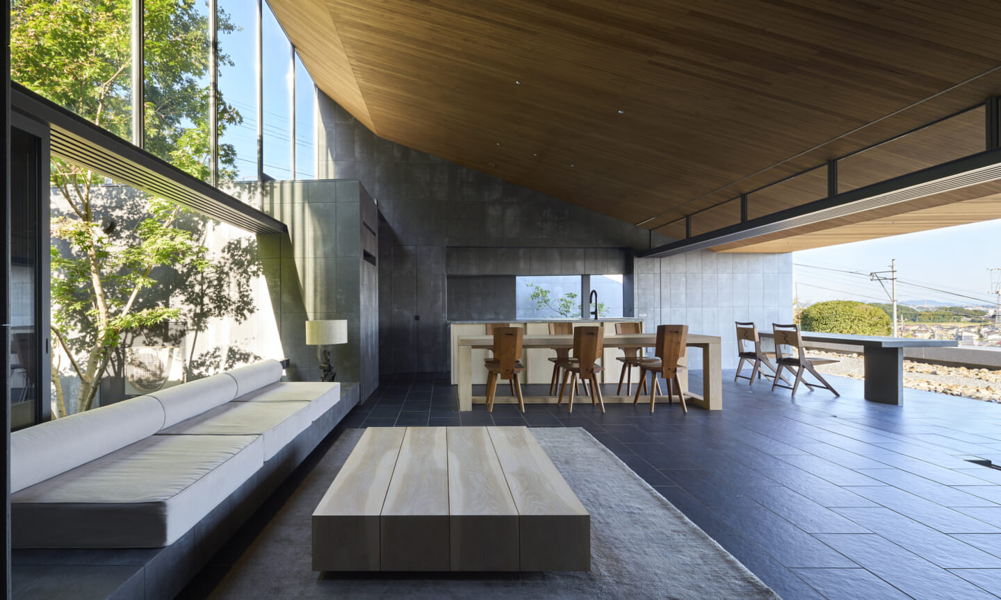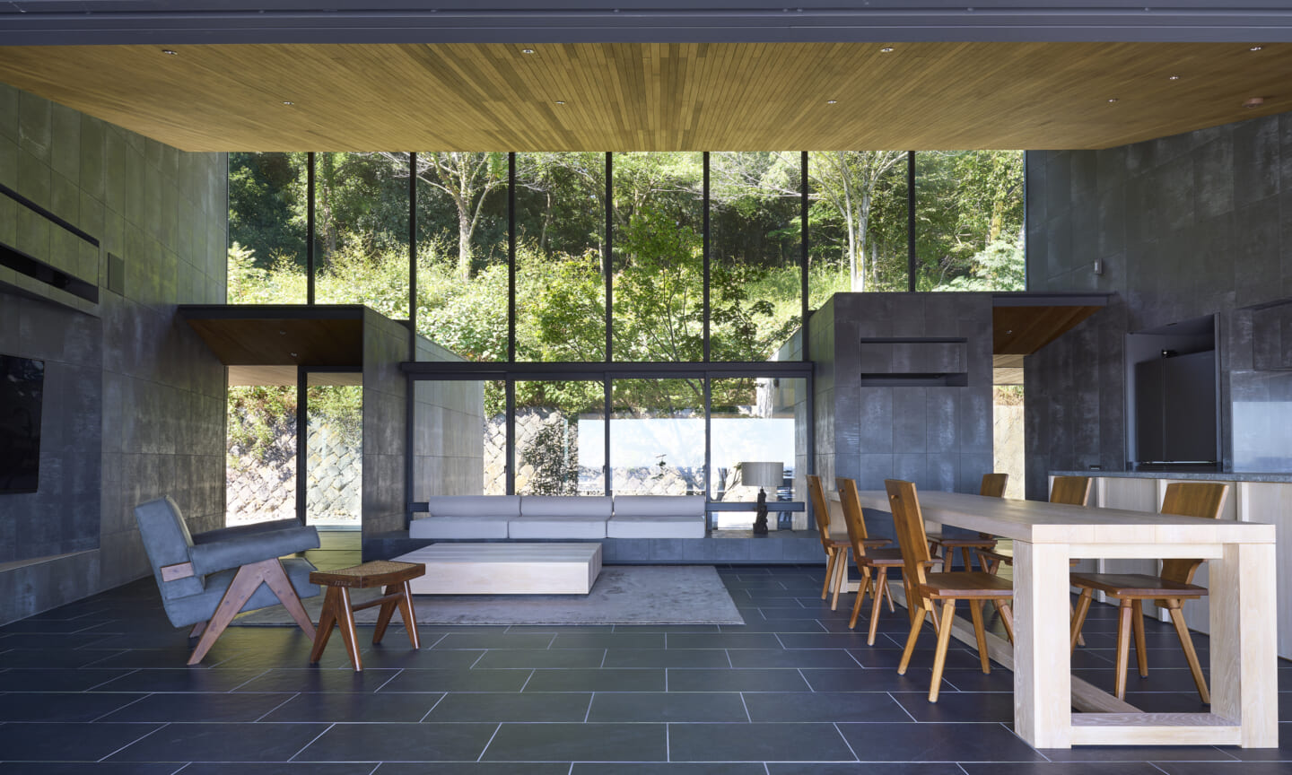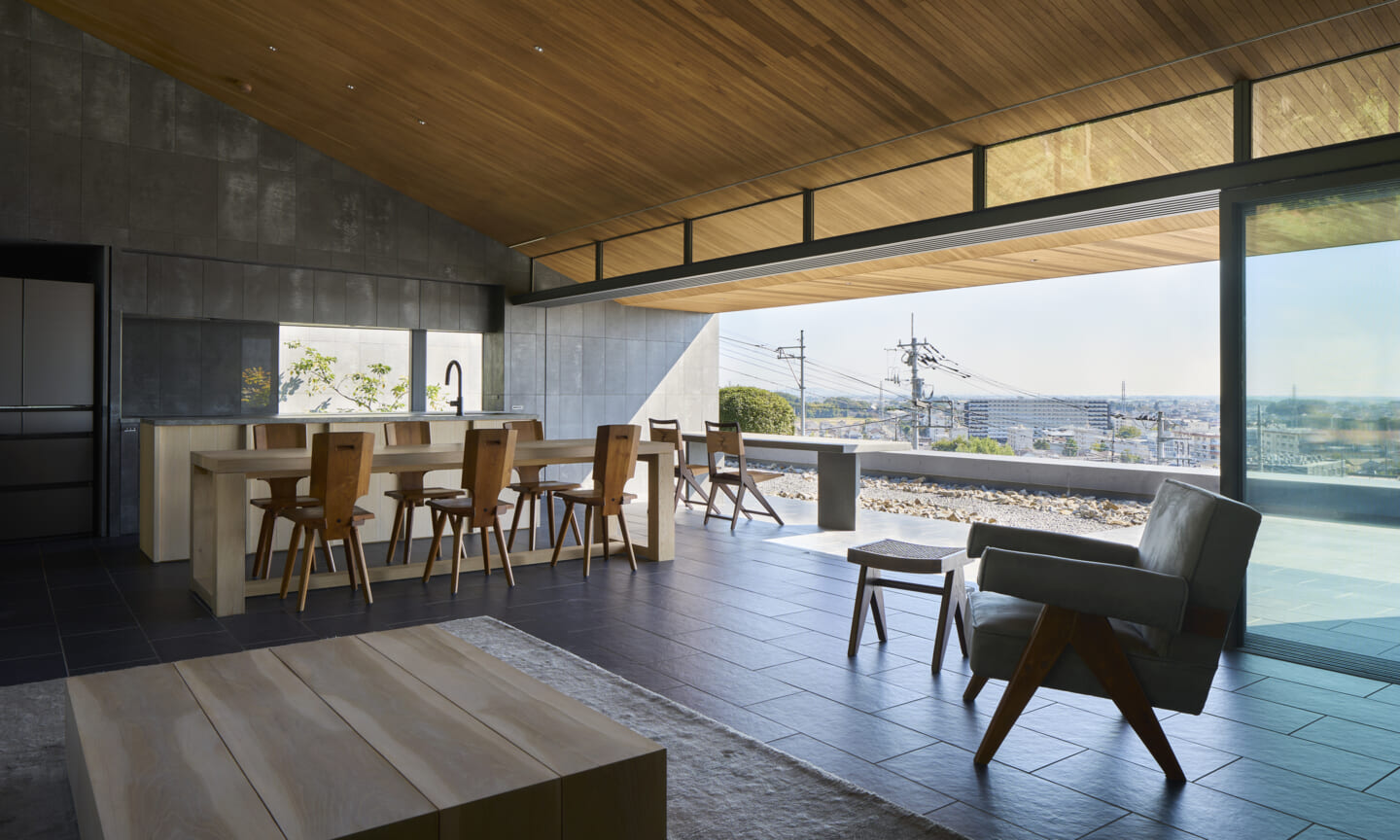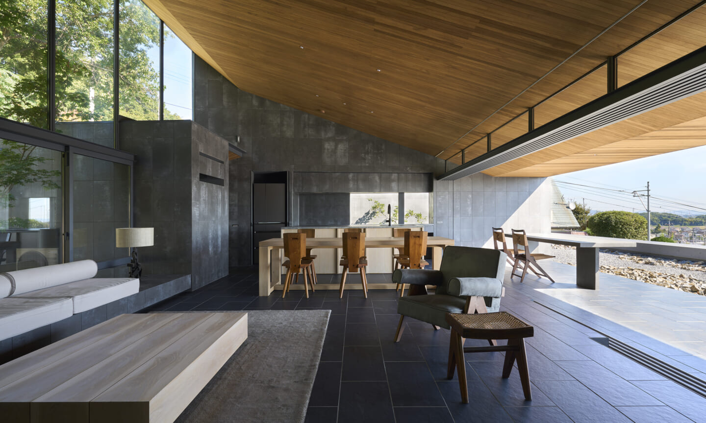 近隣との距離を保つことが難しい国土の狭い日本において、壁や屋根は外的環境から住まい手を守り隠す重要な要素となるが、この住まいの壁や屋根は、人工的な風景であるまちと大自然の間で、住まい手に新たな環境との共存を促す柔らかな隙間を作っている。