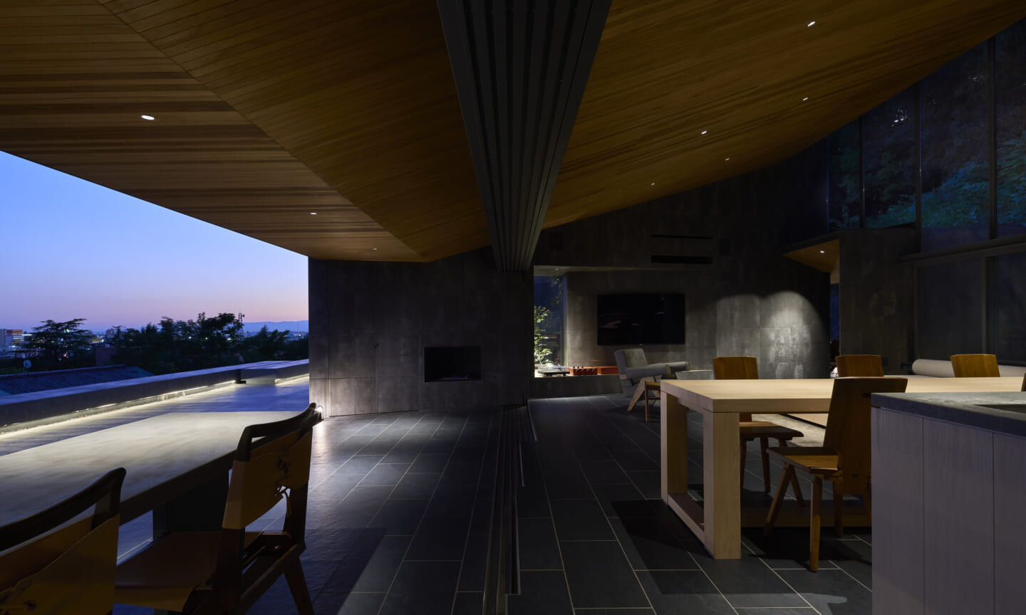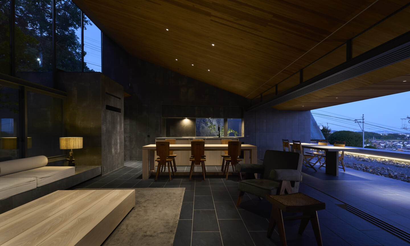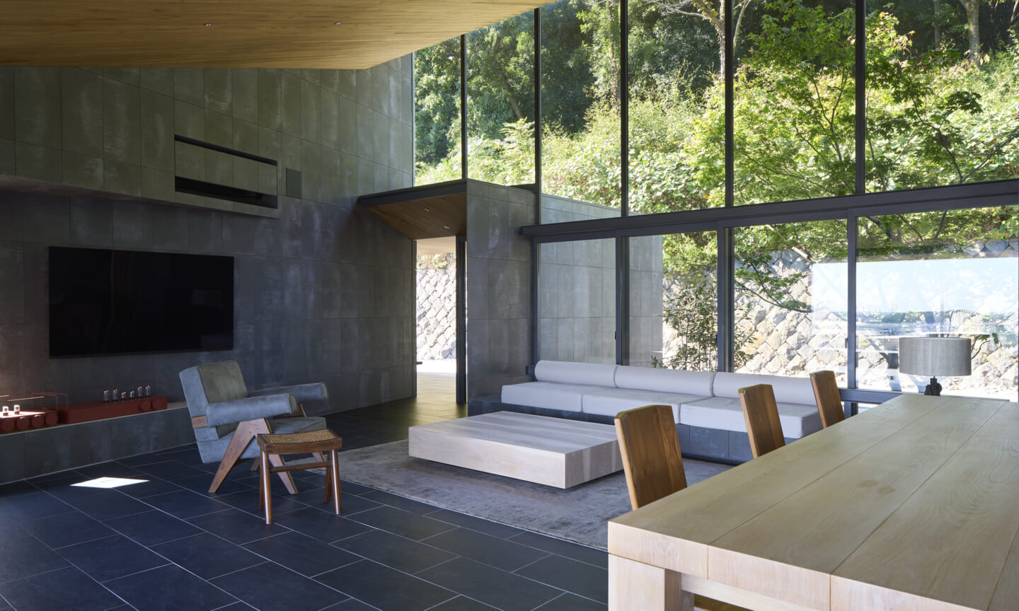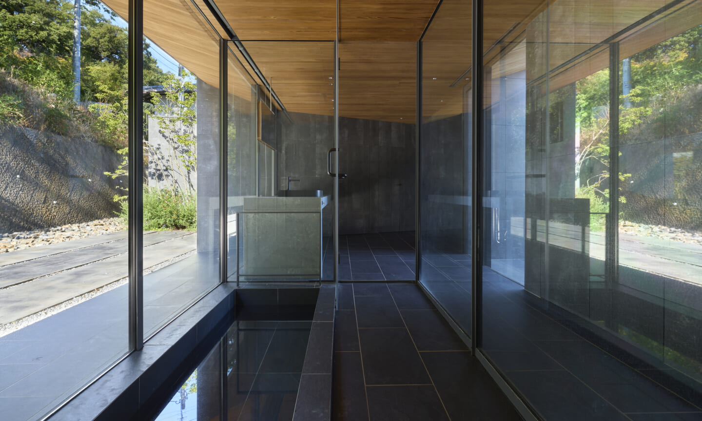 近隣との距離を保つことが難しい国土の狭い日本において、壁や屋根は外的環境から住まい手を守り隠す重要な要素となるが、この住まいの壁や屋根は、人工的な風景であるまちと大自然の間で、住まい手に新たな環境との共存を促す柔らかな隙間を作っている。