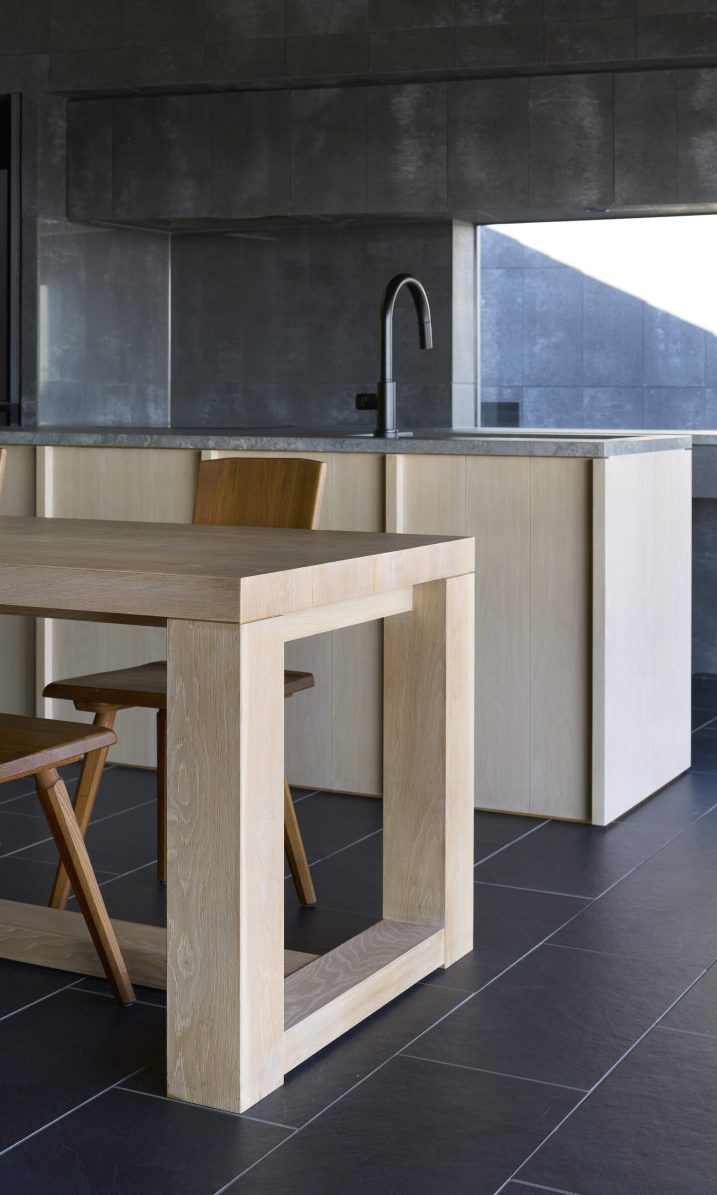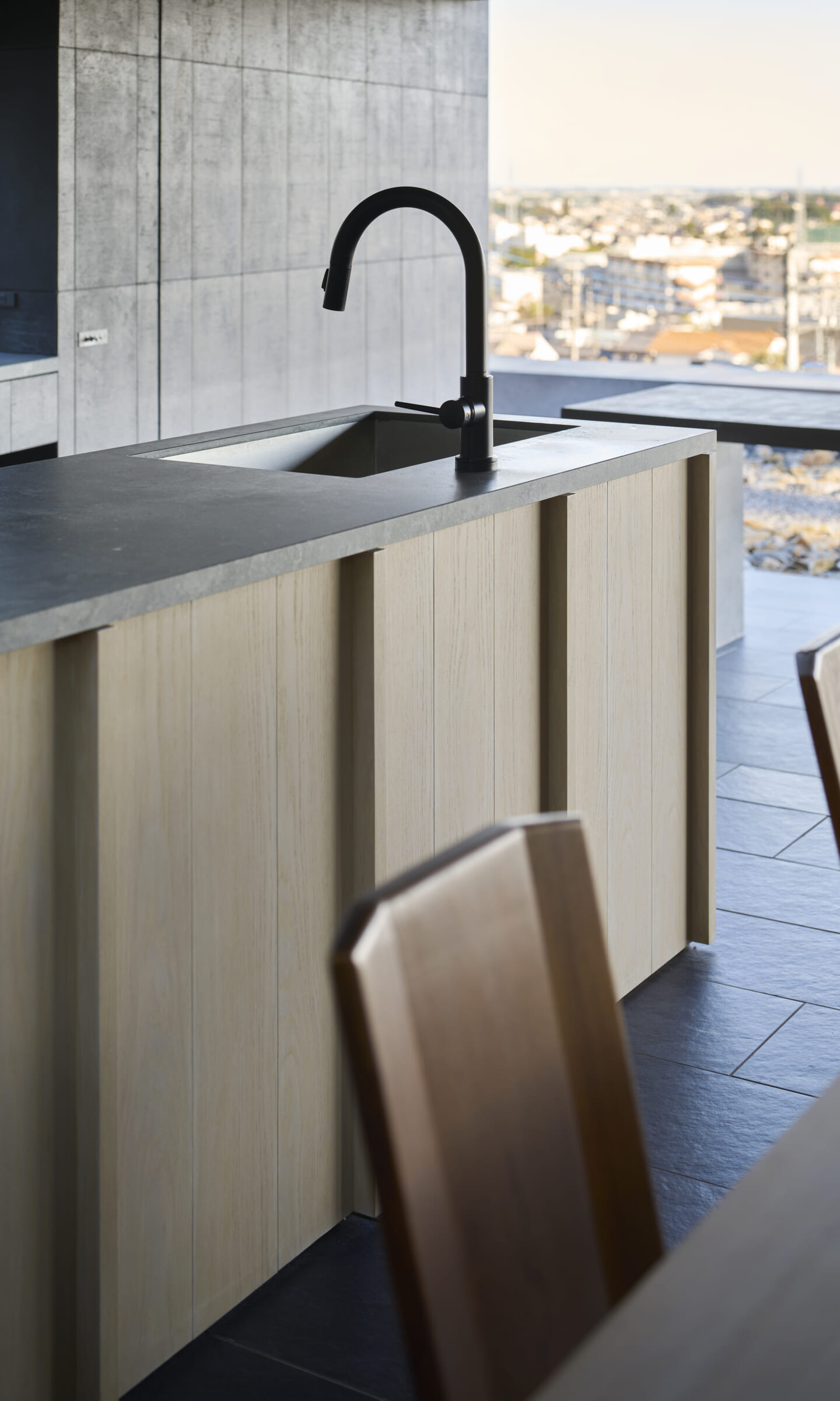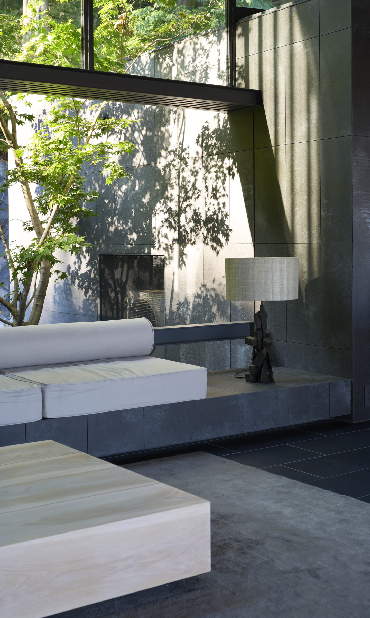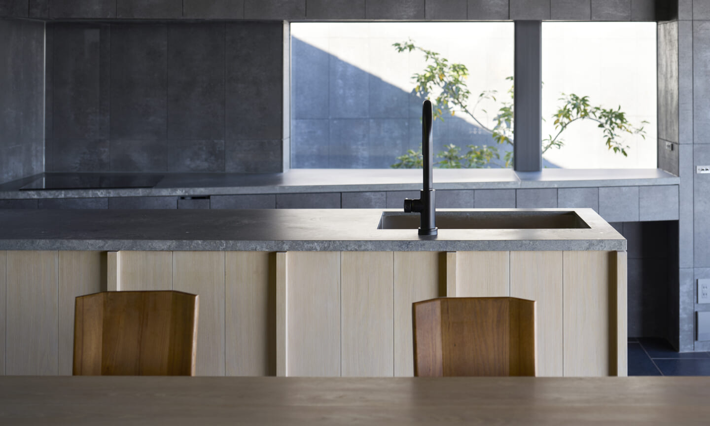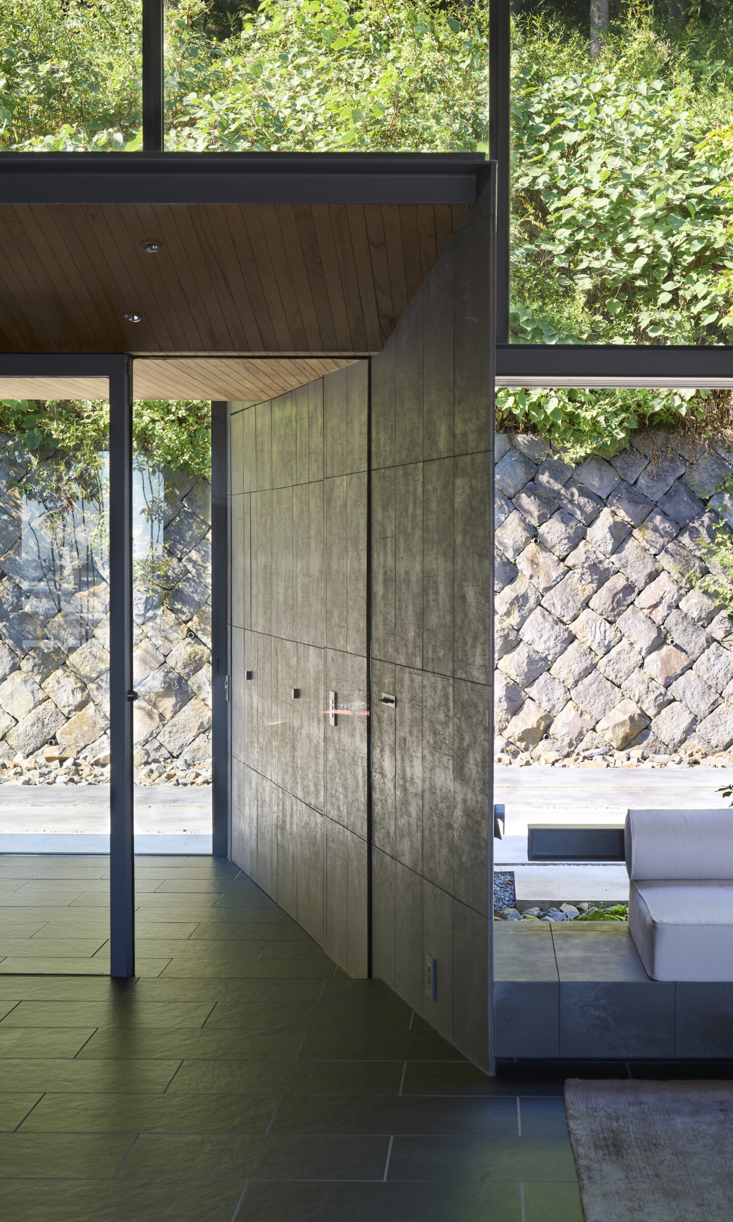 近隣との距離を保つことが難しい国土の狭い日本において、壁や屋根は外的環境から住まい手を守り隠す重要な要素となるが、この住まいの壁や屋根は、人工的な風景であるまちと大自然の間で、住まい手に新たな環境との共存を促す柔らかな隙間を作っている。