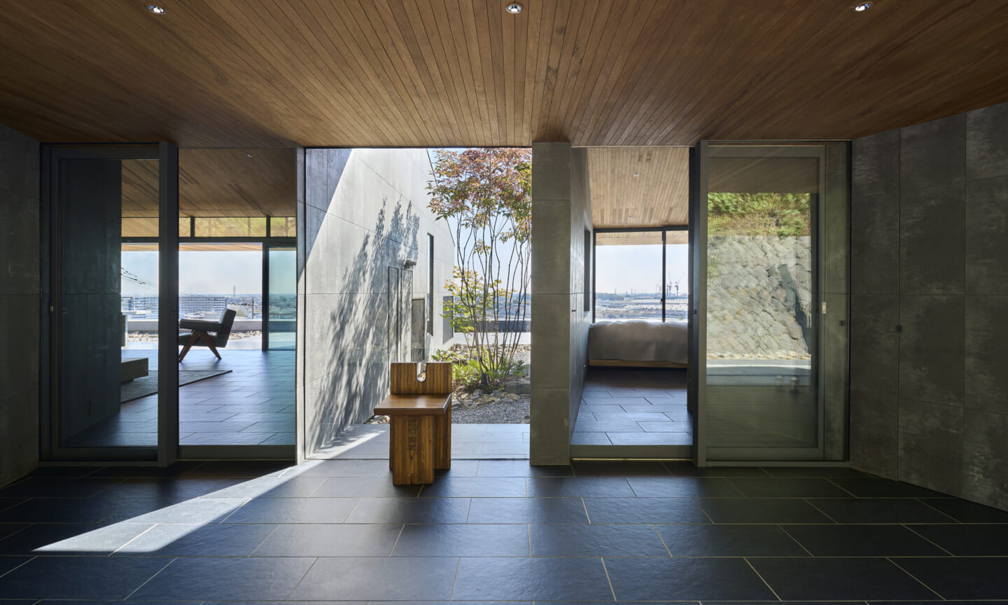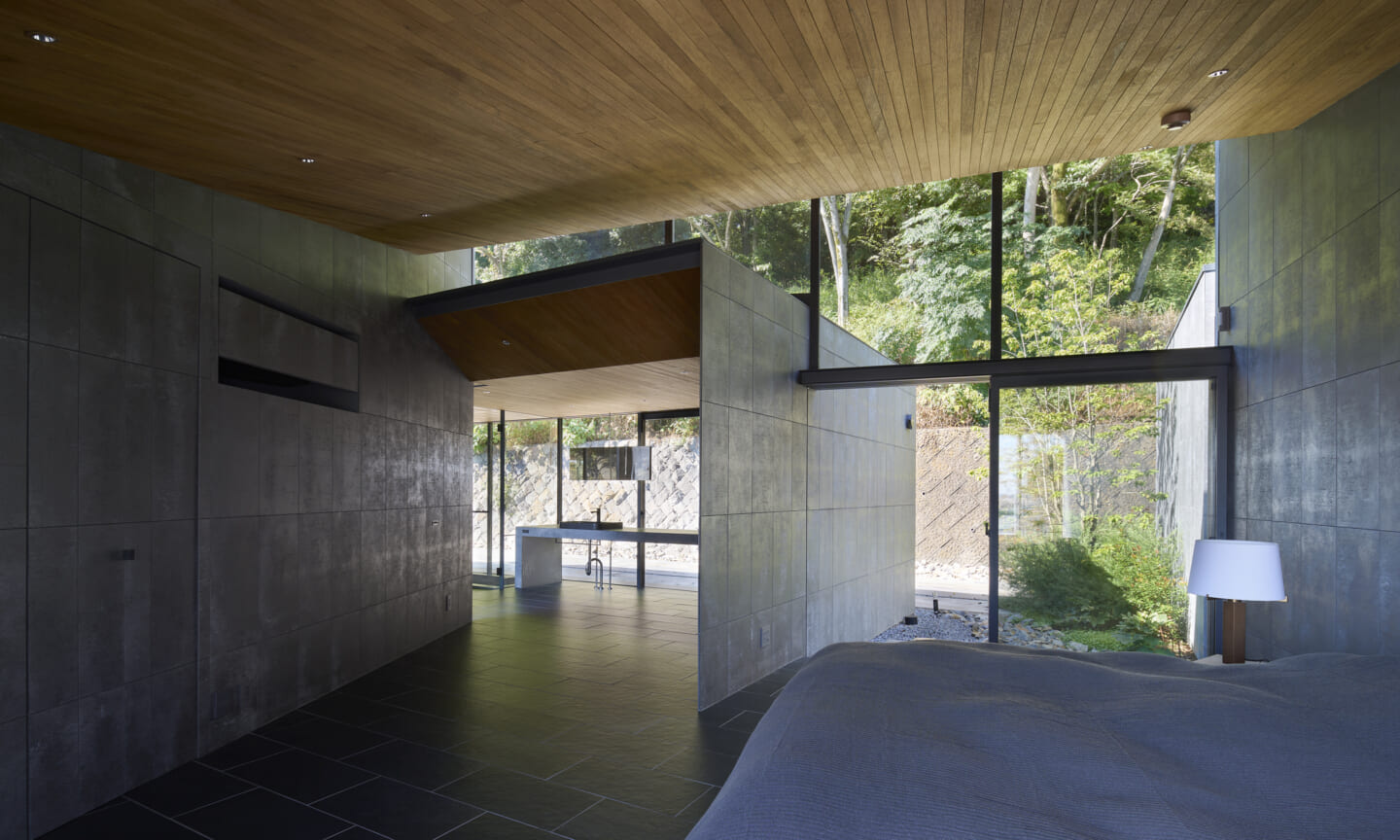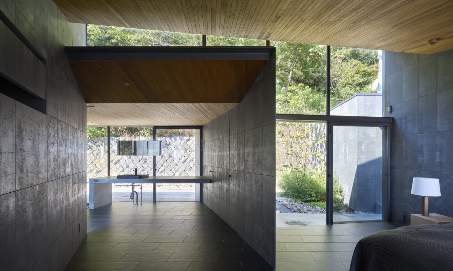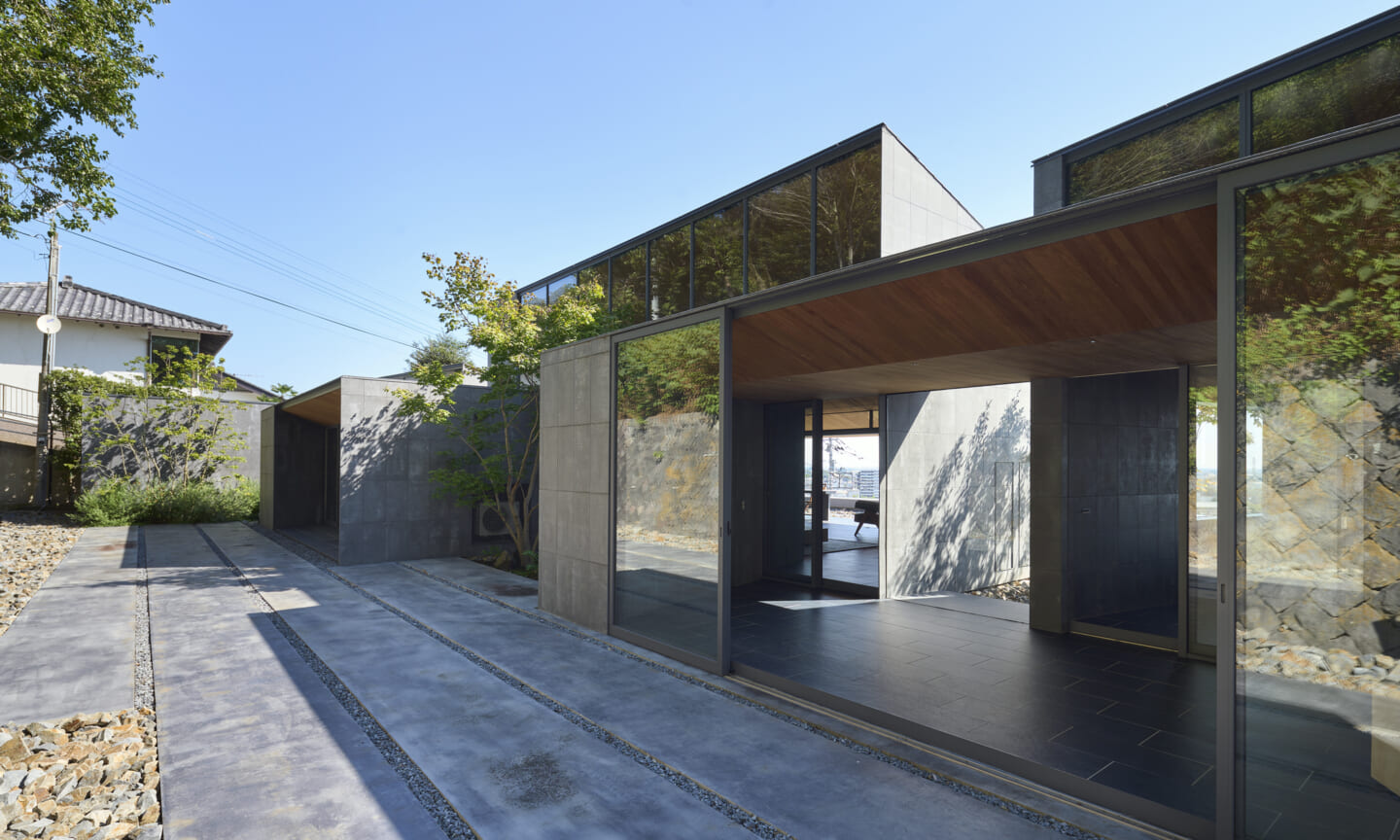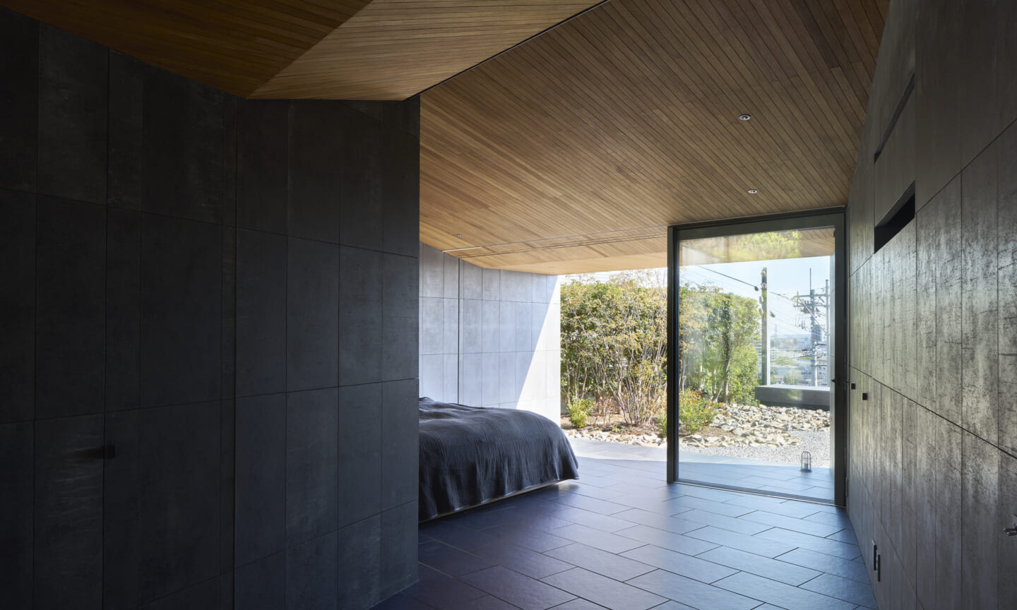 三角形の鋭角に尖る壁によって風景に奥行きを持たせ、室内に光のグラデーションをつくる。かたや逆方向からは厚みのある壁が適度に風景を遮り風景を切り取る。屋根の勾配は、敷地の眼下にあるまちと、敷地から見上げる山に対して片流れとし、壁と共に風景を絞り、南側からの強い日射を抑え、北側からの安定した光を室内に取り込んでいる。また、高さを抑えたエントランスと水周りのボリュームを、高いボリュームの寝室とLDKの間に差し込むことで、高さ方向でも閉ざして開くという感覚が、風景の移り変わりを生み出している。