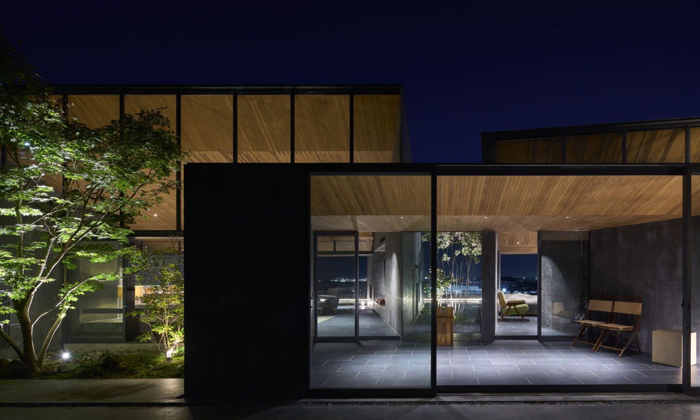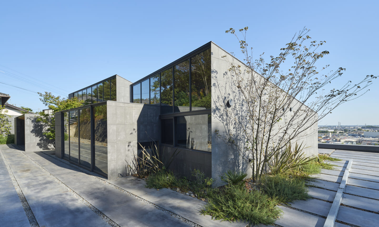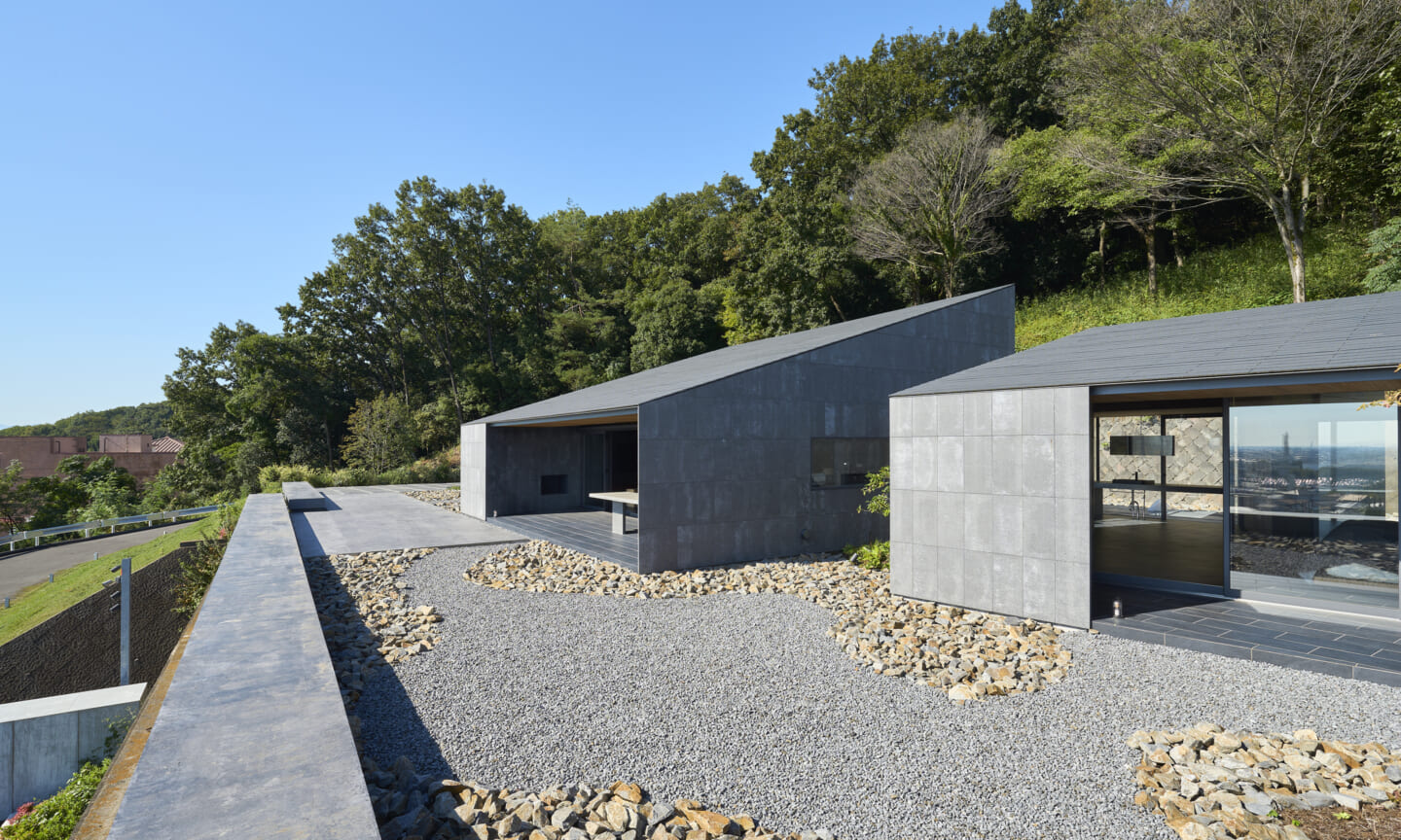 敷地は関東平野を望む斜面地の最上段である。眼下に広がる都市の風景と、背後の山に挟まれる場所に夫婦と母親が暮らす2世帯住宅を考えた。大きく景色を切り取ったワンルーム空間にしたくなるような環境であるが、住まいにそれぞれの用途を持った居場所が存在するように、その居場所にもまた、それぞれにあう景色が存在する計画とした。平面計画では、日本庭園に用いられる『閉ざして開く景観展開』を建物に落とし込み、景色と居場所を完全に分断しないことに配慮しつつ、5つのボリュームが連なる形状とし、場所にあわせた厚みのある壁によって空間が緩やかに仕切られている。