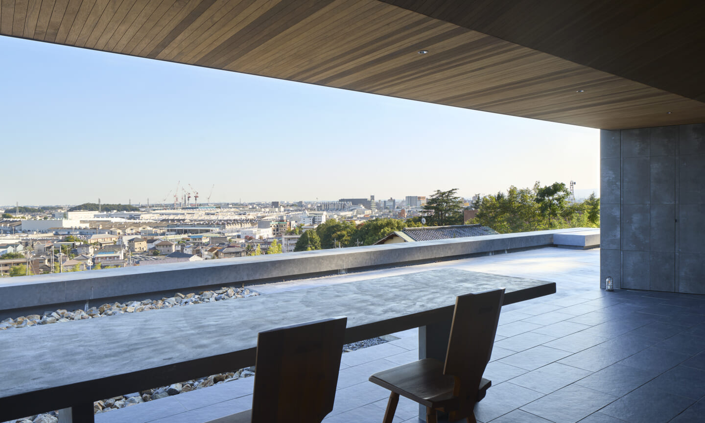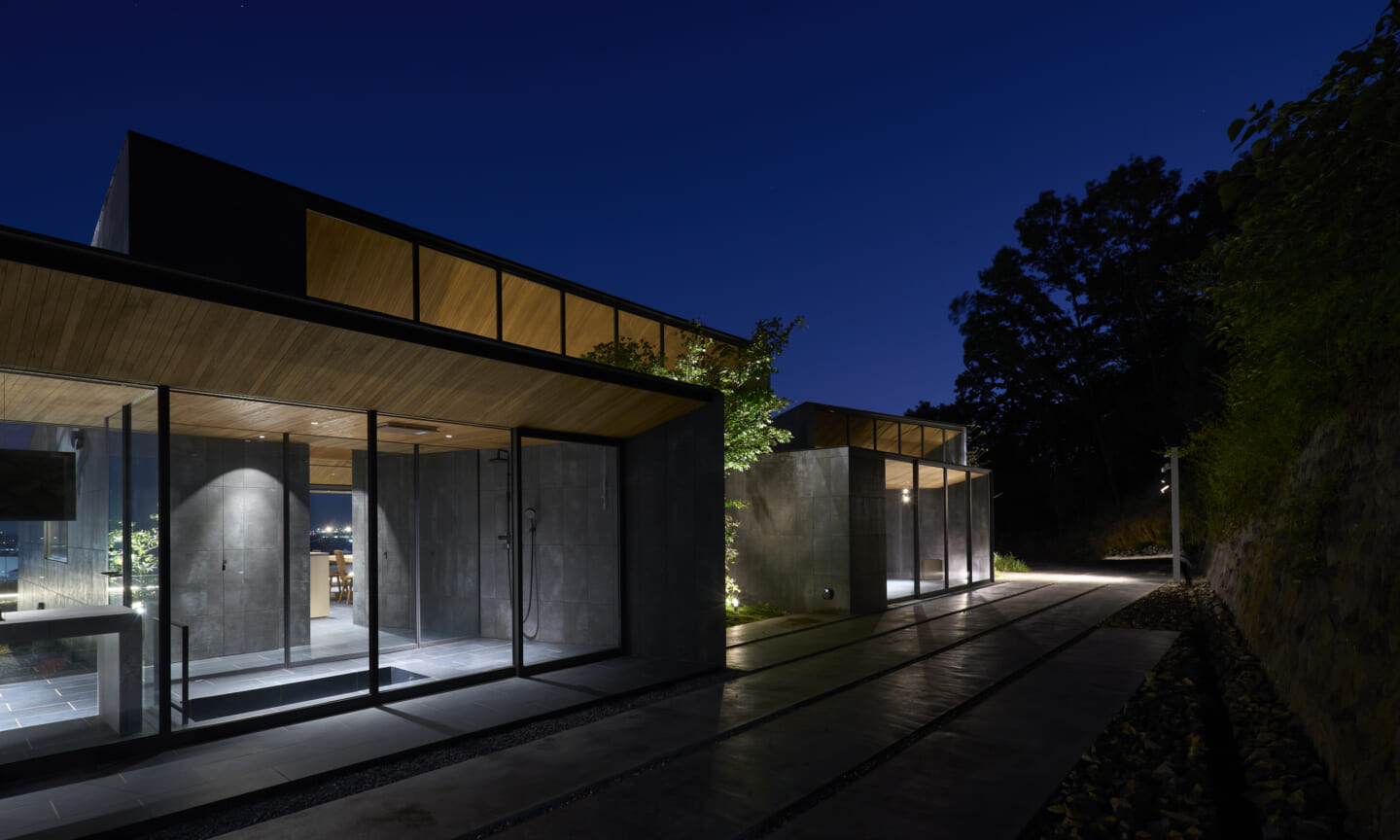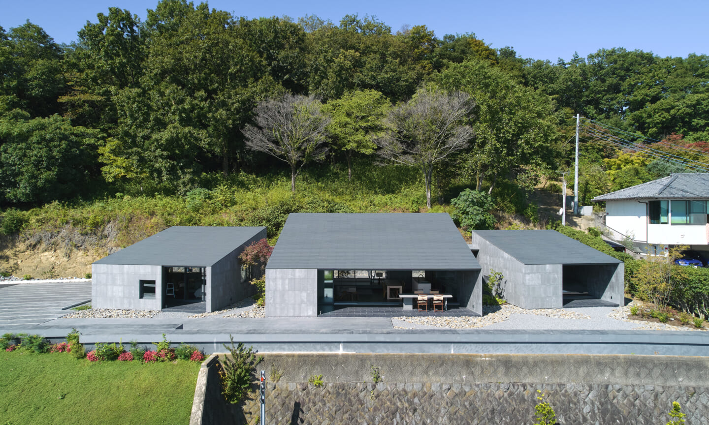 敷地は関東平野を望む斜面地の最上段である。眼下に広がる都市の風景と、背後の山に挟まれる場所に夫婦と母親が暮らす2世帯住宅を考えた。大きく景色を切り取ったワンルーム空間にしたくなるような環境であるが、住まいにそれぞれの用途を持った居場所が存在するように、その居場所にもまた、それぞれにあう景色が存在する計画とした。平面計画では、日本庭園に用いられる『閉ざして開く景観展開』を建物に落とし込み、景色と居場所を完全に分断しないことに配慮しつつ、5つのボリュームが連なる形状とし、場所にあわせた厚みのある壁によって空間が緩やかに仕切られている。