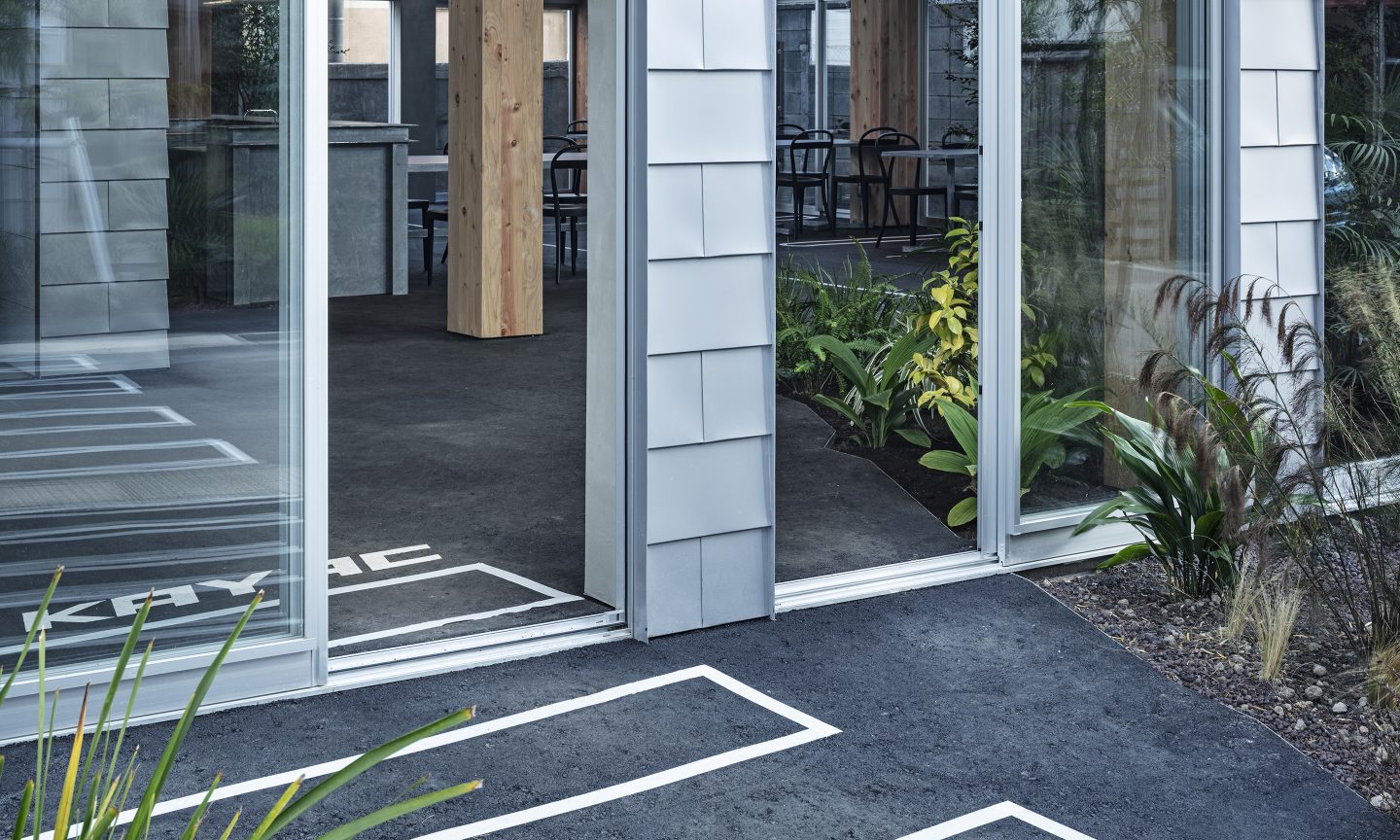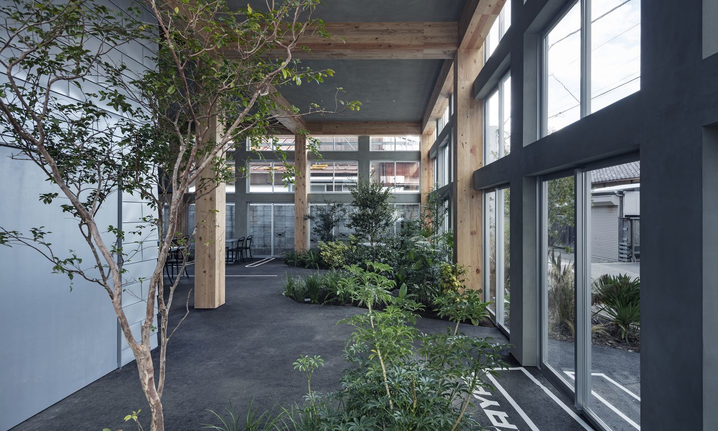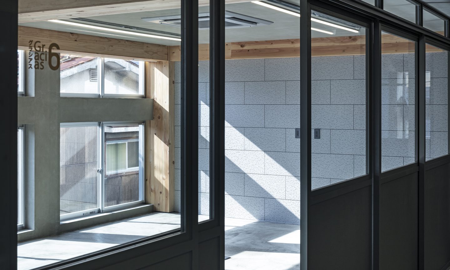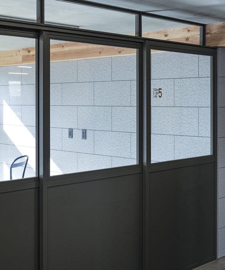 住宅に頻繁に用いられる、アルミサッシやガルバリウム鋼板、木造の柱梁など、一般住宅で見慣れた材料を集積し、スケールの操作を行うことで、どこか見慣れたことのある雰囲気を持ちながらも、オフィスとしての新鮮さを作り出すことを試みた。