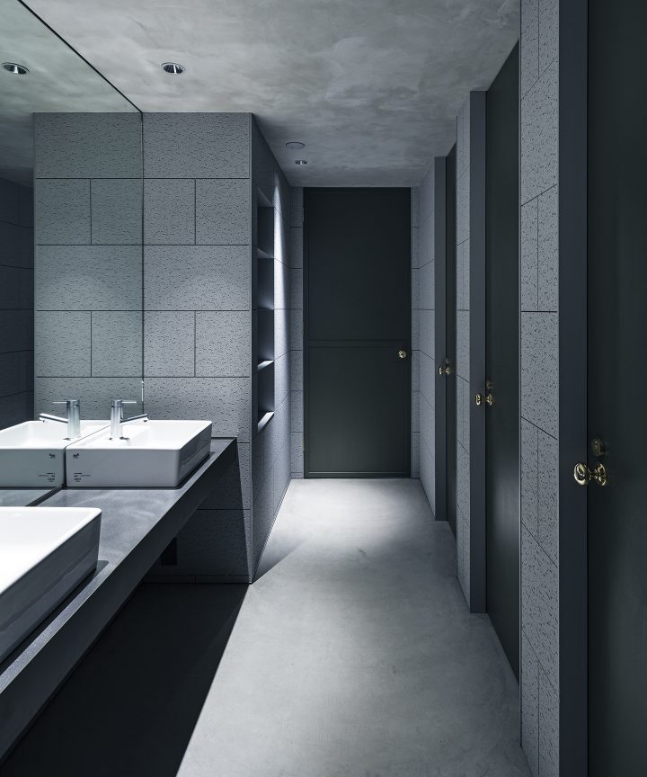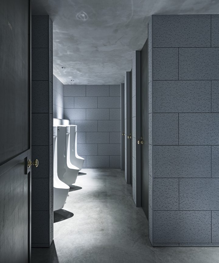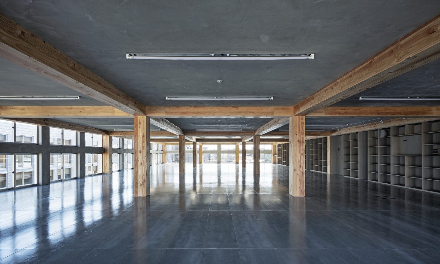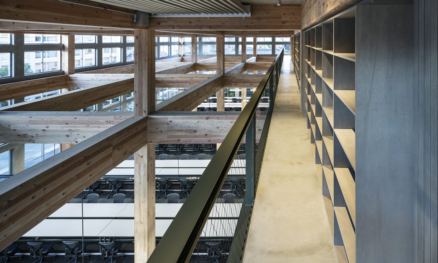 道路を挟んで建つ2棟を繋ぐように、各棟の1階床仕上げを道路と同じくアスファルト舗装とし、建物内部にまちの要素を引き込み内と外、まちとオフィス、仕事と生活、社員とまちの人、社内と社外の関わりを助長する空間を目指した。