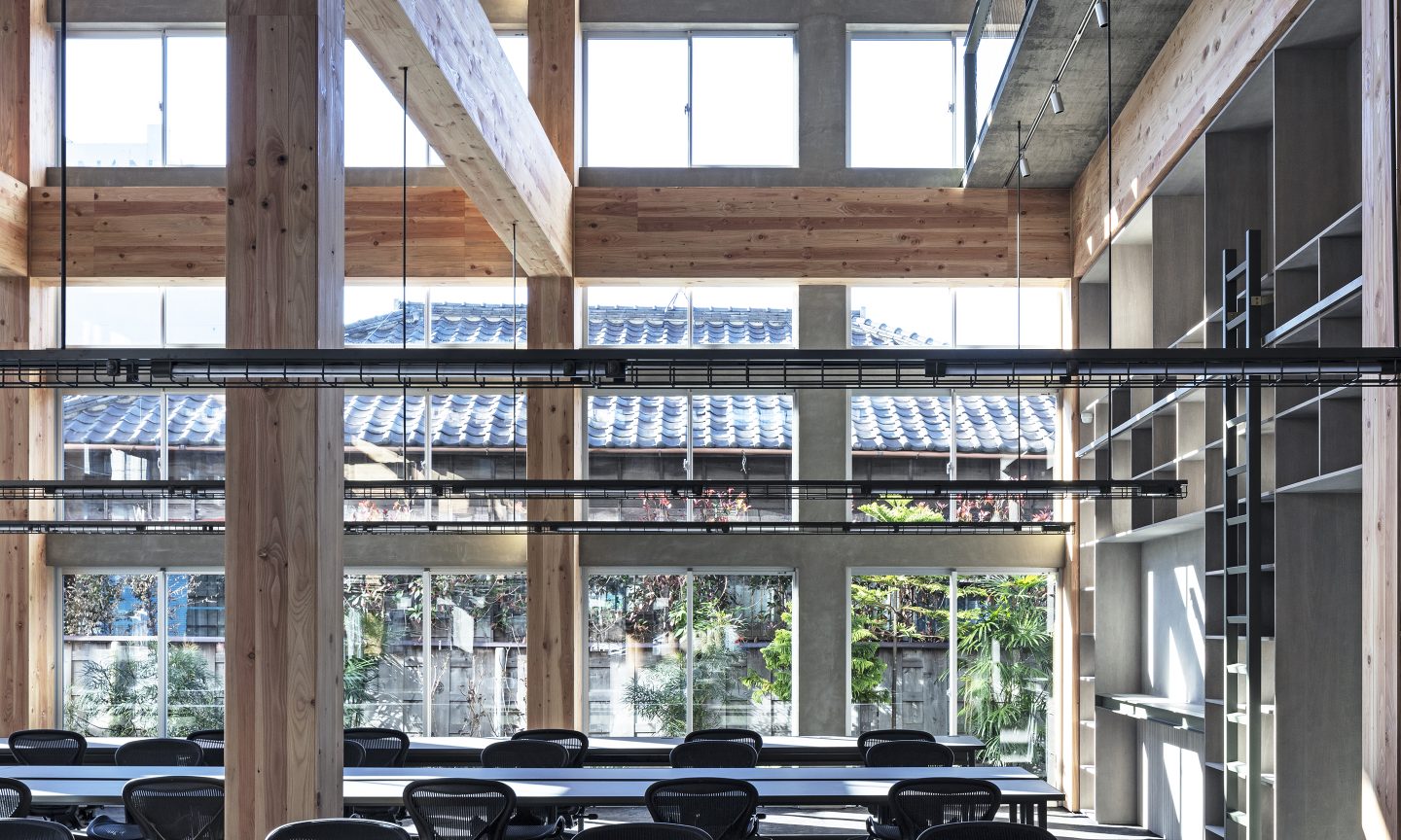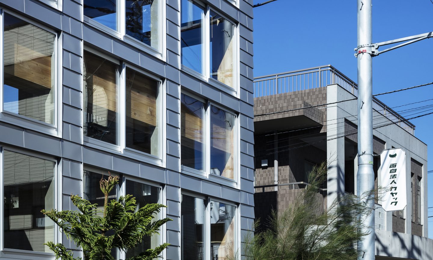 鎌倉のまちには、面白法人カヤックのオフィスが点在している。まちの社員食堂、まちの保育園、分室など、分散された機能によって、まちがオフィスとして機能し始め、現代ならではのつながりを生み出す。敷地周辺の家屋も分室として使われており、住宅とオフィスの境界が曖昧になっている状況から、周辺環境のもつコンテクストを新しいオフィスに、とりこむ計画とした。