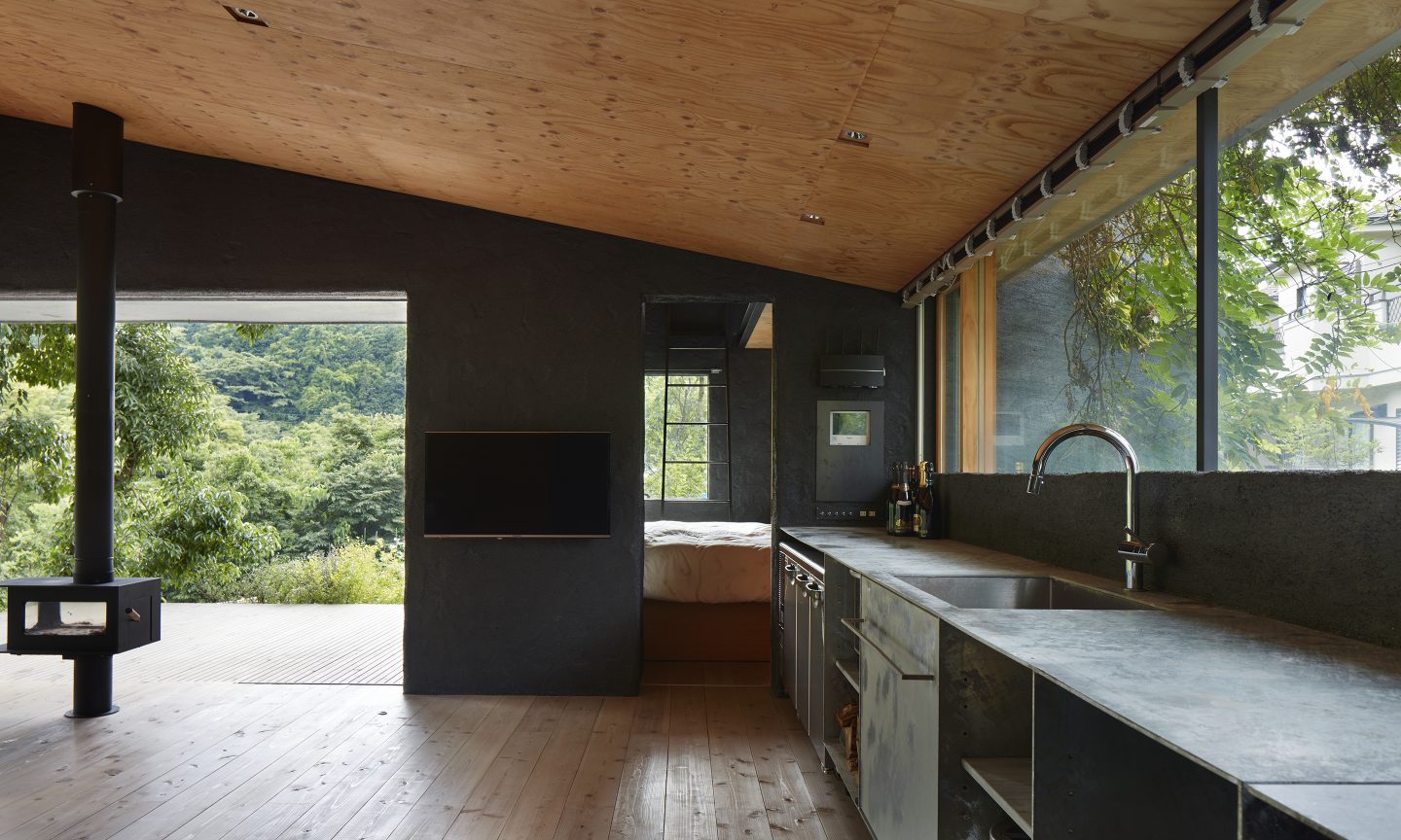 その他、眠るための場所と必用最低限の水回りそれぞれをボリュームとして、ずらしながら配し、各々のボリュームに屋根をかけることで建築の形態が自然と導かれた。屋根勾配によって垂れ壁を構成し、開口上部に暗がりを作り出すと同時に、木造でありながらL型の大開口を実現することで、暗がりのある静かで落ち着いた室内と風景とが、一体化する構造形式を採用した。