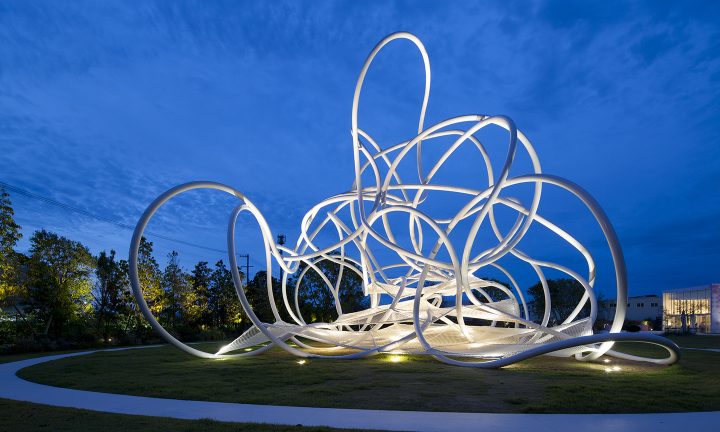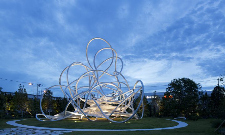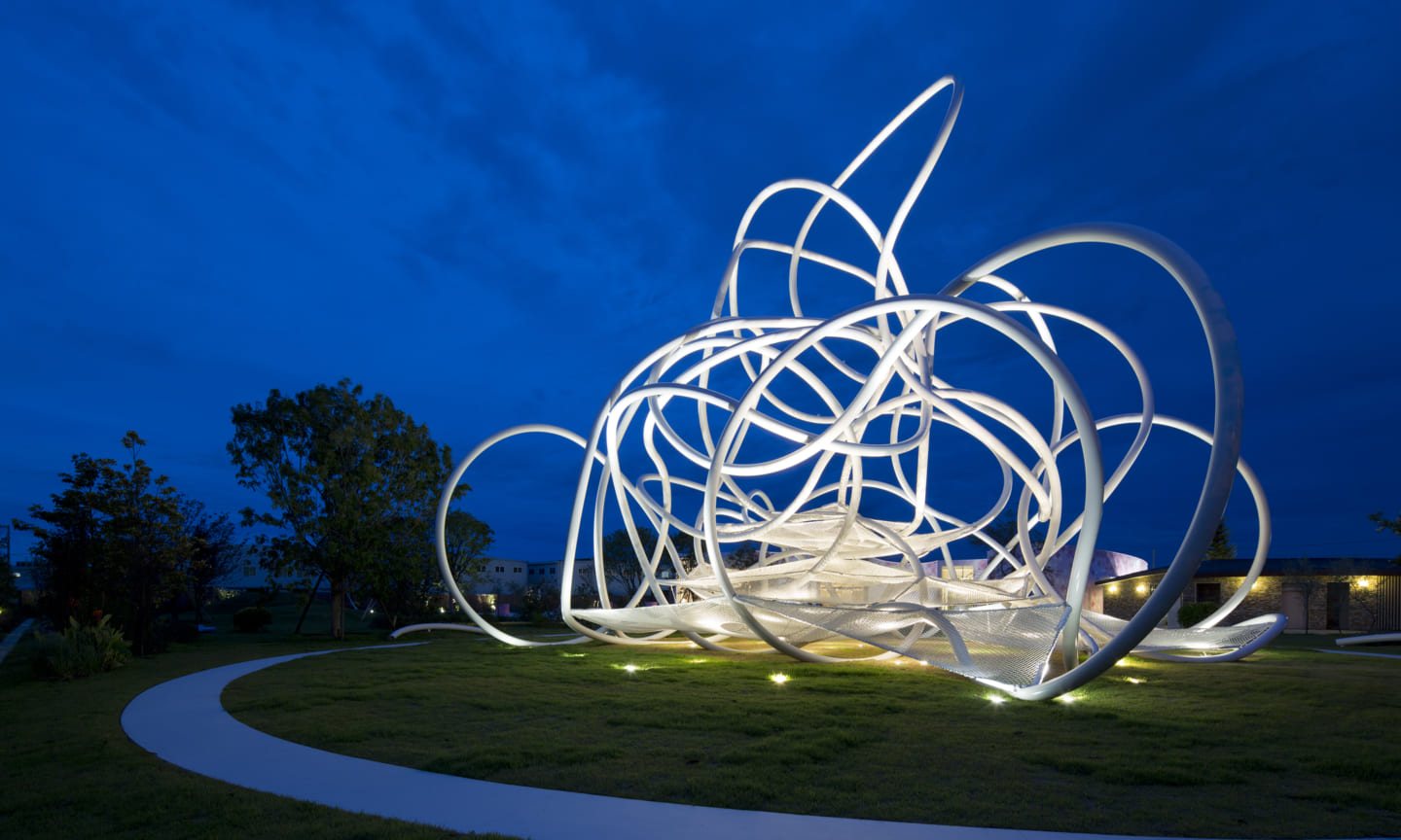 r=3,000mmで加工されたひとつのパーツの角度を変え、ジョイントしていくことで、複雑さの中にある多様な形を可能にし、円滑な施工性を担保している。計画は今後、隣の敷地へと拡張され、建築という木々の上にカフェや図書館が建築されていく。自然のように日々変化していく移ろいという概念を建築が手に入れたことによって、自然と同様にこの建築は環境と共に成長し続け、人々に愛される存在になるであろう。
