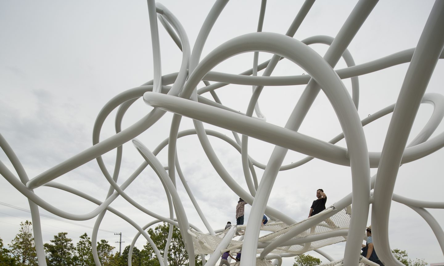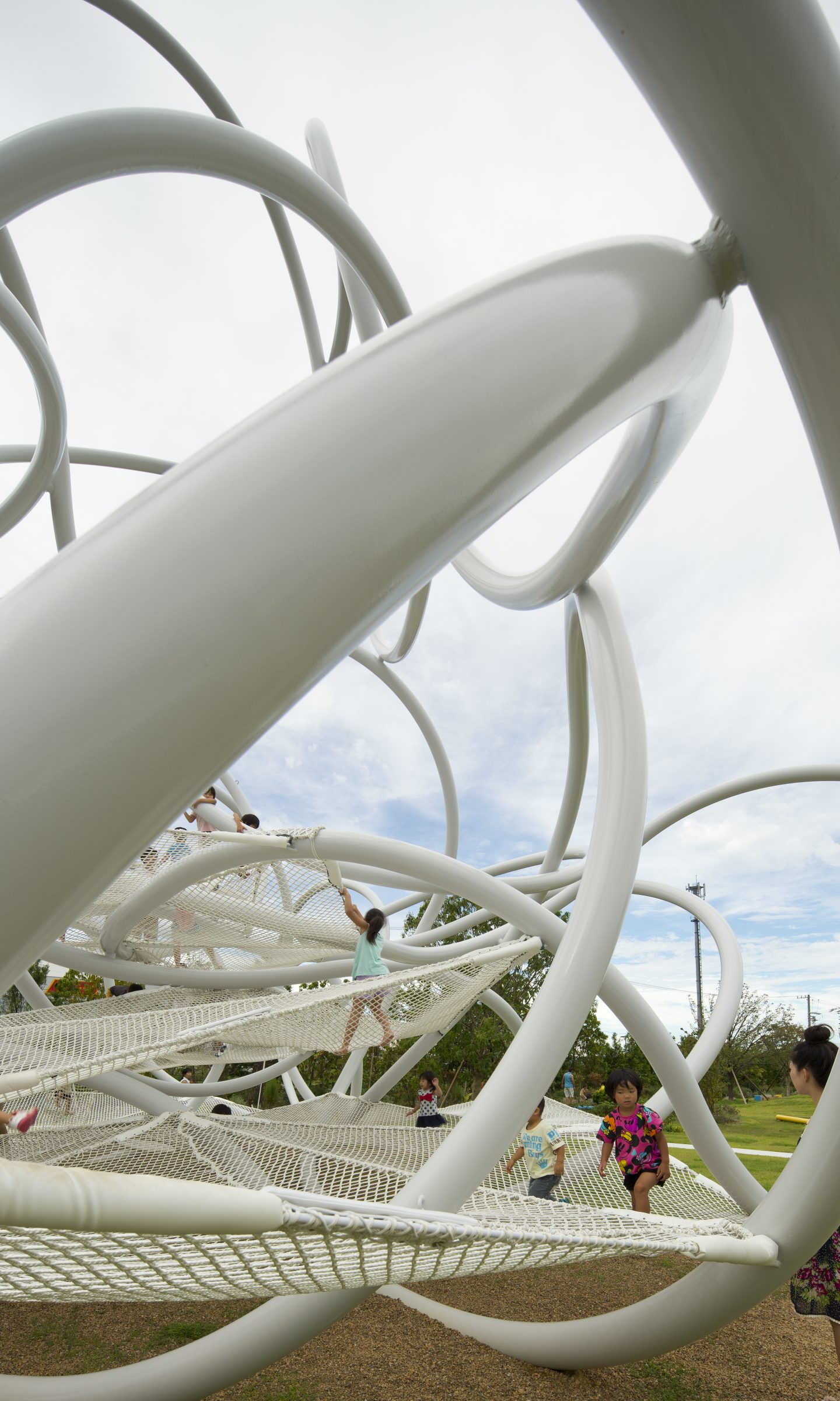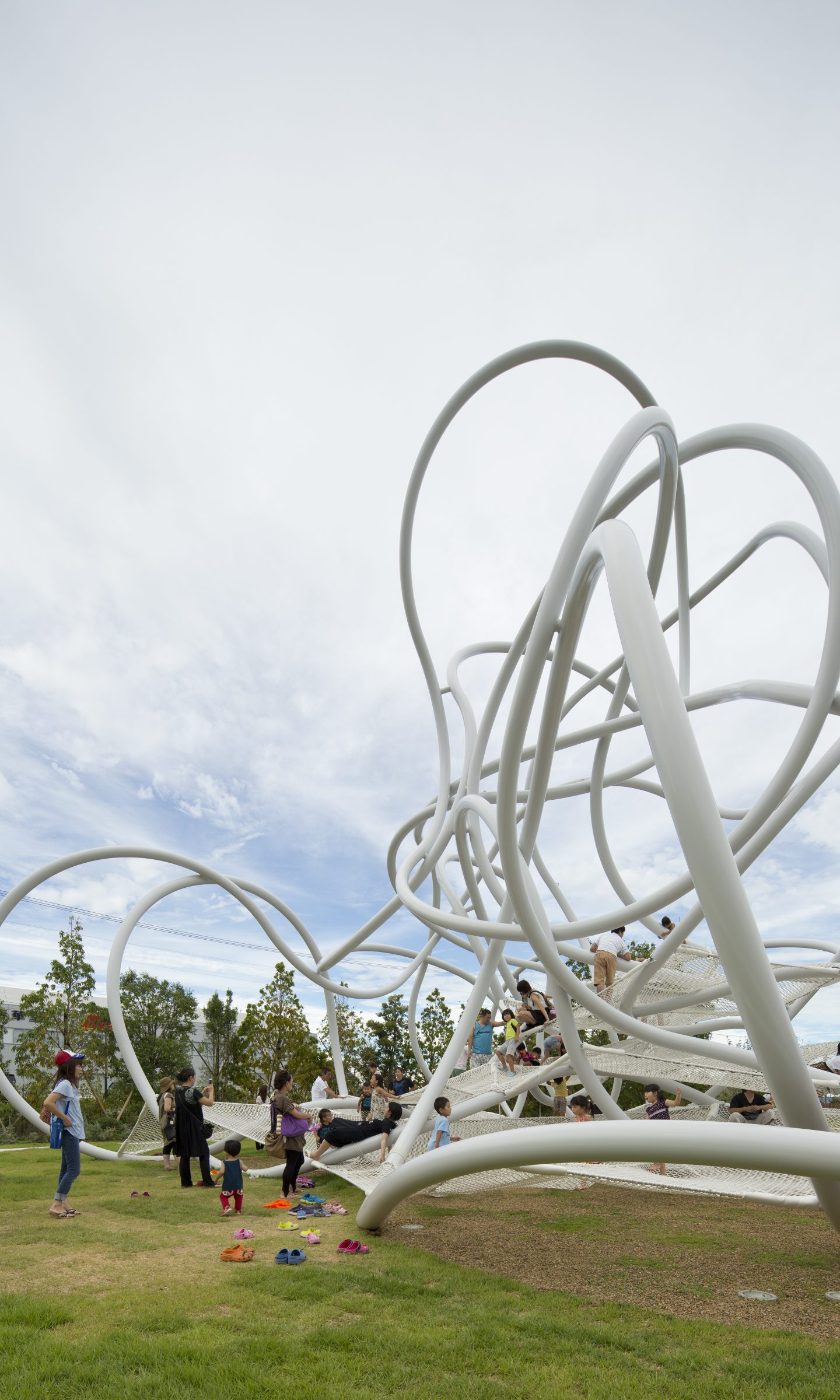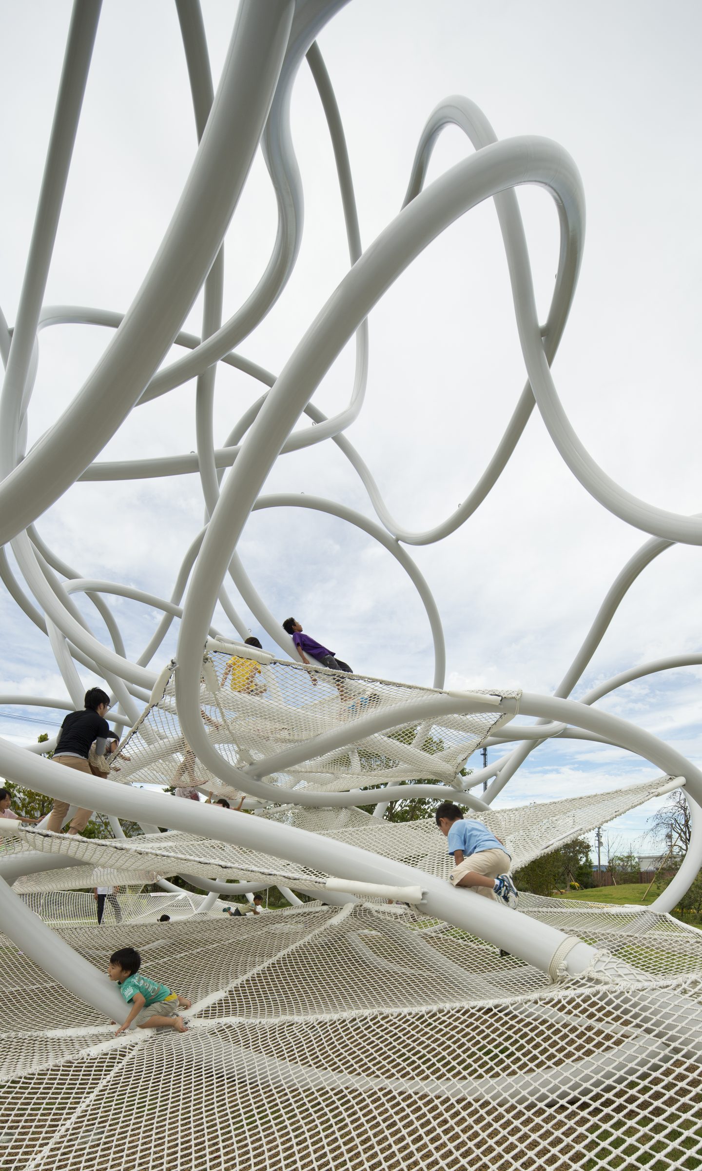 木々にネットをかけて、そこを登ると遊具になり、腰をかけると家具として、遠くから鑑賞するとアートになるような、人の行為によって意味が多様化する建築を、ここでは「森」と呼んでいる。複雑に見えて秩序が存在する自然界の森と同様に、ある一定の秩序によってこの建築は成り立っている。