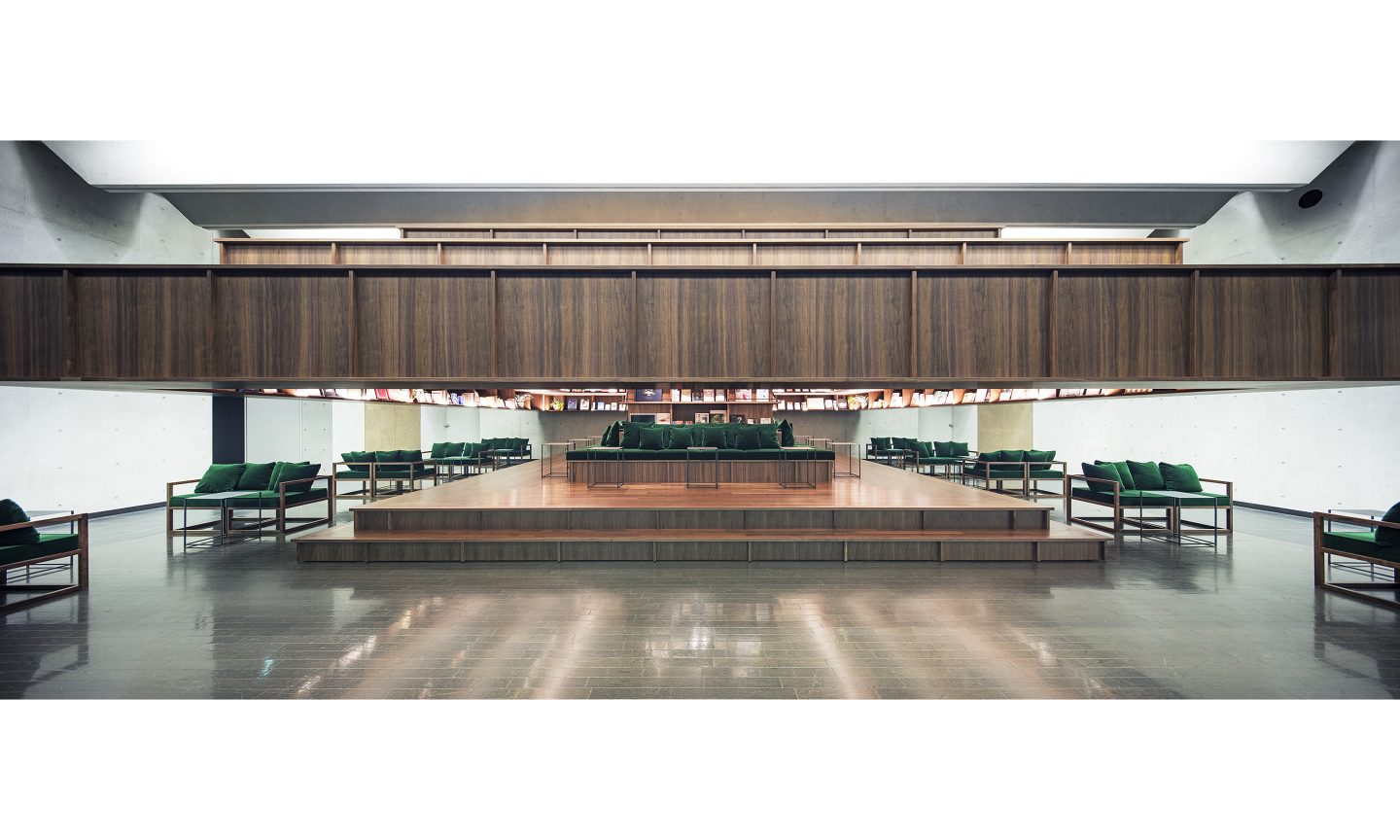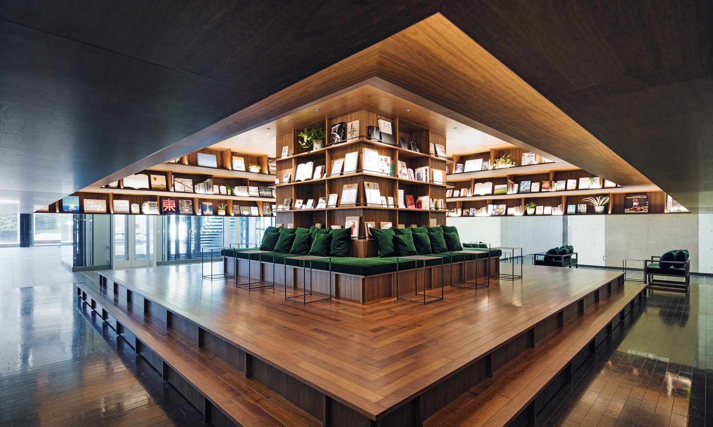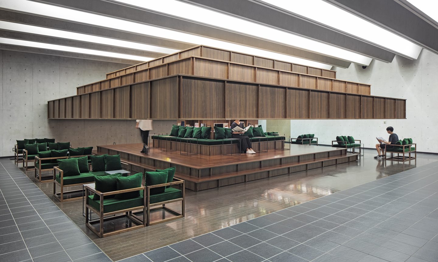 ステップを上ると360 度本に囲まれた空間が拡がっている。本を手に取りソファへと腰をかけ、本を開き、視線を落としてみると、深い軒先の向こうに拡がる、大学の風景とはつながりを持ちつつ、他者と目線をあわせること無く居心地の良い居場所で本を読むことができる。