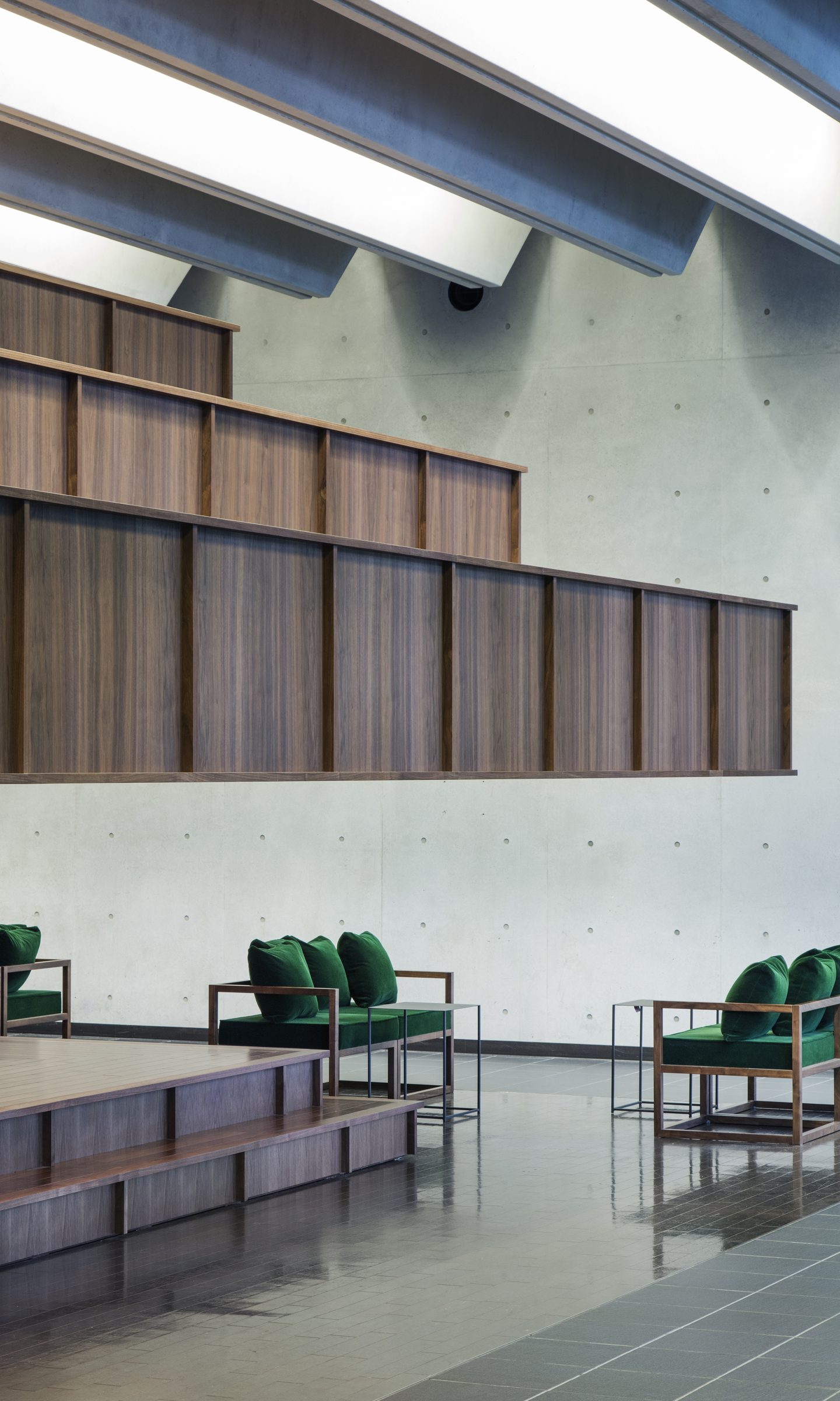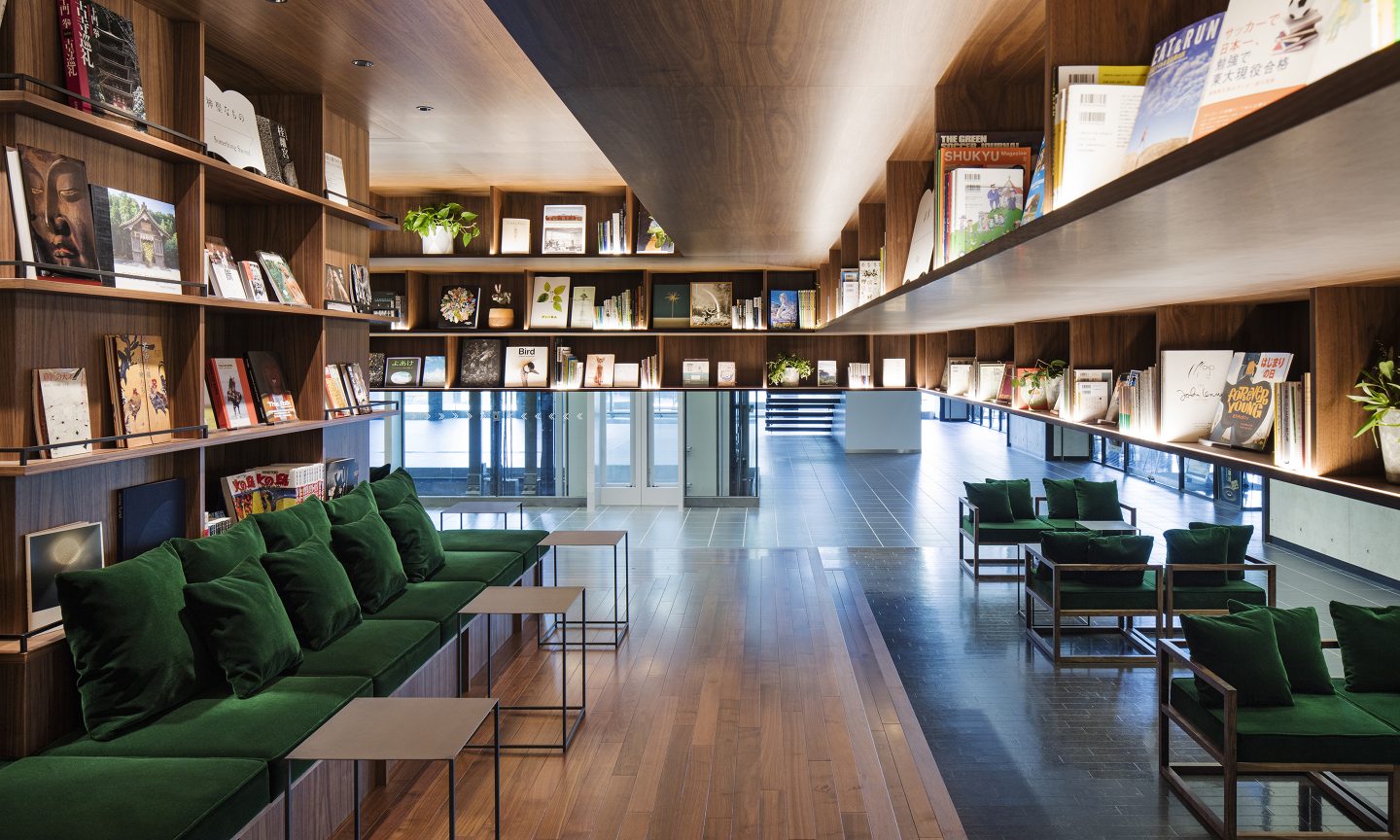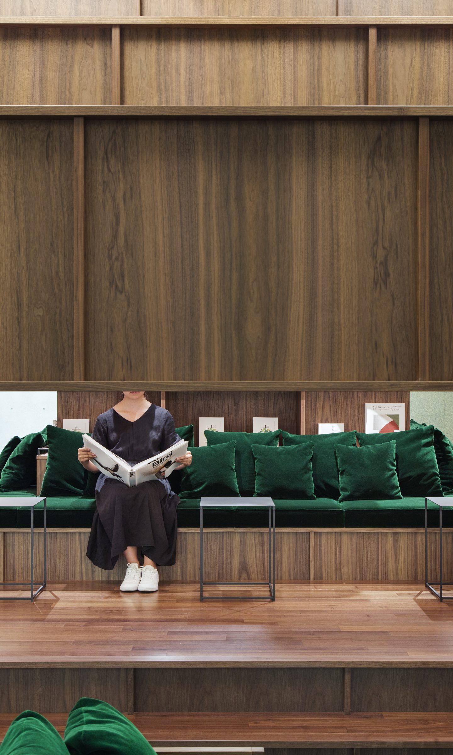 ステップを上ると360 度本に囲まれた空間が拡がっている。本を手に取りソファへと腰をかけ、本を開き、視線を落としてみると、深い軒先の向こうに拡がる、大学の風景とはつながりを持ちつつ、他者と目線をあわせること無く居心地の良い居場所で本を読むことができる。