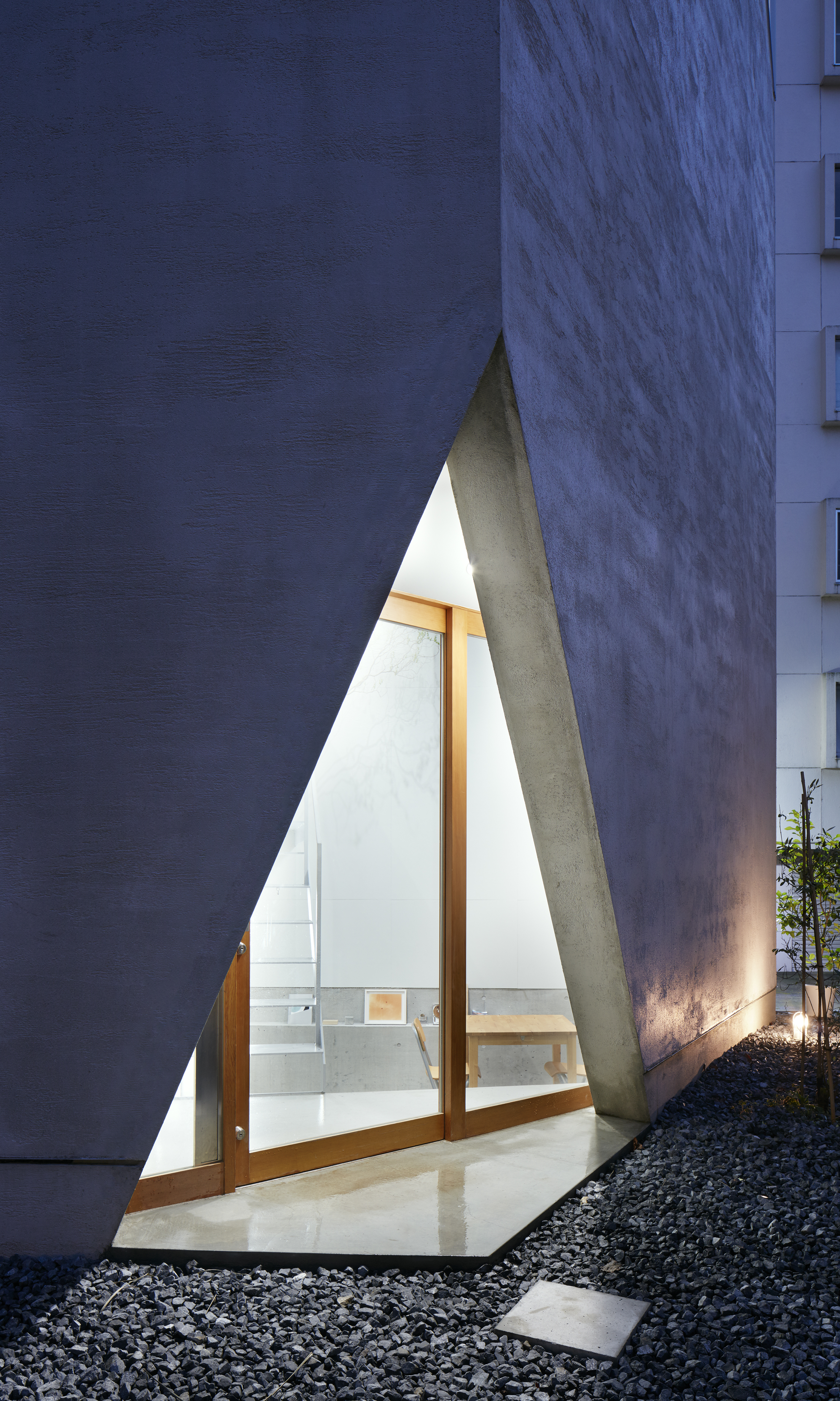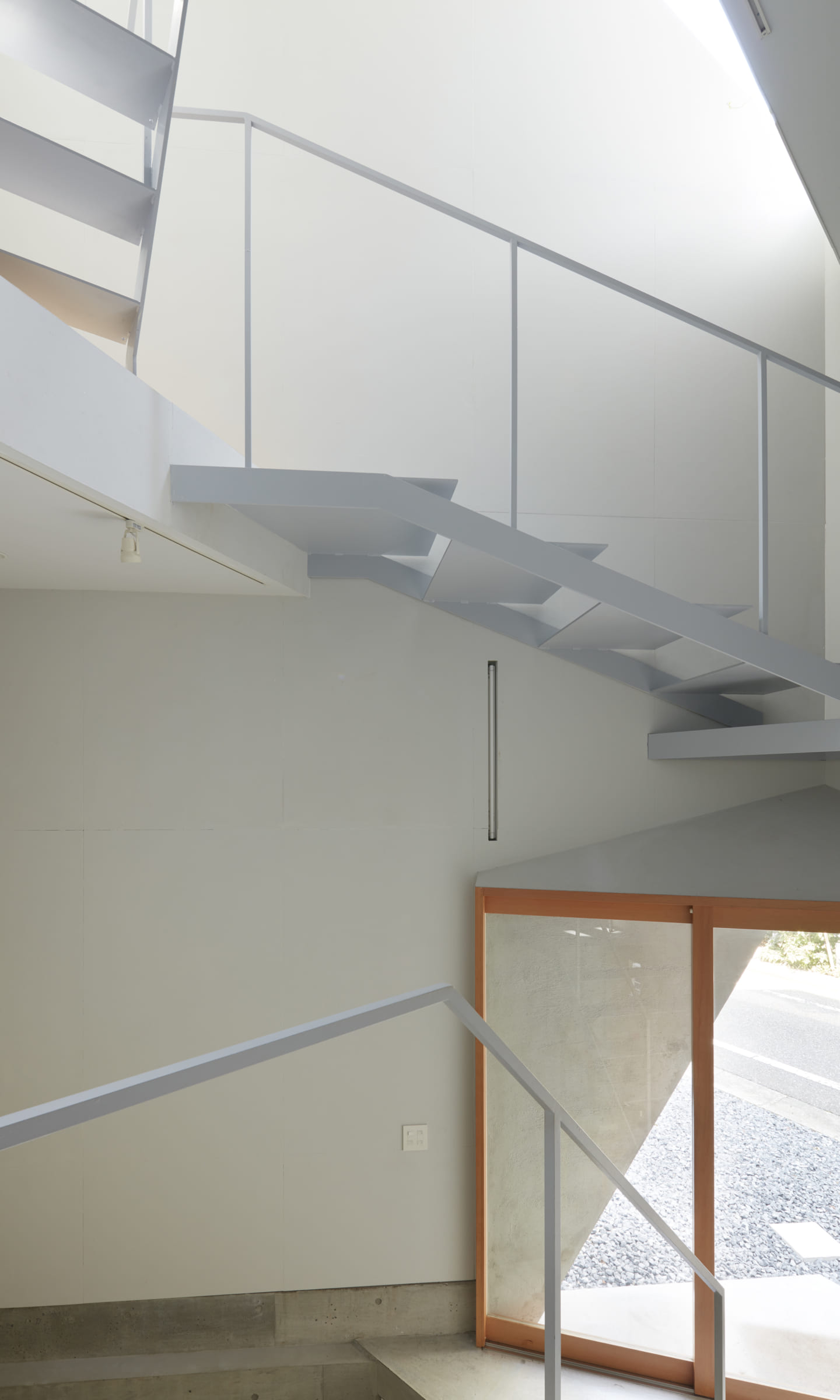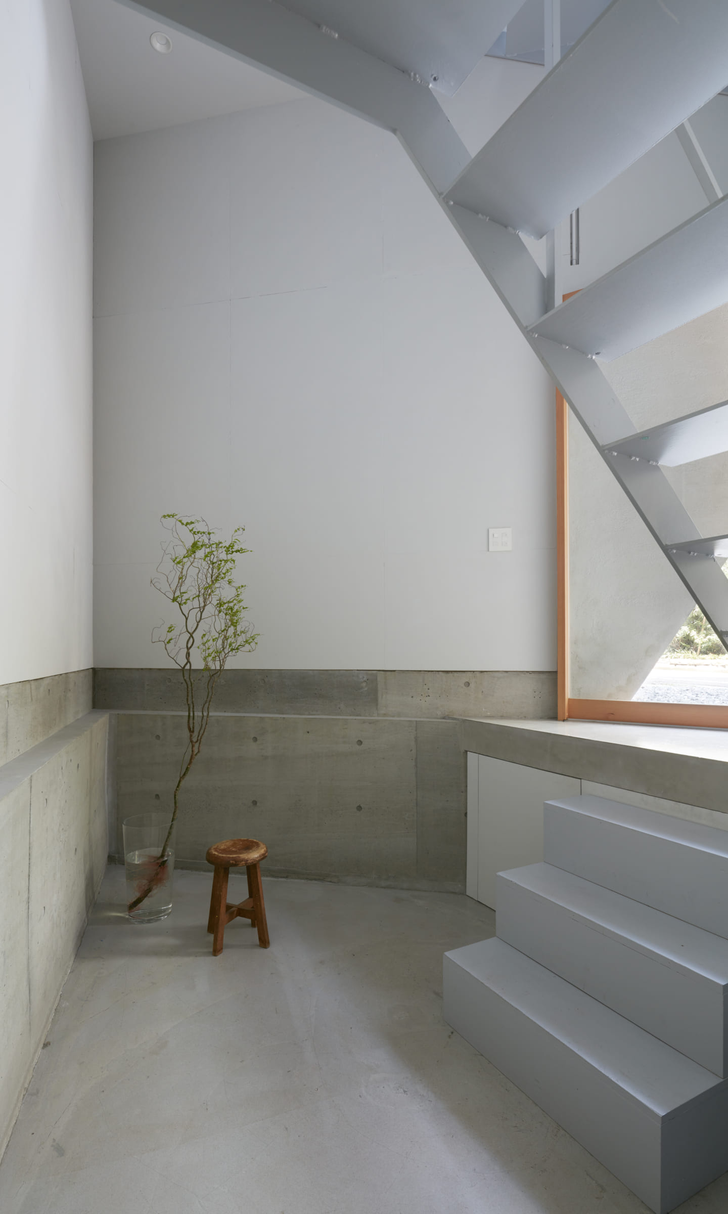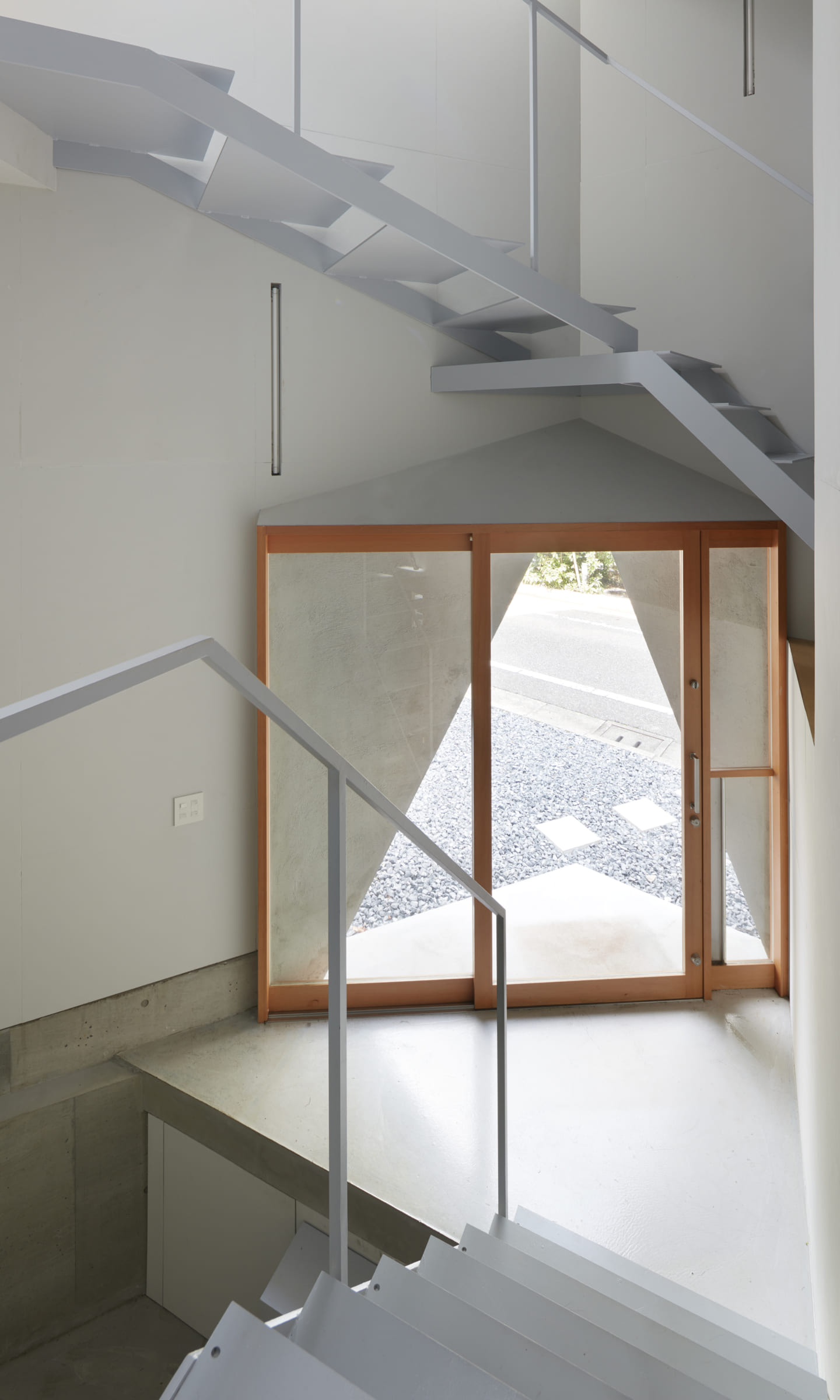 大きな階段室のコーナー部に切り取られた開口部は見る位置によって形がかわり、室内に予期できない光を導く。予期できない状況、その偶然性が存在するとき、人は新しさや発見に出会った時なのではないだろうか。小さな空間に大きな体験を生む、自然を内包した空間が生活を豊かにするきっかけを持っているのではないだろうか。