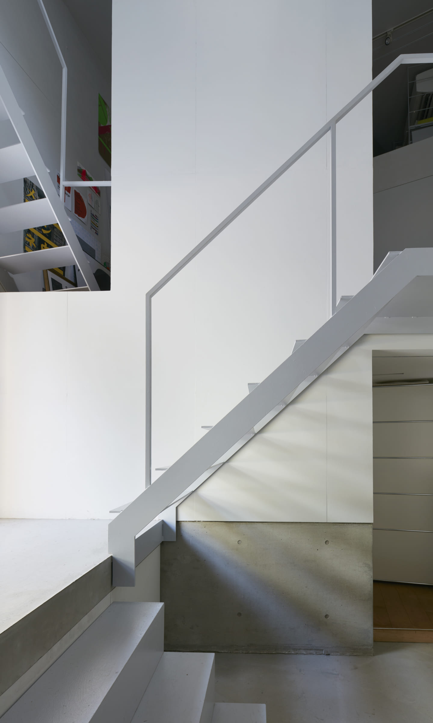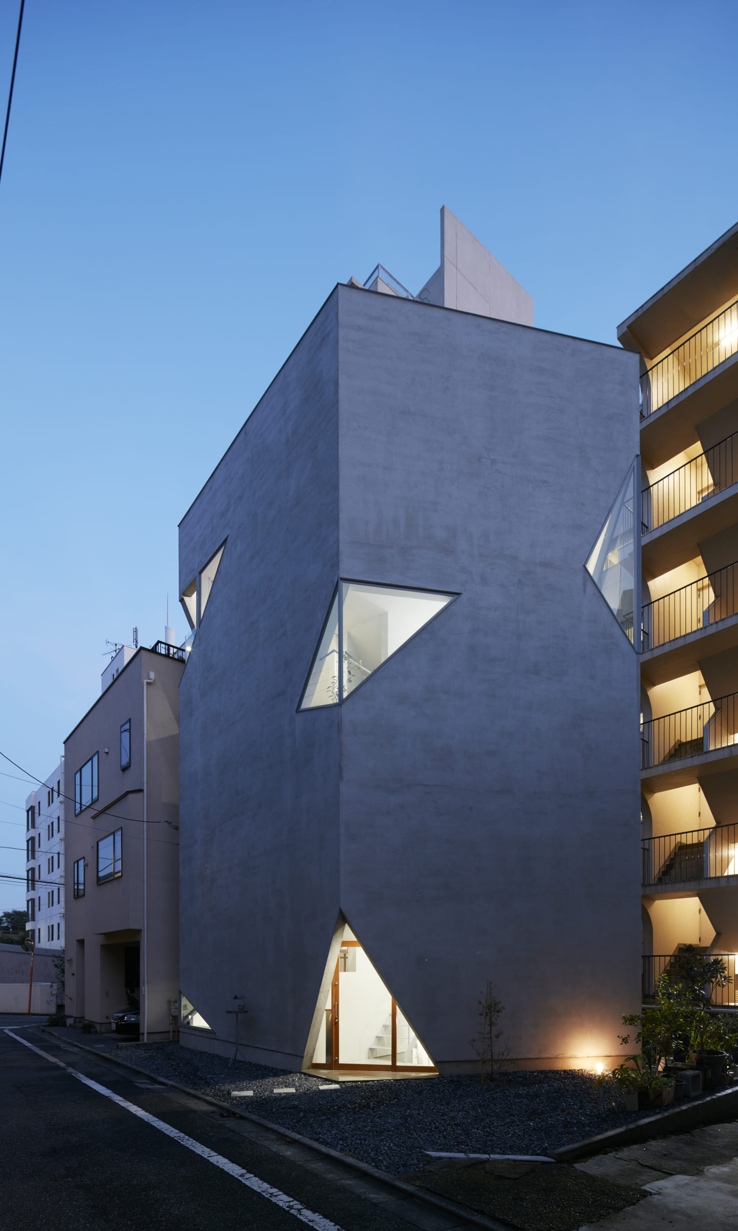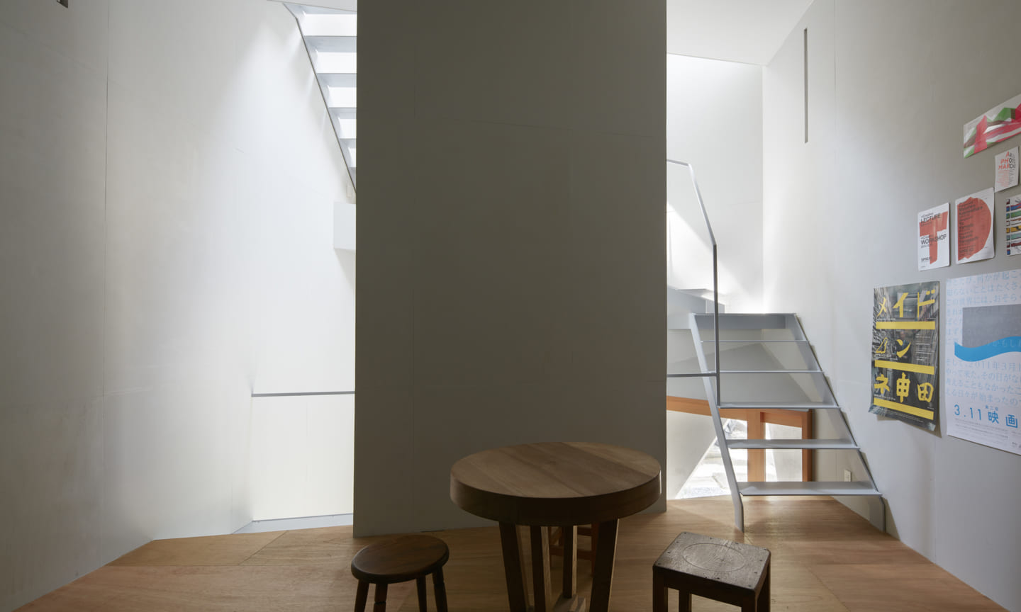 代々木上原の20坪の敷地に、アートディレクターのご夫婦と猫2匹が生活するための事務所併用住宅をつくる計画に際し、建主が建築家に与条件を伝え依頼するというかたちではなく、ものづくりという共通の観点から、互いにリサーチ、スタディ、計画を交える方法をとった。建築的視点とグラフィック的視点による、多様性が生まれる環境を設定しながら、設計者だけでは辿り着けない、設計のプロセス自体を設計した。そのやりとりの中で拾い集めた言語やスケッチ、模型で、住まいの中に山や谷、公園のような場所をつくり出すなど、求めるイメージが示唆された。日々の暮らしと仕事のための機能とそれらのイメージを建築で内包し、生活のすぐそばに公園のような大きな階段室がある構成が生まれた。この構成が階段の登り降りによる体を動かす体験や、家を出て事務所に通勤するような距離感を生んでいる。ある場所は事務所、ある場所はリビング、ある場所は本を読むための場所というように、時間や季節、行為によって居場所を選べる人工的自然環境とも呼べるような住まいである。