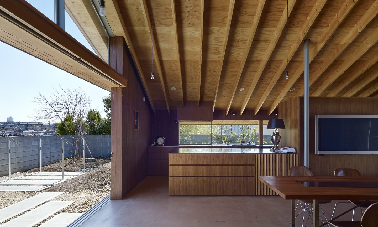 千葉市の閑静な住宅地の小高い丘の上に建物は建っている。周囲よりも少し高いところに敷地があるため、隣地に運動公園の緑地や、街への眺望が獲得できる恵まれた環境下での計画である。既存住宅は、大きな庭のある築35年余の木造二階建てで、今回の計画においてスペースの拡張と、新しい和風について考えて欲しいとの要望から、我々は計画を始めた。