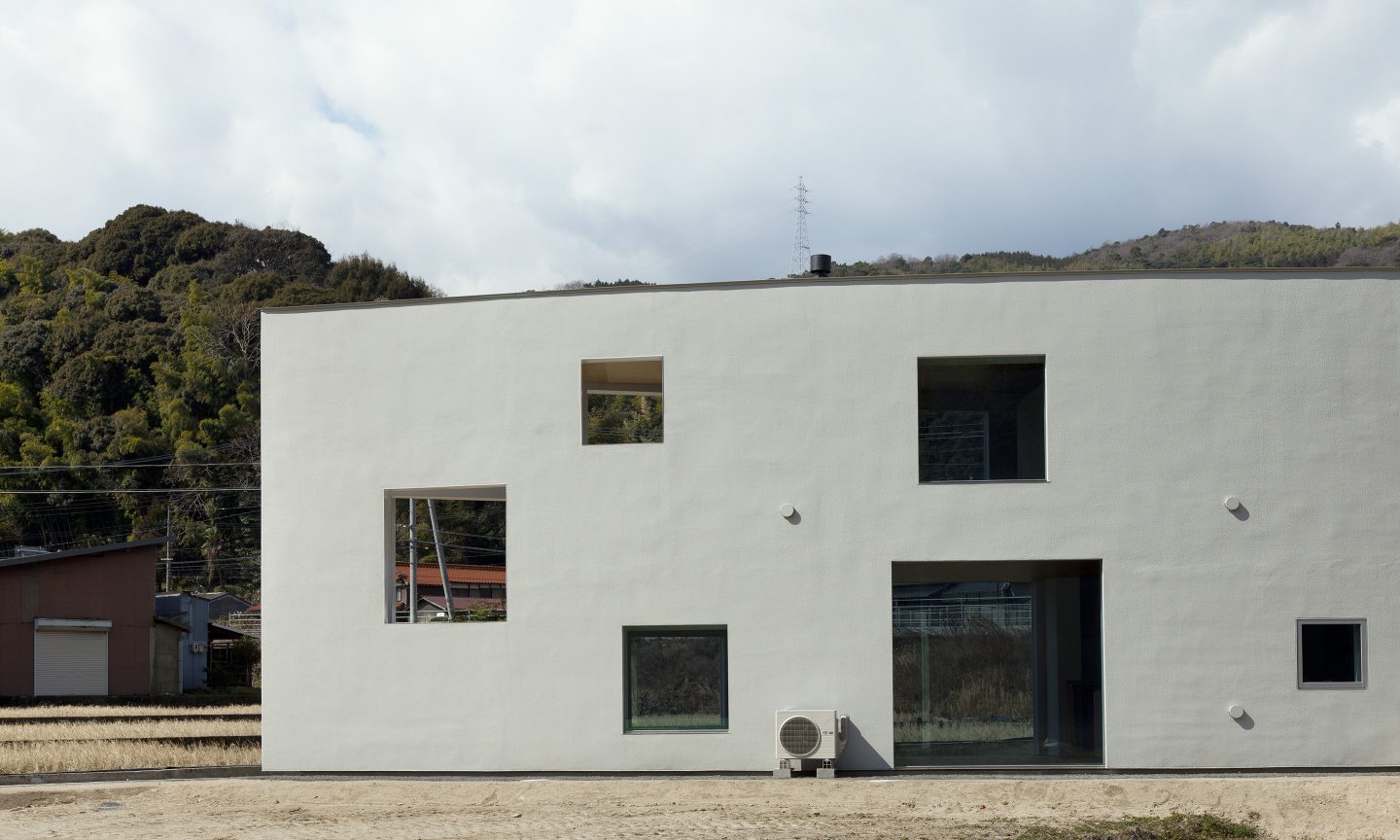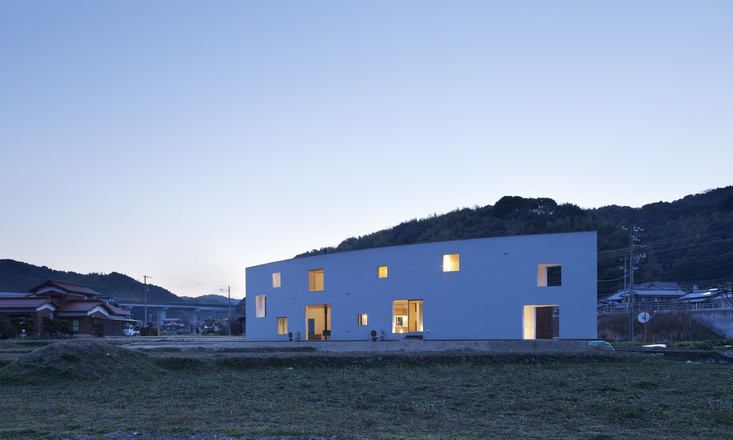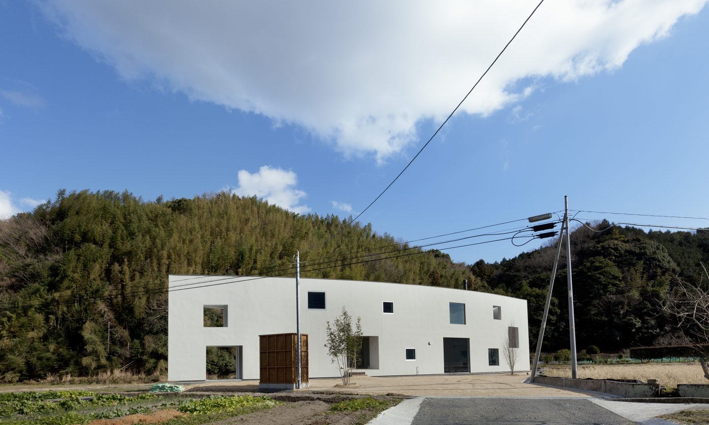 敷地は、山と山に挟まれた谷状の場所に広がる田畑の中に位置します。一見どこまでが敷地で、どこからが隣の敷地なのか見分けのつきにくい場所に対して、壁のような細長いボリュームを可能な限り敷地いっぱいに建てることを考えました。するとたちまち壁のような建築の両側には、性格の違った自然が敷地をとび越えて存在し始めます。壁より道路側には少しパブリックな自然ができ、反対に壁より山側には少しプライベートな自然が出来ることになります。大きな自然の中に壁のような建築を建てることで、ゆるやかに自然を分ける操作です。