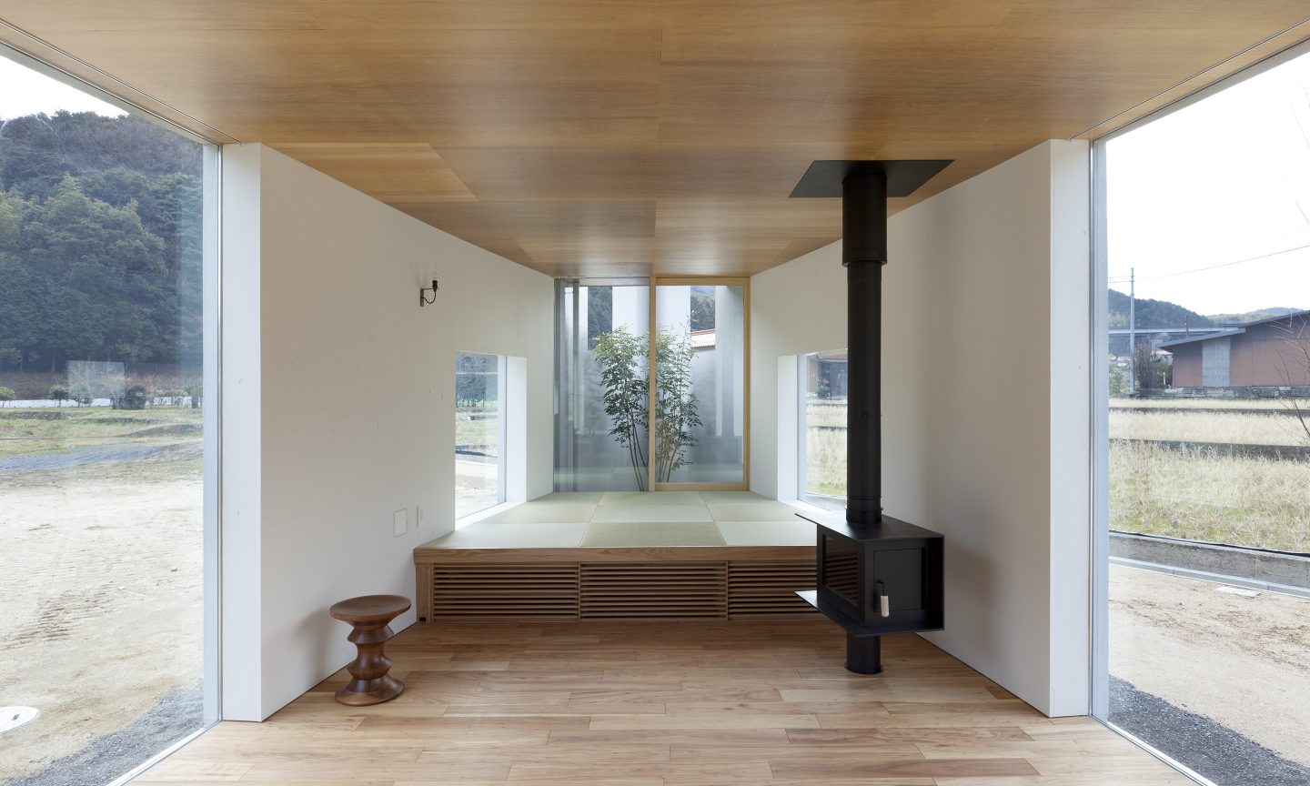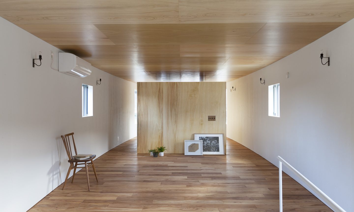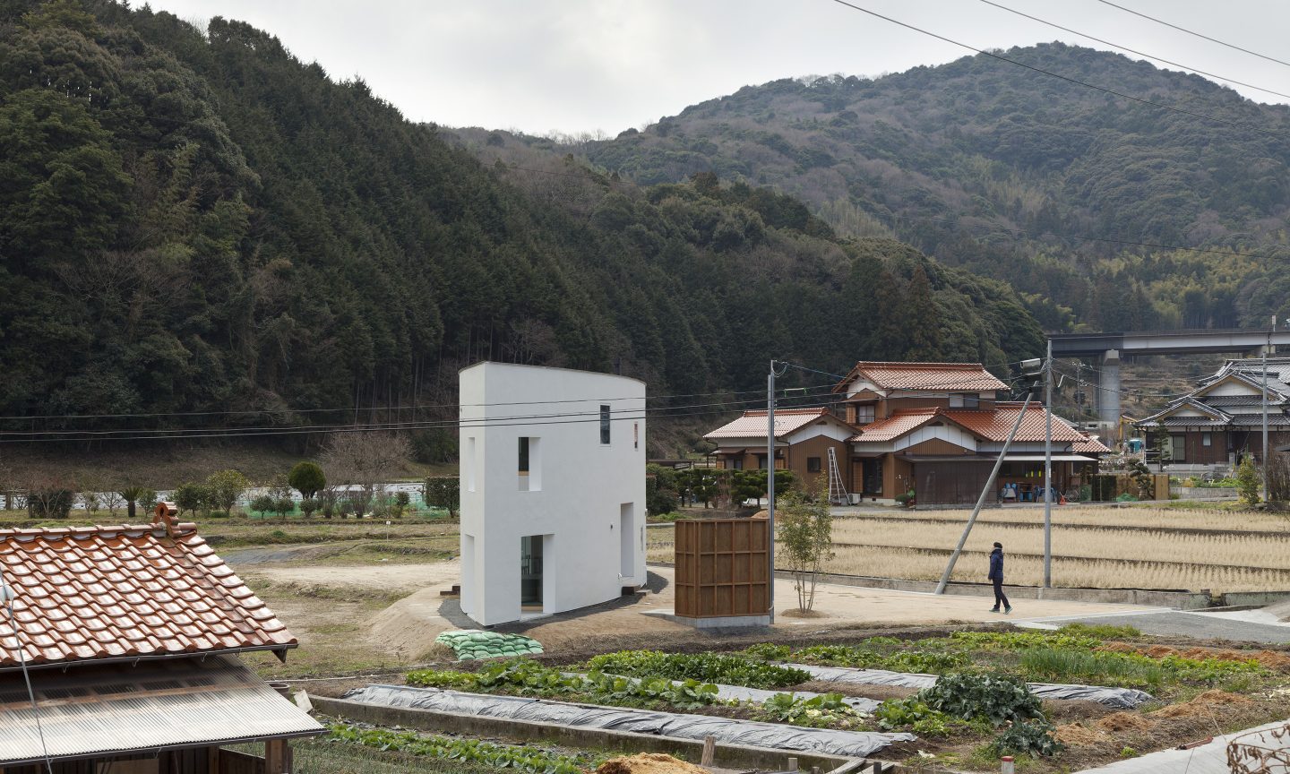 敷地は、山と山に挟まれた谷状の場所に広がる田畑の中に位置します。一見どこまでが敷地で、どこからが隣の敷地なのか見分けのつきにくい場所に対して、壁のような細長いボリュームを可能な限り敷地いっぱいに建てることを考えました。するとたちまち壁のような建築の両側には、性格の違った自然が敷地をとび越えて存在し始めます。壁より道路側には少しパブリックな自然ができ、反対に壁より山側には少しプライベートな自然が出来ることになります。大きな自然の中に壁のような建築を建てることで、ゆるやかに自然を分ける操作です。
