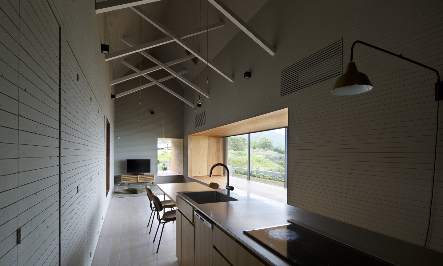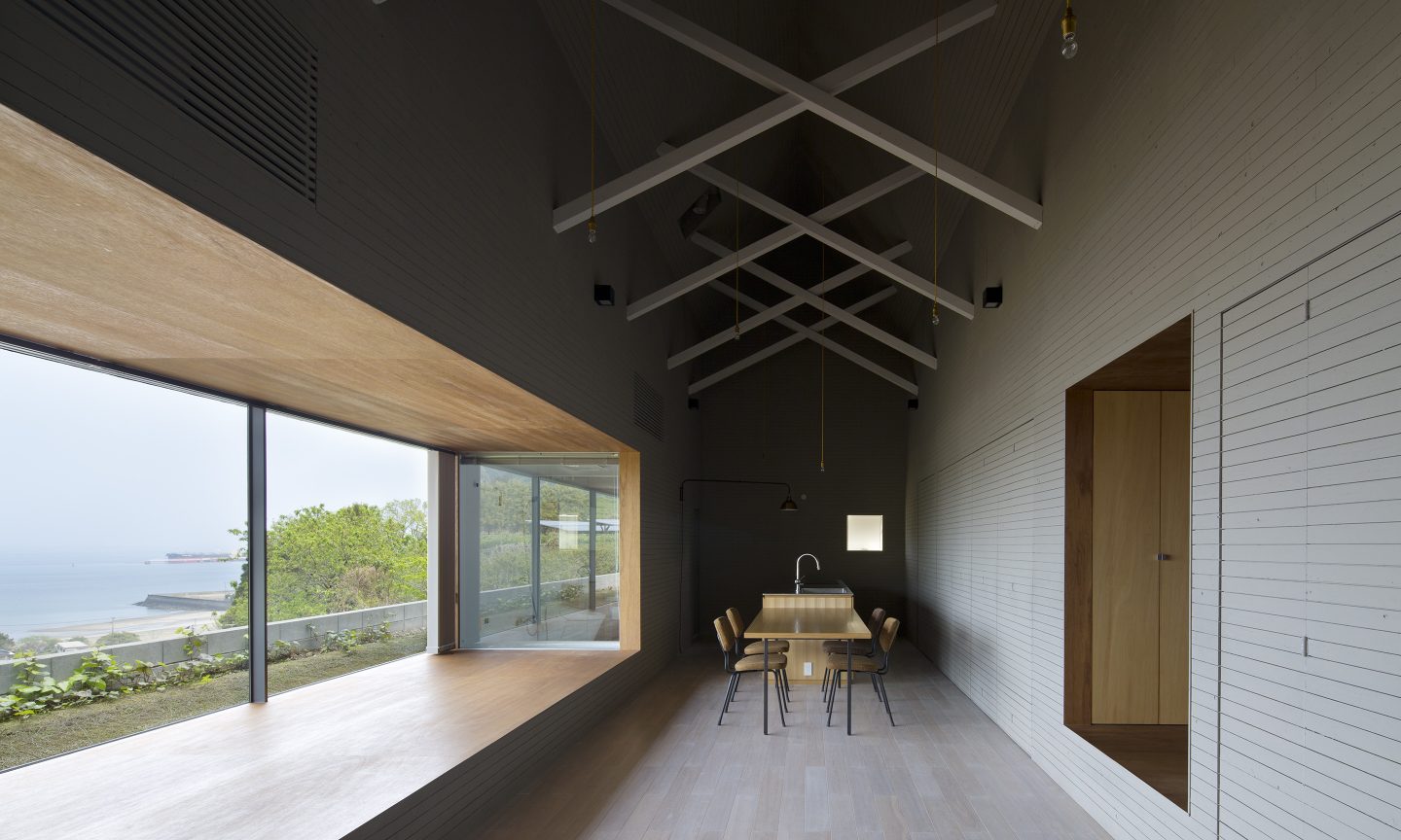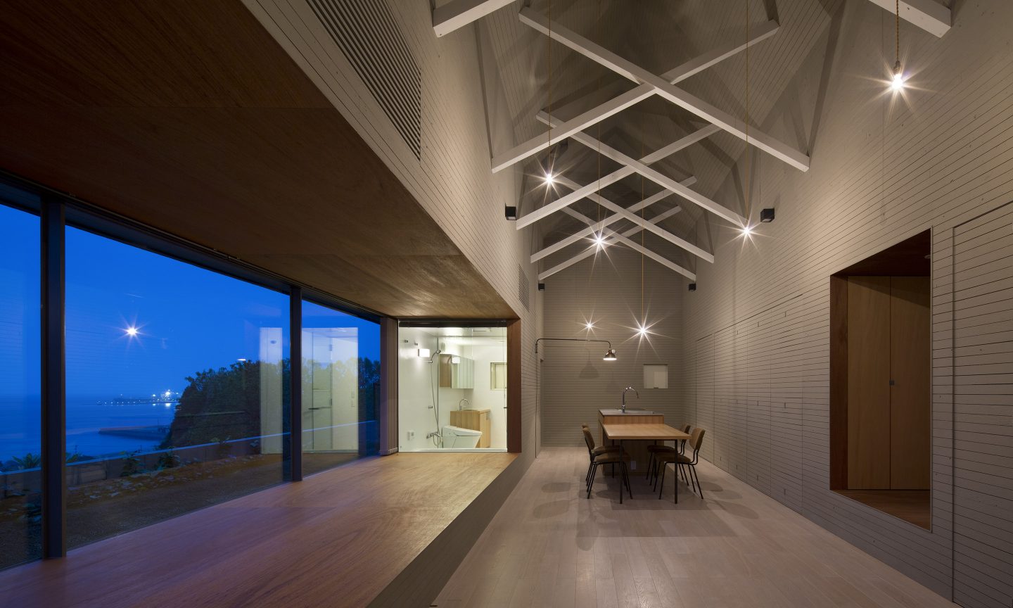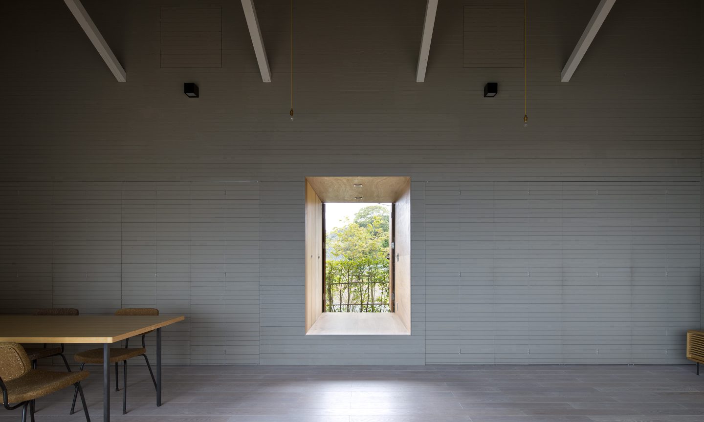 本来、外と中を隔てる壁であった場所に空間が生じることで、内の行為が外に近い場所まで拡し、閉鎖的でありながらも外部を感じる空間をつくりだす。軒を深く出し、内部を少し暗く設計することで、景色が鮮明に浮かびあがり、景色が日常生活とより親密な存在として扱われる。