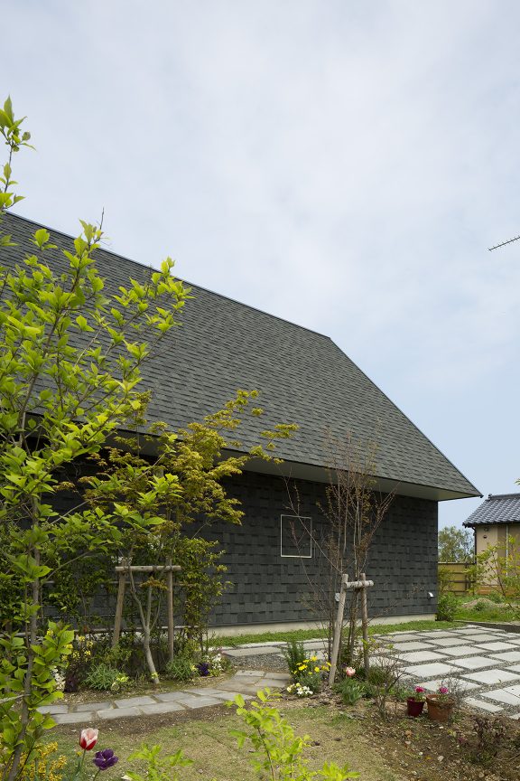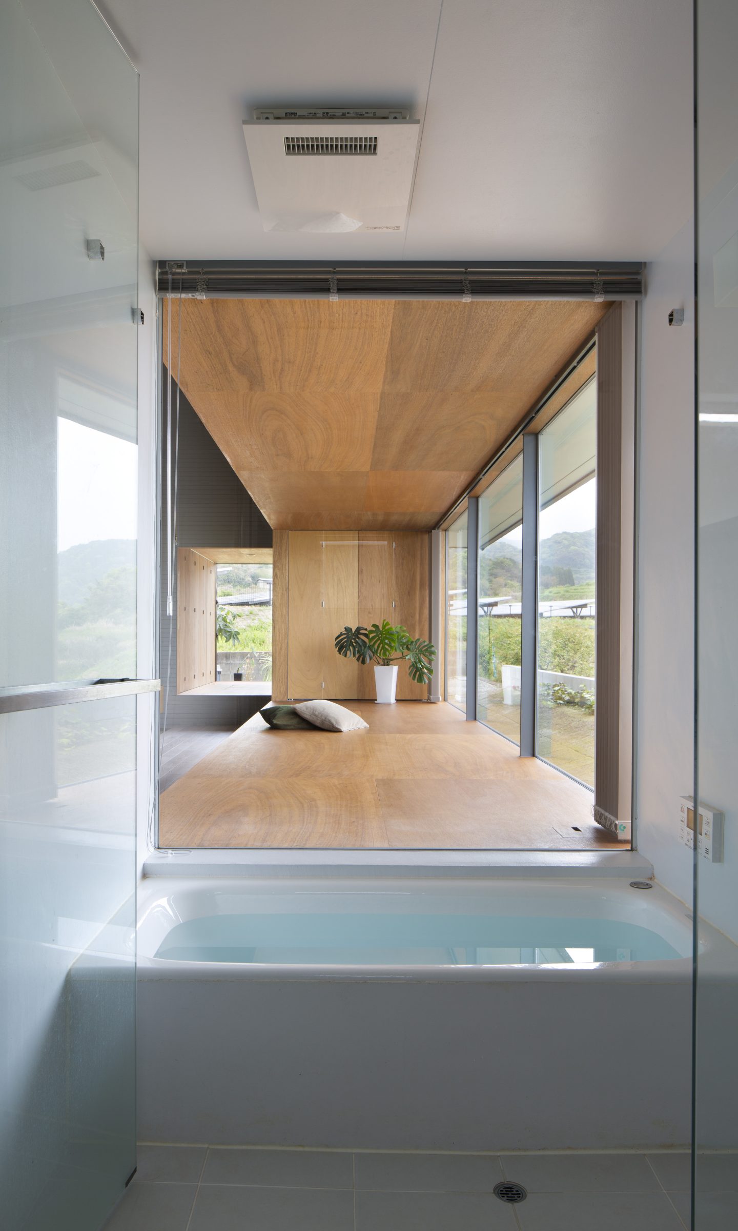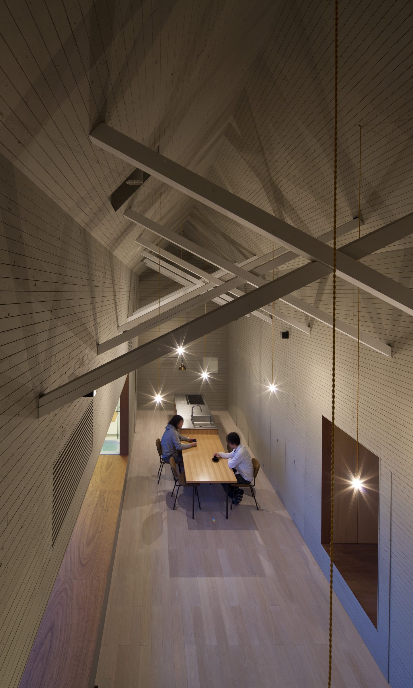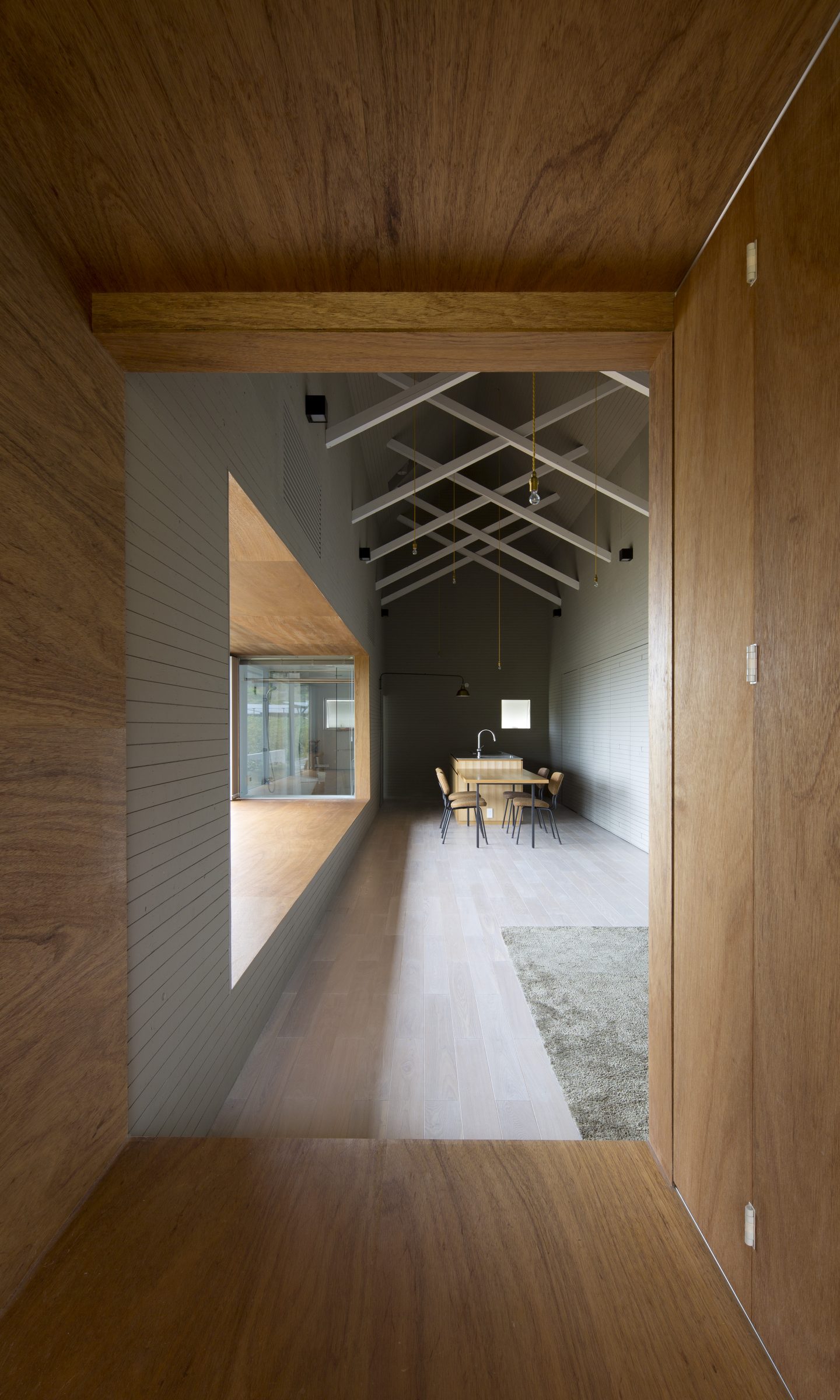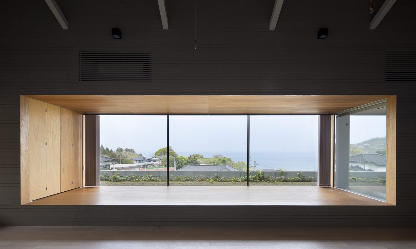 本来、外と中を隔てる壁であった場所に空間が生じることで、内の行為が外に近い場所まで拡し、閉鎖的でありながらも外部を感じる空間をつくりだす。軒を深く出し、内部を少し暗く設計することで、景色が鮮明に浮かびあがり、景色が日常生活とより親密な存在として扱われる。