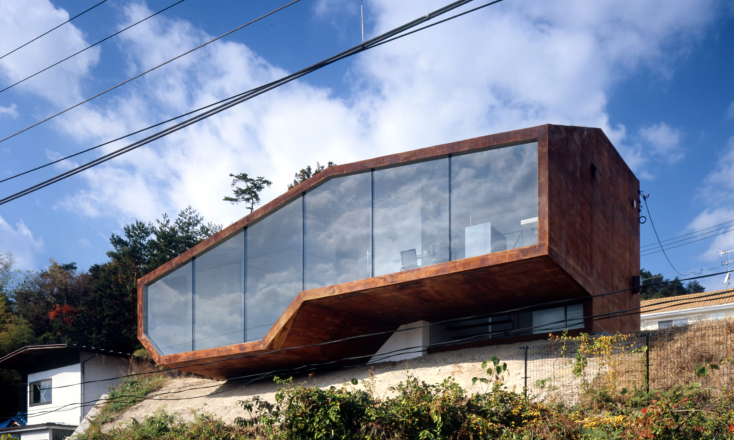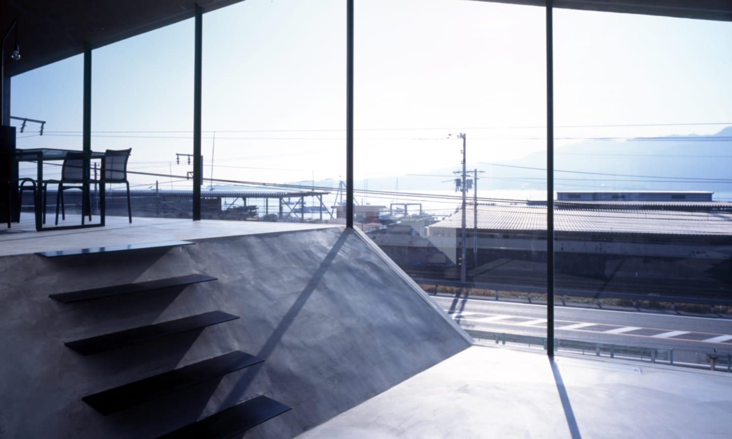 空間は一枚のコンクリートスラブを折り紙のように折ることで、過剰な構造形式を用いることなく、大スパンを飛ばすことや、敷地傾斜部分にスラブをキャンチレバーで出すことなどを可能にし、必要に応じて折るという行為の結果が建物内部にいくつもの床レベルをつくり出し、海との関係を多様にしている。