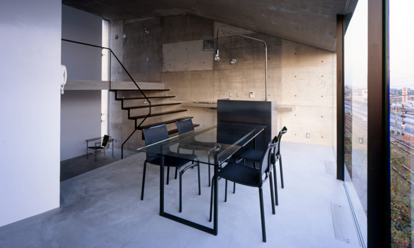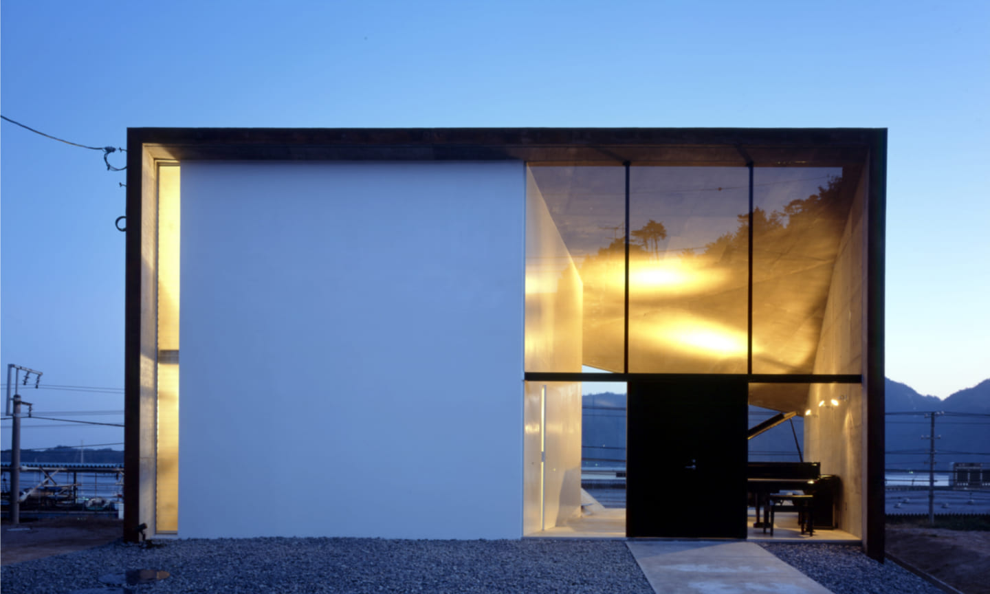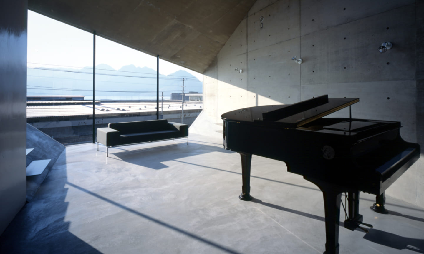 敷地は日本三景の宮島を望む対岸に位置する。南側に交通量の多い幹線道路と線路が走り、騒音のある環境を除いては、視線の向こう側に瀬戸内海が拡がる、恵まれた敷地であった。そこに夫婦ふたりの生活に足るだけの最小限の場と、ピアノを弾くための空間を求められた。
